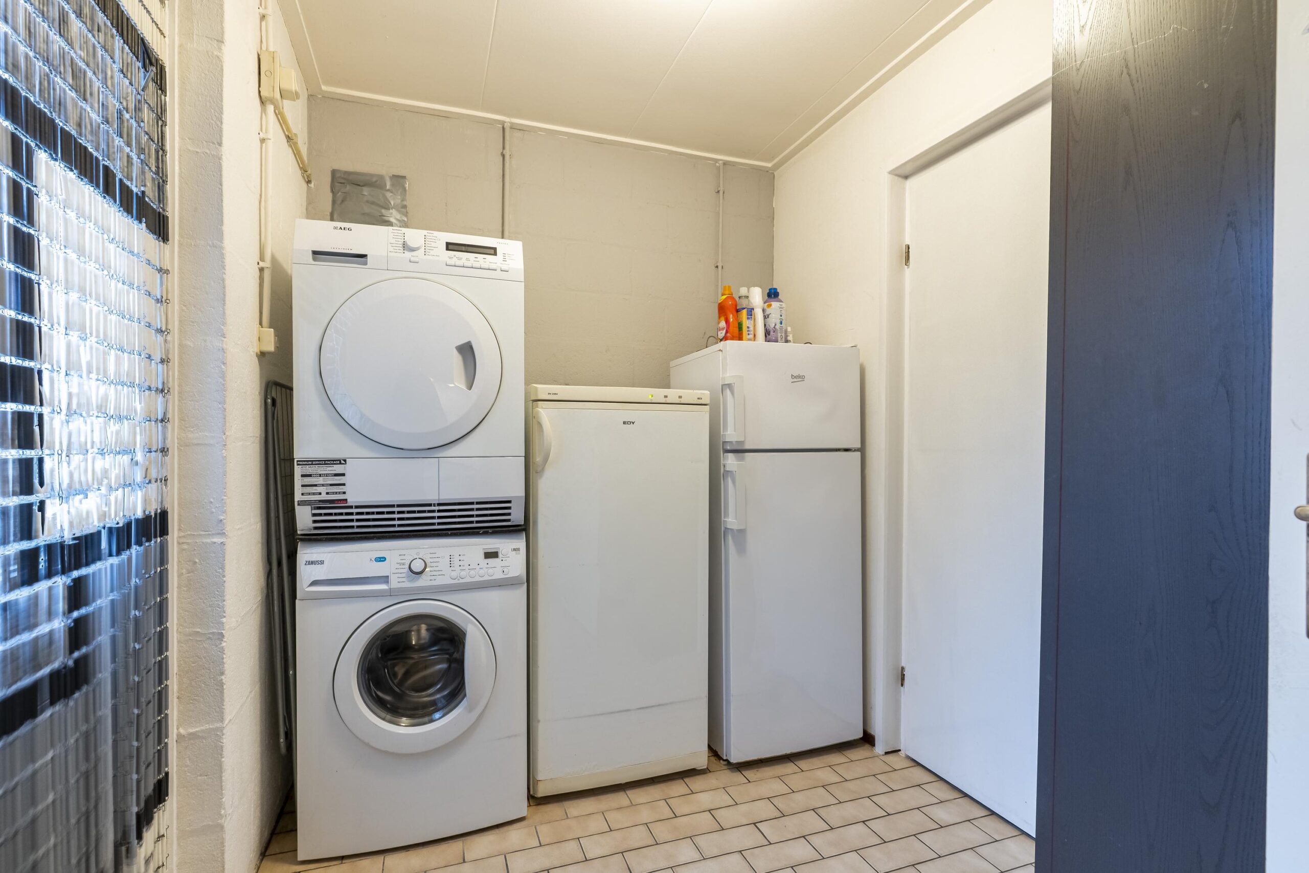 Aangrenzend bevindt zich de ruime bijkeuken met aansluitingen voor wasmachine en droger. Vanuit hier is tevens de inpandig bereikbare garage toegankelijk, uitgerust met een kantelpoort.
