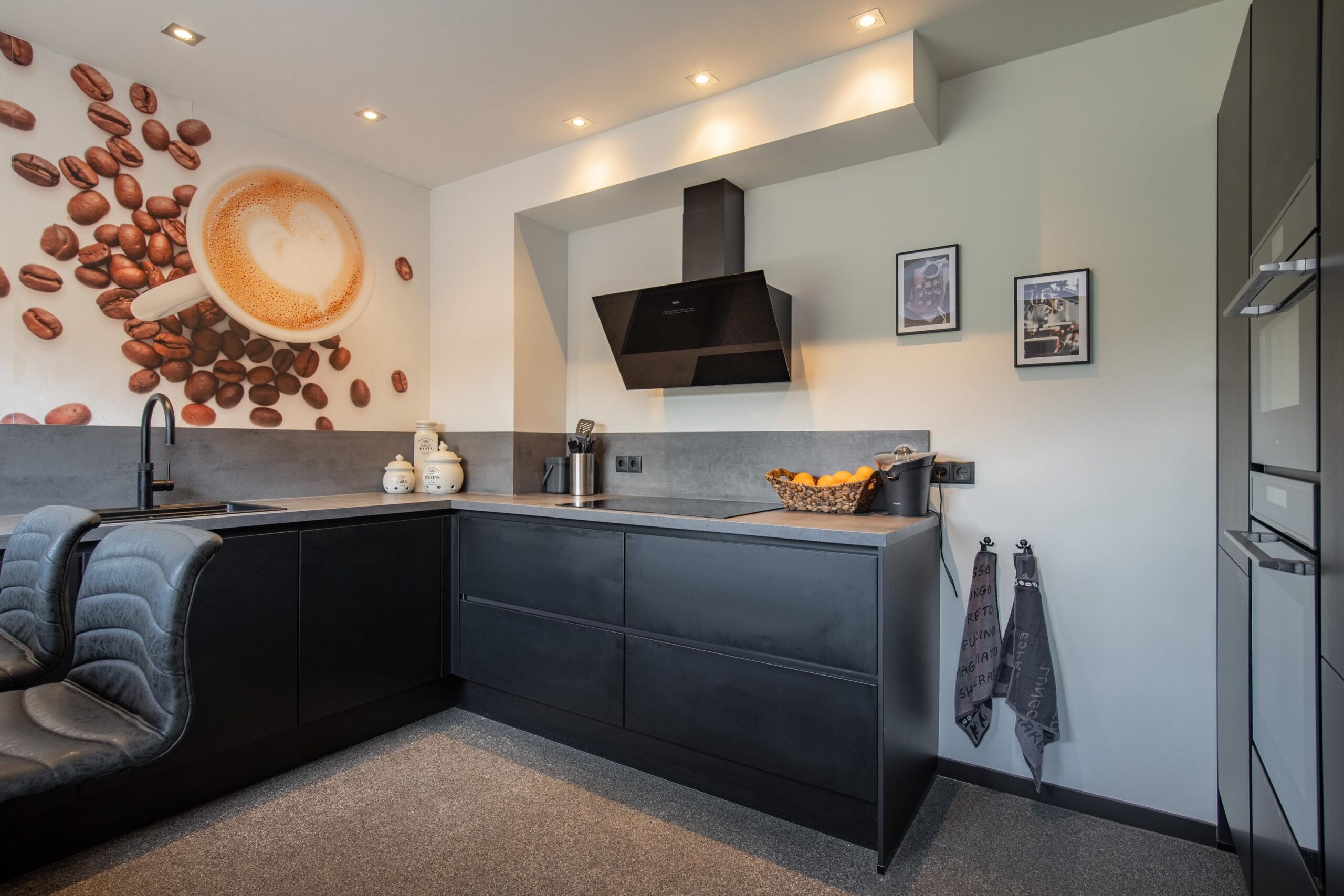 De gesloten keuken (2020) is modern uitgevoerd met een zwarte keukeninstallatie in U-opstelling en een geïntegreerde eetbar. De keuken is uitgerust met diverse hoogwaardige inbouwapparatuur, waaronder: inductiekookplaat, design afzuigkap, combimagnetron, oven, vaatwasser, Quooker, koelkast en diepvries. Daarnaast beschikt de keuken over een designradiator, een verlaagd plafond met ingebouwde LED-verlichting en een siergrindvloer.