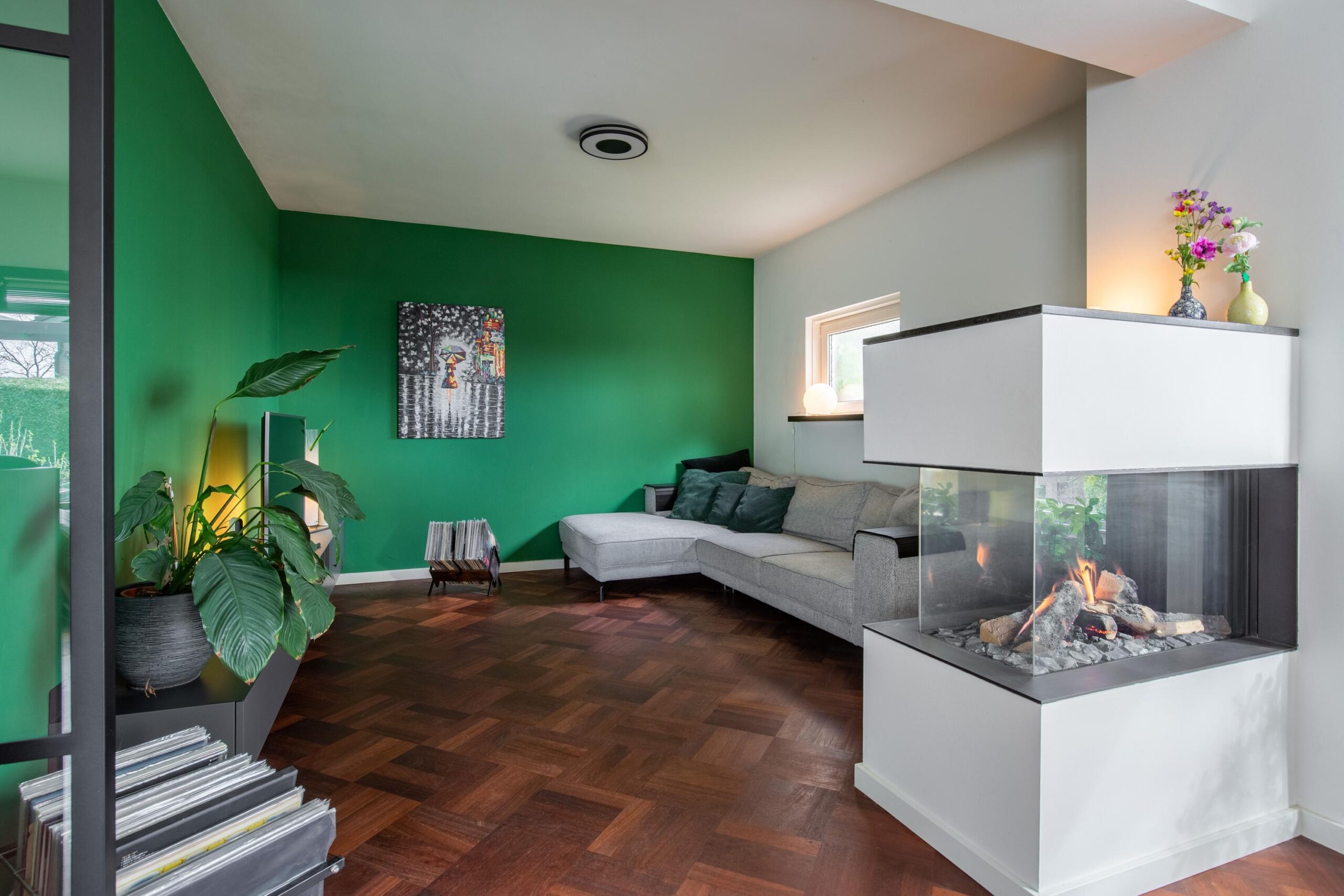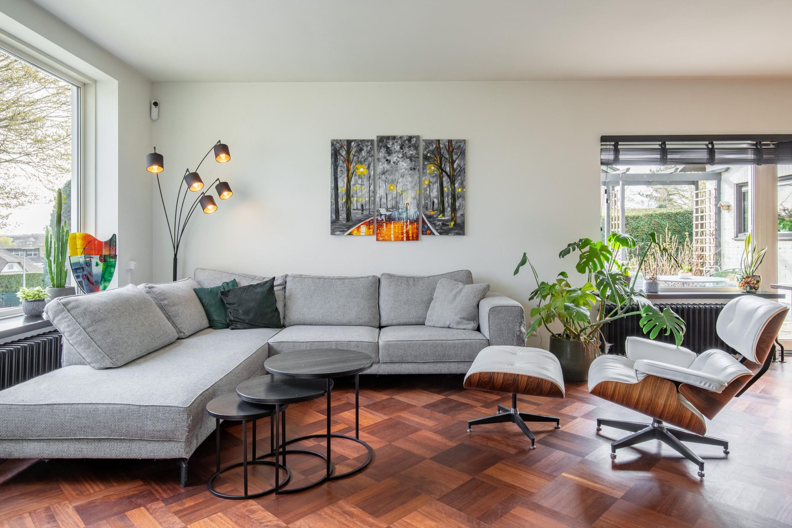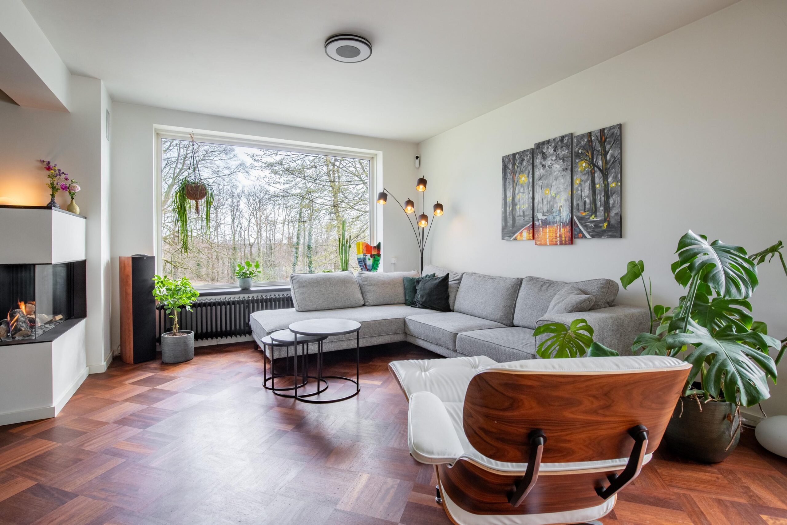 Vanuit de hal geeft een fraaie stalen/glazen deur toegang tot de L-vormige living. Deze sfeervolle woonruimte biedt een prachtig uitzicht op het Eikenbos en profiteert van een uitstekende lichtinval. De woonkamer beschikt over een comfortabele televisiehoek met een stijlvolle roomdivider-gashaard.