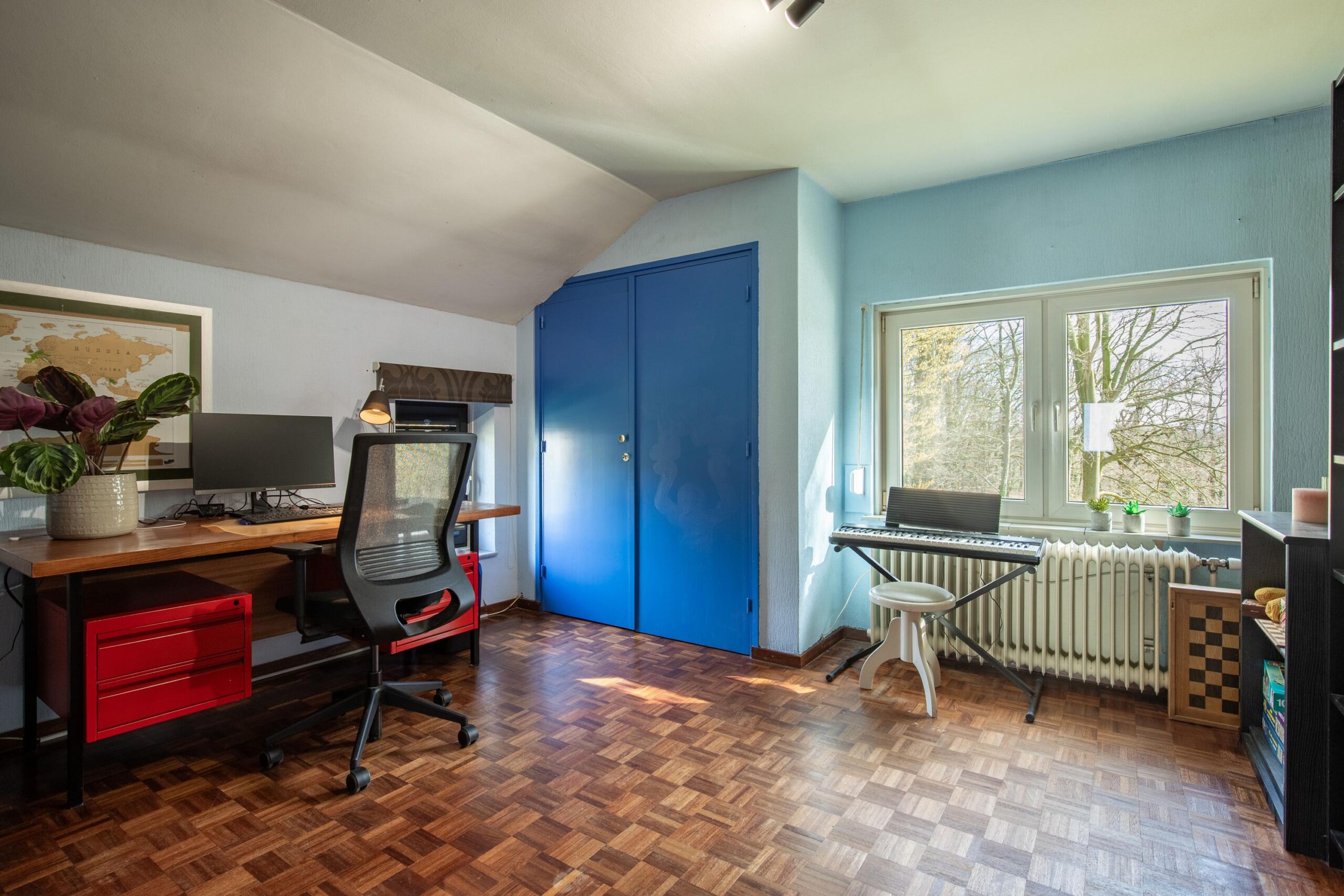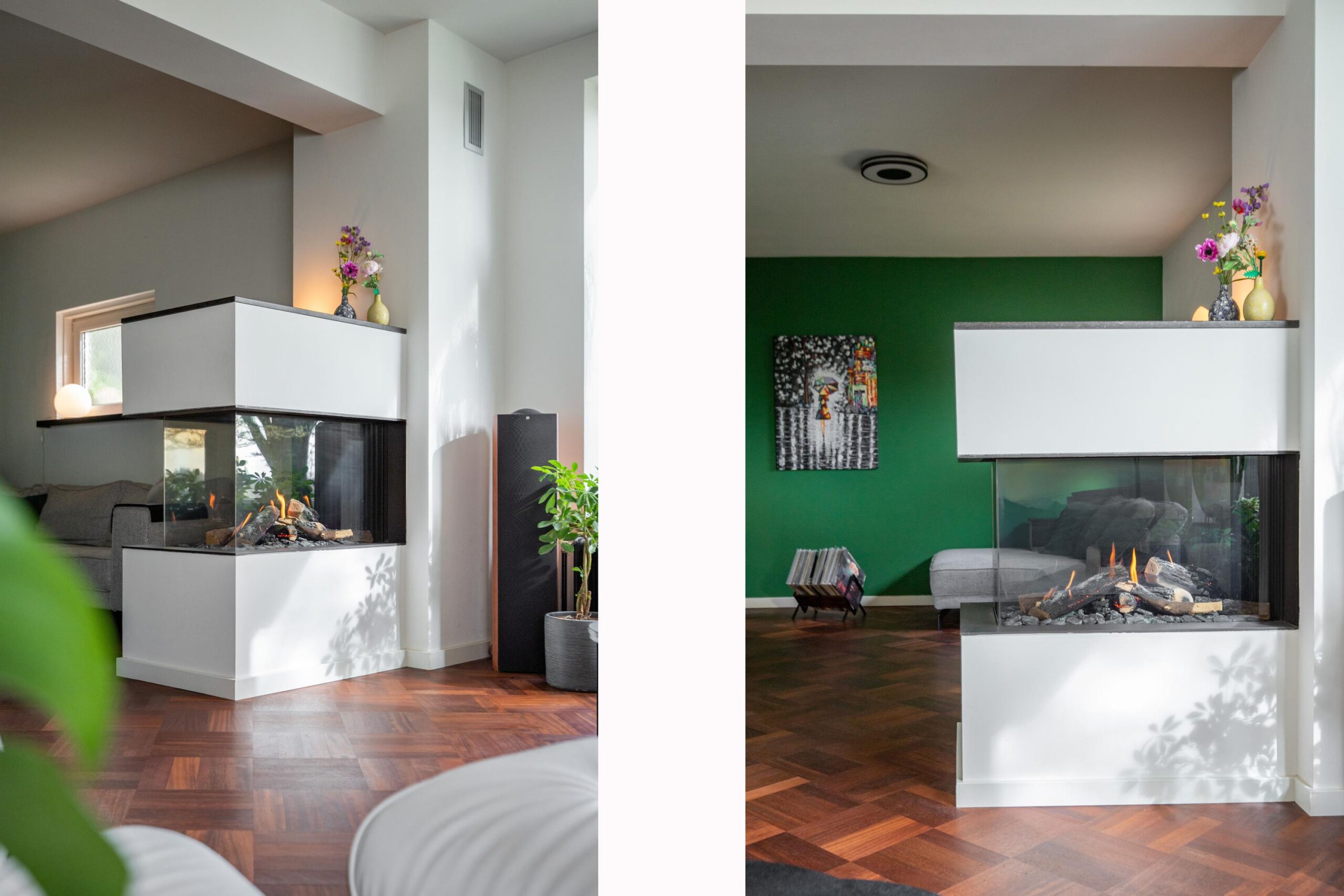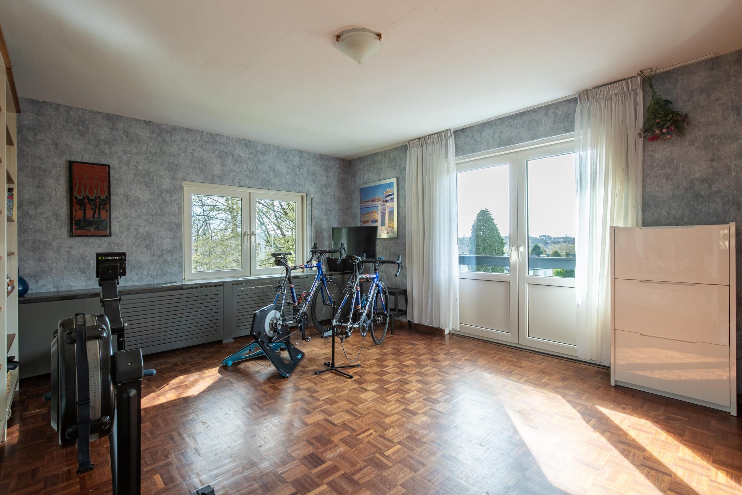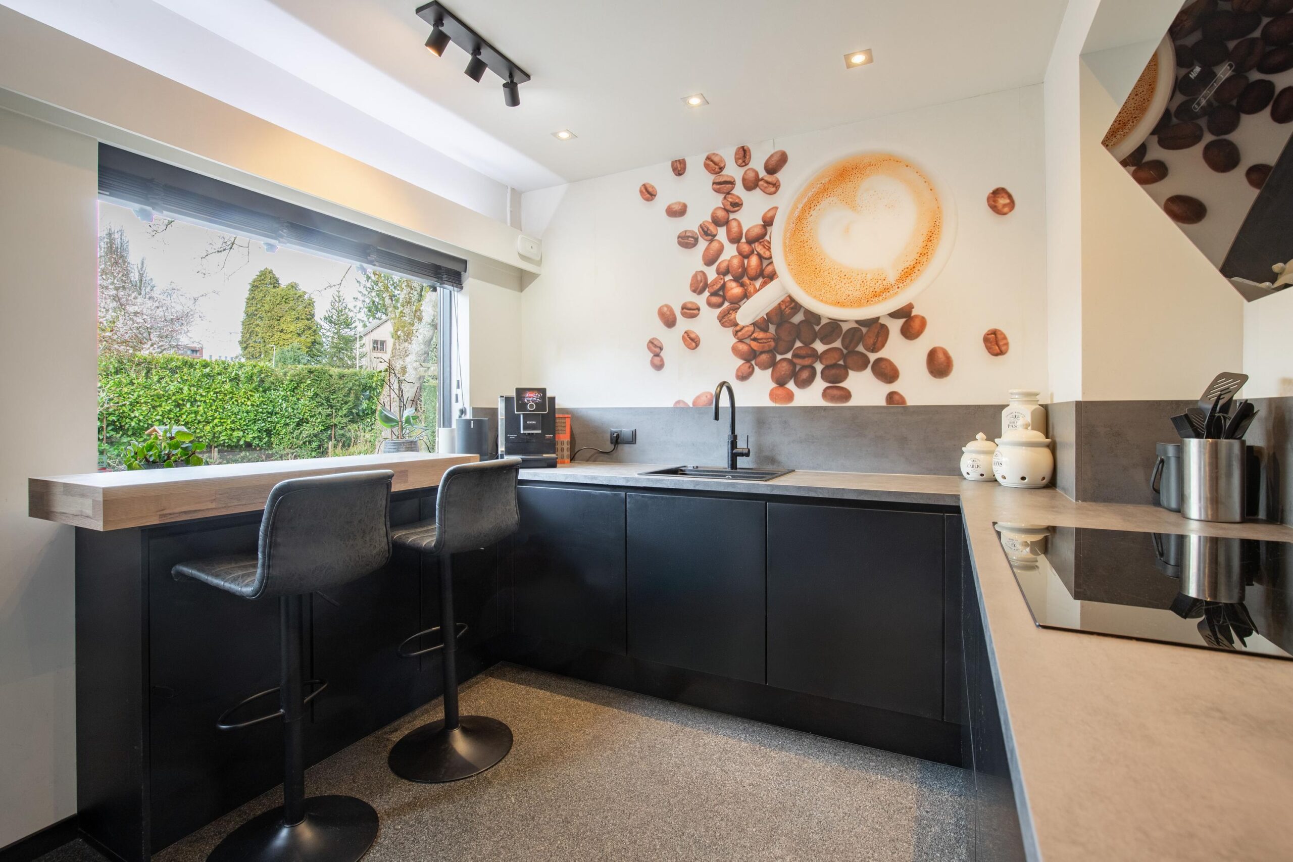 Vanuit de hal geeft een fraaie stalen/glazen deur toegang tot de L-vormige living. Deze sfeervolle woonruimte biedt een prachtig uitzicht op het Eikenbos en profiteert van een uitstekende lichtinval. De woonkamer beschikt over een comfortabele televisiehoek met een stijlvolle roomdivider-gashaard.