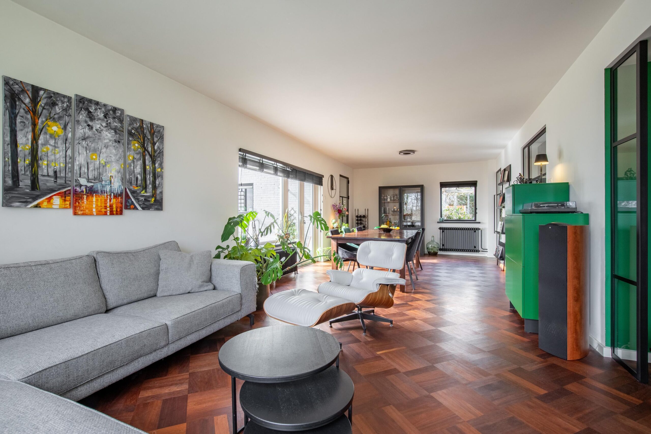 De ruime eetkamer heeft dubbele openslaande deuren naar het terras, waardoor binnen en buiten mooi in elkaar overlopen. De living is afgewerkt met een fraaie hardhouten parketvloer en strak gestucte wanden.