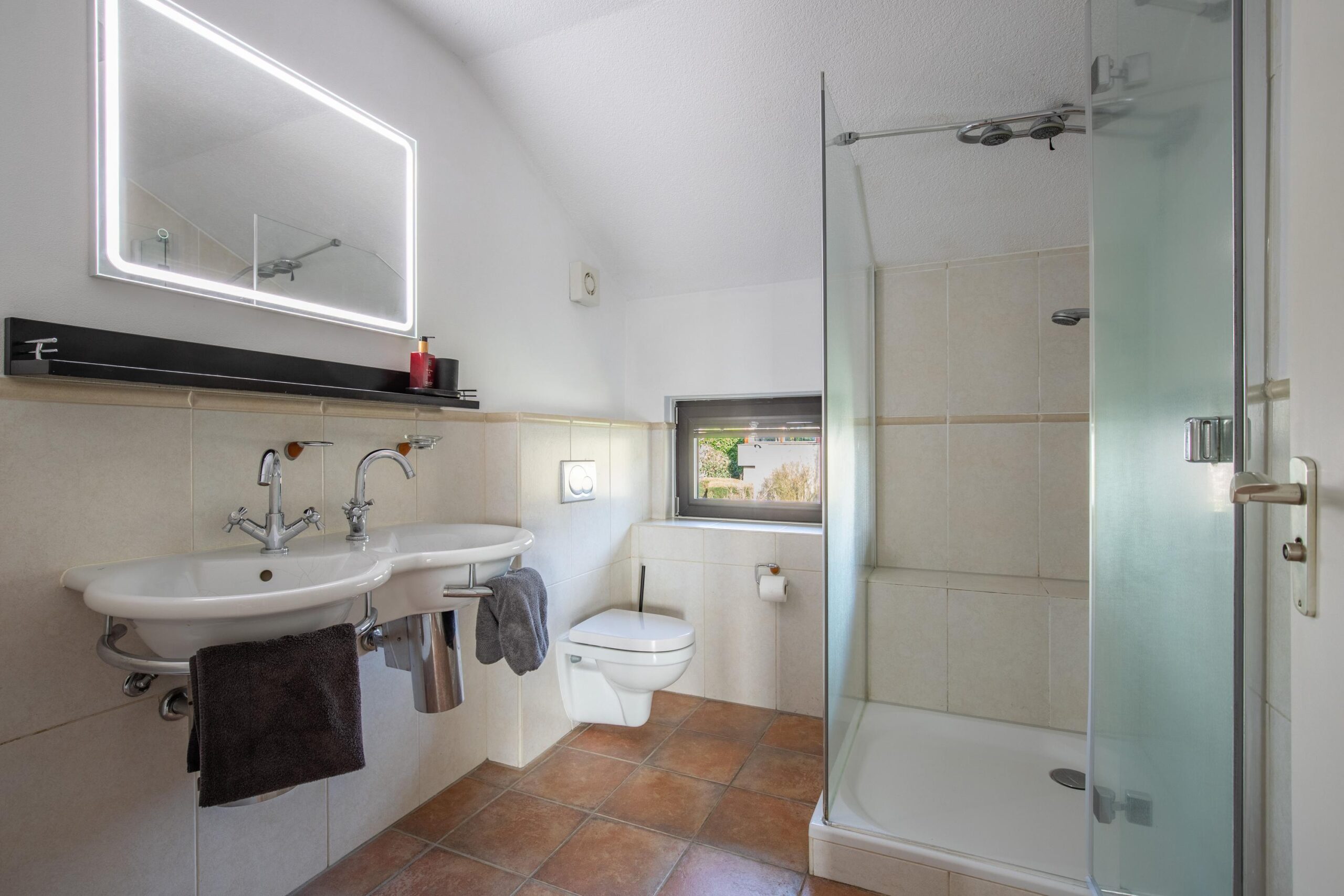 De betegelde badkamer is uitgerust met een tweede vrijhangend toilet, dubbele wastafel en een douche met hardglazen douchedeuren.