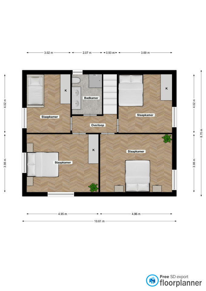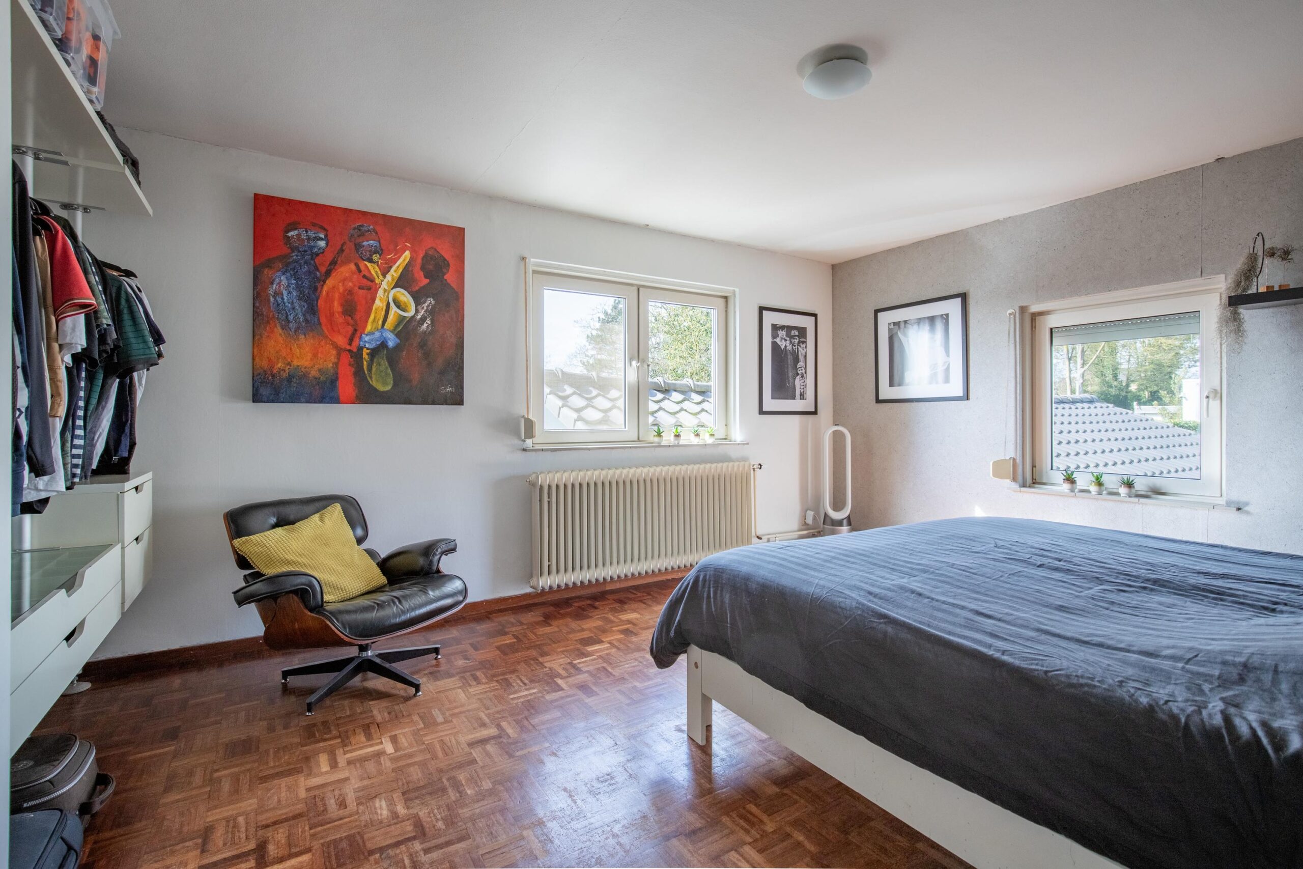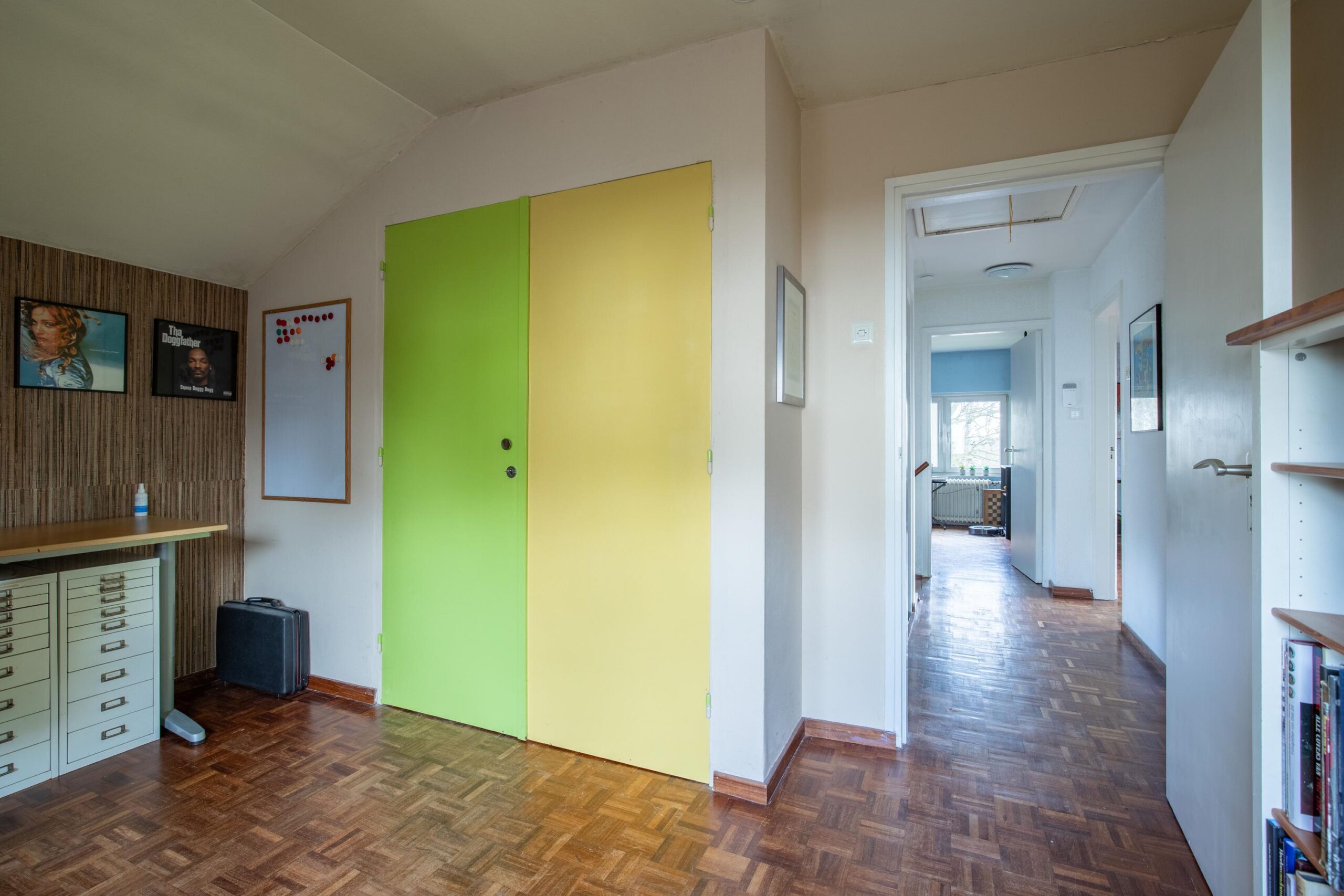 De overloop geeft toegang tot vier royale slaapkamers, allen voorzien van massieve parketvloeren. Drie slaapkamers beschikken over een dubbele inbouwkast. De slaapkamer aan de achterzijde heeft dubbele deuren naar een balkon met een panoramisch uitzicht op de groene omgeving. De slaapkamers zijn respectievelijk groot: