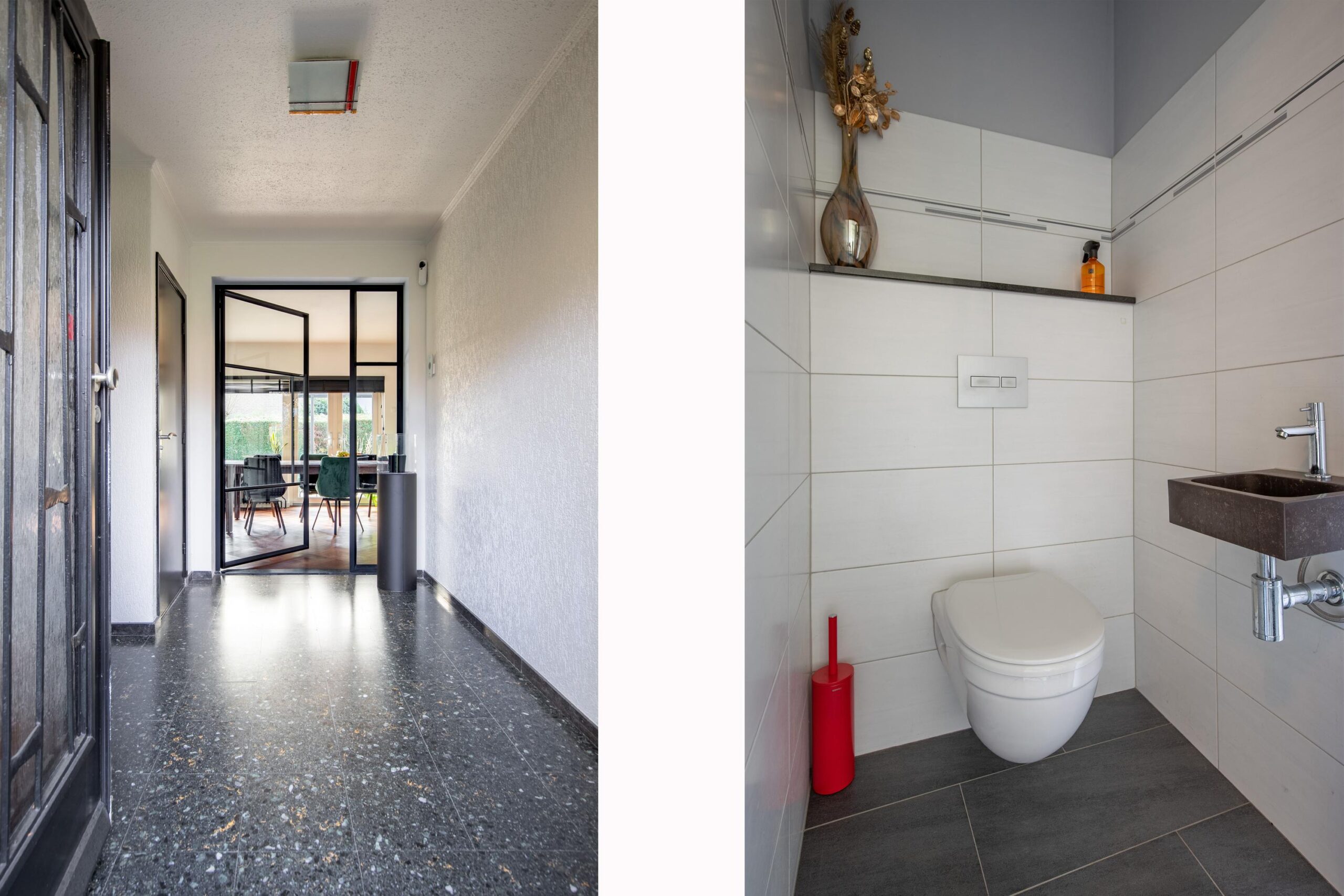 Via de royale voortuin bereikt u de entree van de woning. De ruime ontvangsthal is voorzien van een hardhouten trap naar de verdieping en een modern betegeld vrijhangend toilet met fontein.