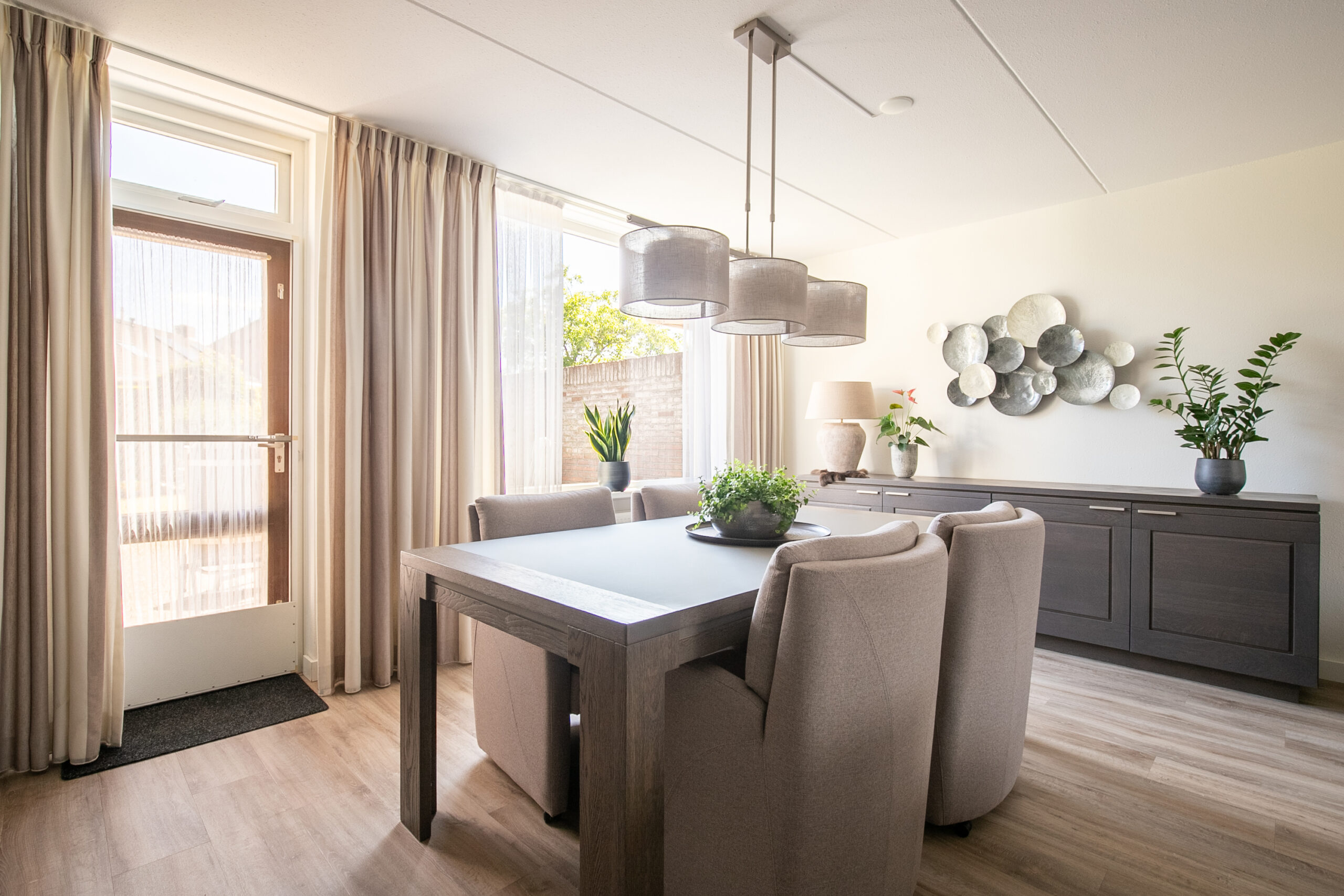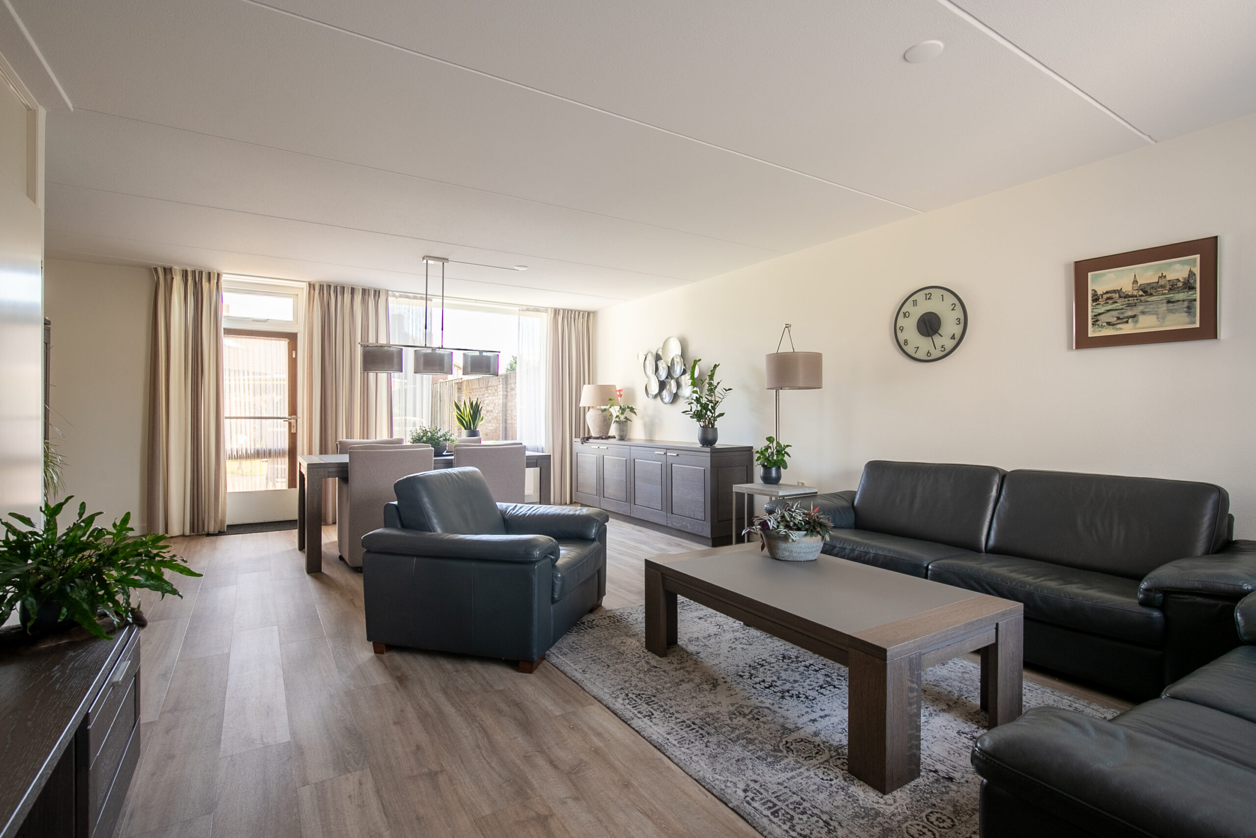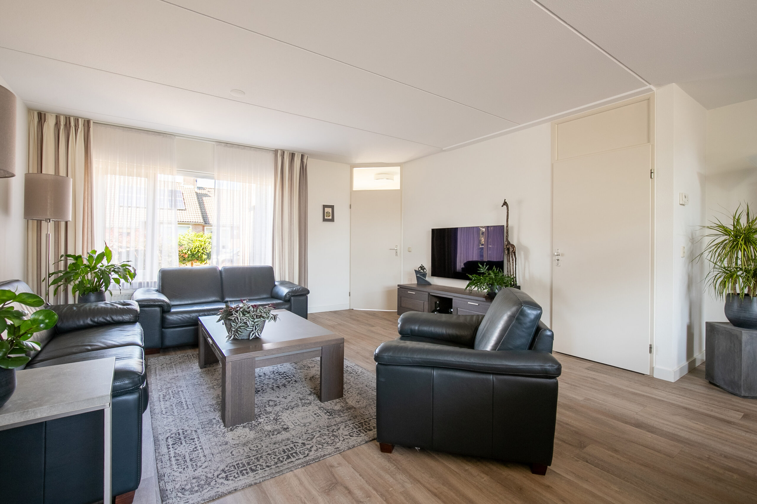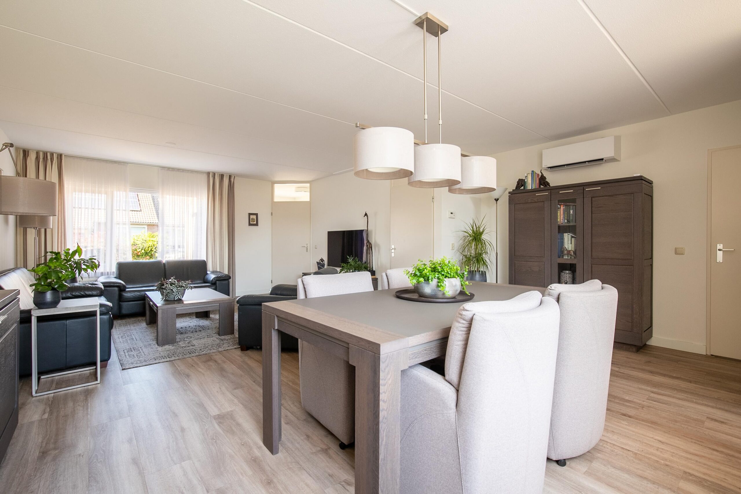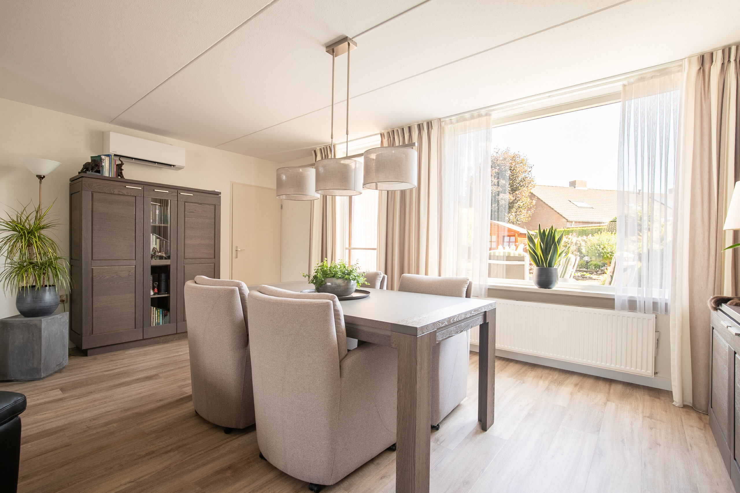 De ruime, lichte woonkamer (circa 38 m2) heeft een knusse sfeer en veel lichtinval door de grote raampartijen. Dit zorgt tevens voor optimaal tuincontact. De woning is volledig ingericht naar de hedendaagse wensen. De woonkamer is voorzien van een nieuwe pvc vloer en airco-installatie. De gesloten keuken (circa 11 m2) is in 2021 vernieuwd en eveneens voorzien van dezelfde doorlopende moderne pvc vloer en tevens een airco-installatie. Het betreft een hoekkeuken met de navolgende installaties zoals een inductiekookplaat, afzuiging, combi-oven, vaatwasser, spoelbak, koelkast en diverse opbergkastjes en lades. Vanuit de keuken is er tevens toegang tot de achtertuin. Praktische bijkeuken met aansluitpunten voor het witgoed en inpandig bereikbare garage (circa 19 m2) voorzien van openslaande deuren naar de oprit en middels een zijdeur toegang tot de tuin en tevens zij-ingang om achterom te komen. Zeer praktisch voor gezinnen met naar schoolgaande kinderen of om vanuit de auto boodschappen of andere spullen binnen te dragen. Daarnaast is er vanuit de garage ook weer toegang tot de hal van de woning. In de hal, woonkamer, keuken en bijkeuken loopt de nieuwe pvc vloer dorpelvrij door.