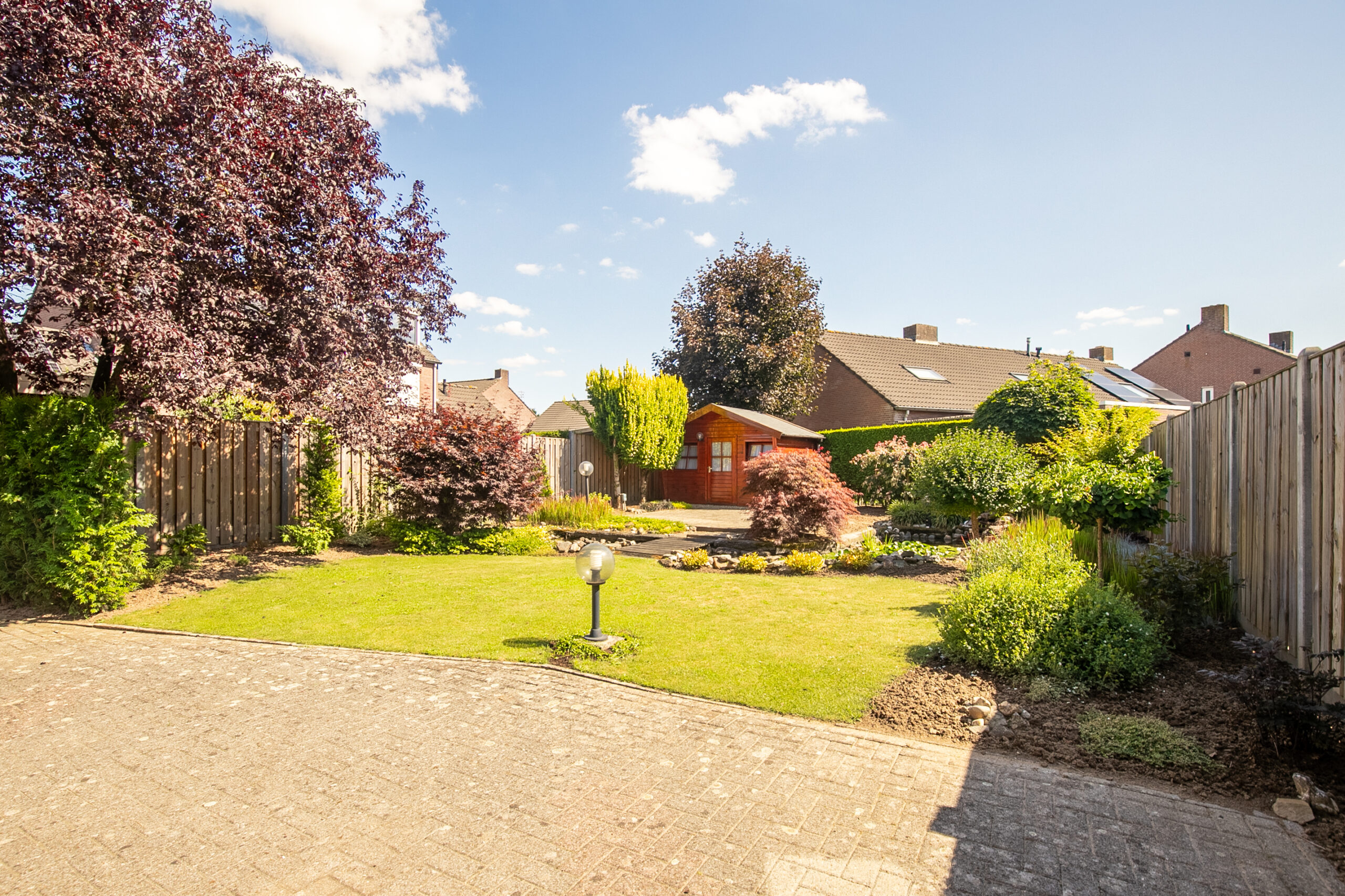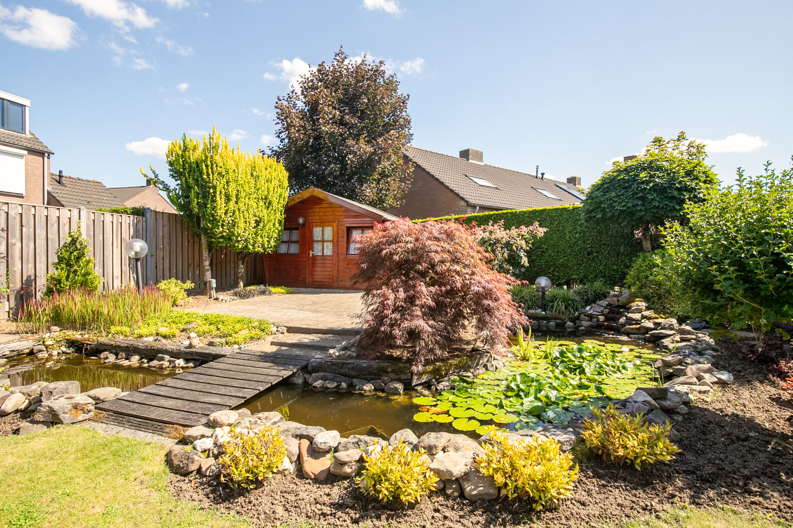 Deze woning beschikt over een ruime en mooi aangelegde achtertuin. Met een zuidelijke oriëntatie is een zonnige tuin gegarandeerd! Door de grootte van de tuin is er altijd wel een plekje in of uit de zon te vinden. De tuin is voorzien van een terras met elektrisch zonnescherm, gazon, borders met verschillende beplantingen, tuinverlichting, een vijver en een groot tuinhuis welke ideaal geschikt is voor opslag. Groot voordeel is dat de woning beschikt over een vrije achterom waar je middels een poortje aan de voorkant de verbinding hebt tussen de voortuin en de achtertuin. Zo is er een perfecte verbinding naar de oprit toe en kun je vanuit hier via een zijdeur van de garage gemakkelijk toegang krijgen tot de garage. Aan de voorzijde is een ruime oprit aanwezig alwaar plek is voor 2 auto’s en is de tuin ook mooi aangelegd met verschillende beplantingen.