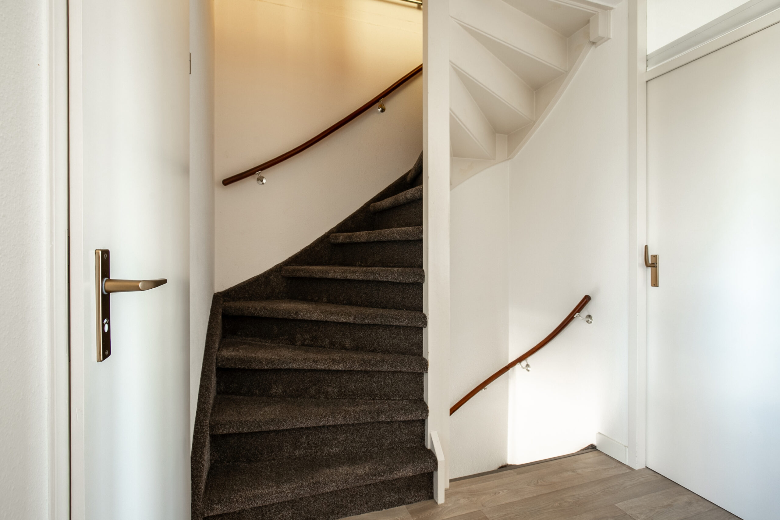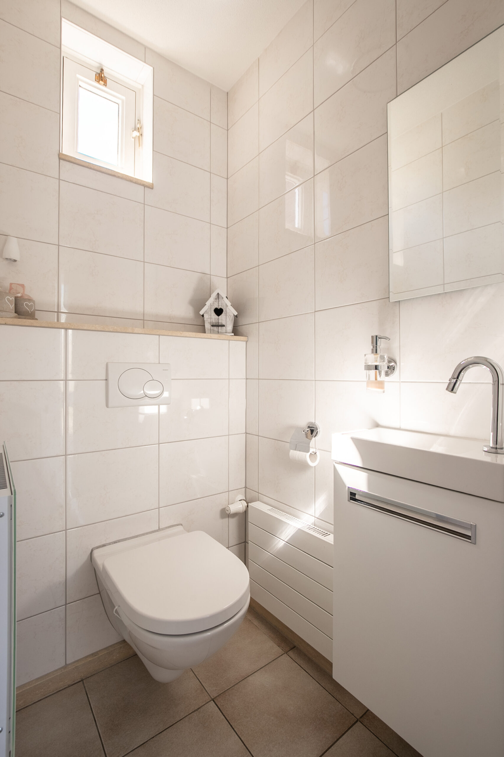 Hal/entree voorzien van een moderne pvc vloer met vernieuwde meterkast, nieuw beklede trapopgang naar eerste verdieping en toegang tot woonkamer, garage en toilet. Betegelde toiletruimte met zwevend closet, fonteintje en elektrische verwarming.