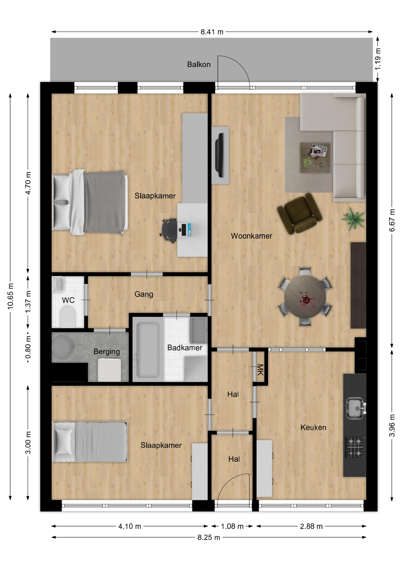 De woning beschikt over twee ruime slaapkamers. De hoofdslaapkamer (ca. 19 m²) is gelegen aan de balkonzijde, terwijl de tweede slaapkamer (ca. 12 m²) aan de galerijzijde ligt. Beide kamers zijn licht en functioneel ingedeeld. De badkamer (ca. 4 m²) is uitgerust met een bad, douche en wastafel. Daarnaast is er een separate toiletruimte met fonteintje en een aparte berging met aansluitingen voor wasmachine en droger, evenals de opstelling van de boiler.