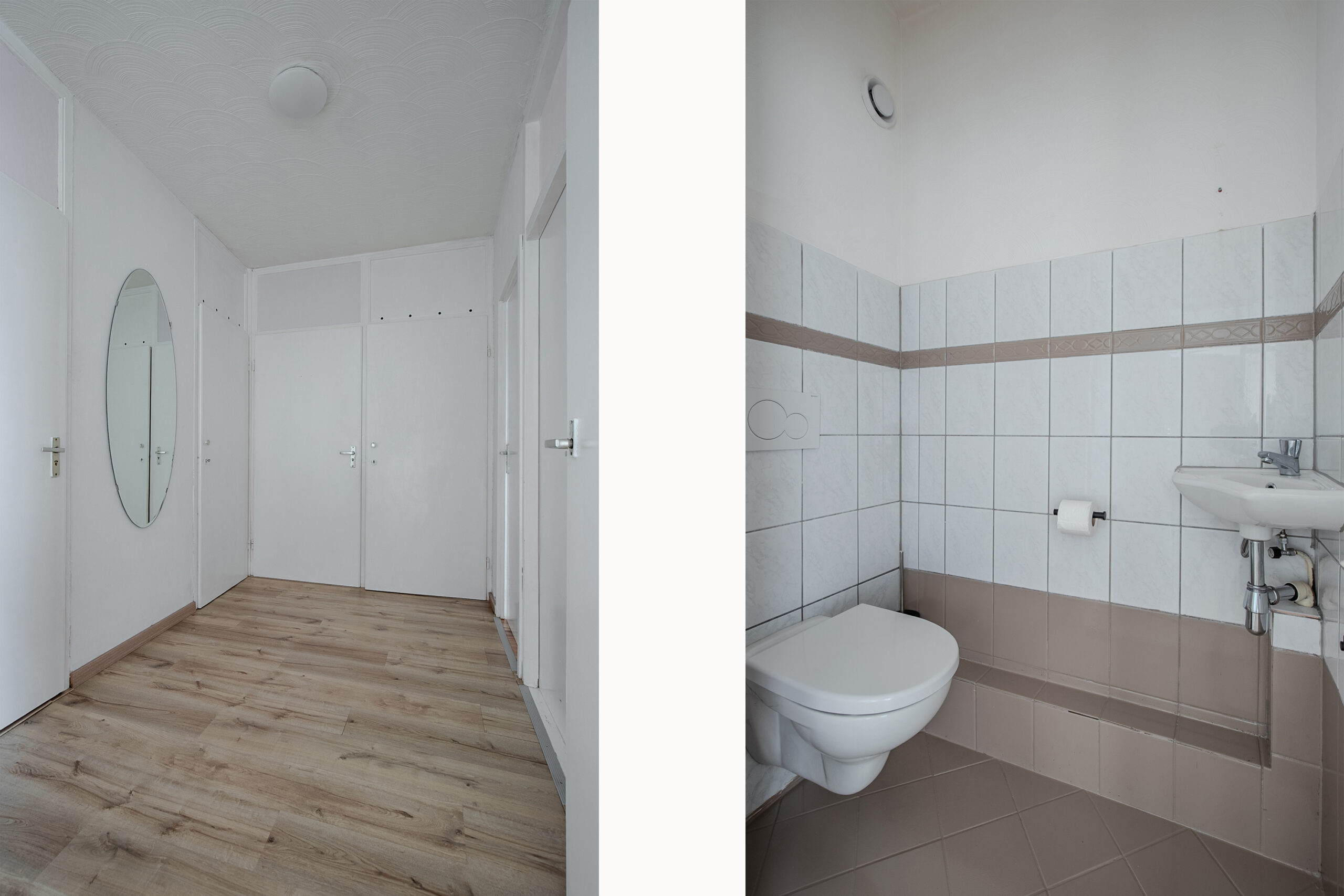 De badkamer is uitgerust met een douche en wastafel. Daarnaast is er een separate toiletruimte met fonteintje en een praktische berging met aansluitingen voor het witgoed en de opstelplaats van de boiler. In het appartement is bovendien een extra bergkast aanwezig.