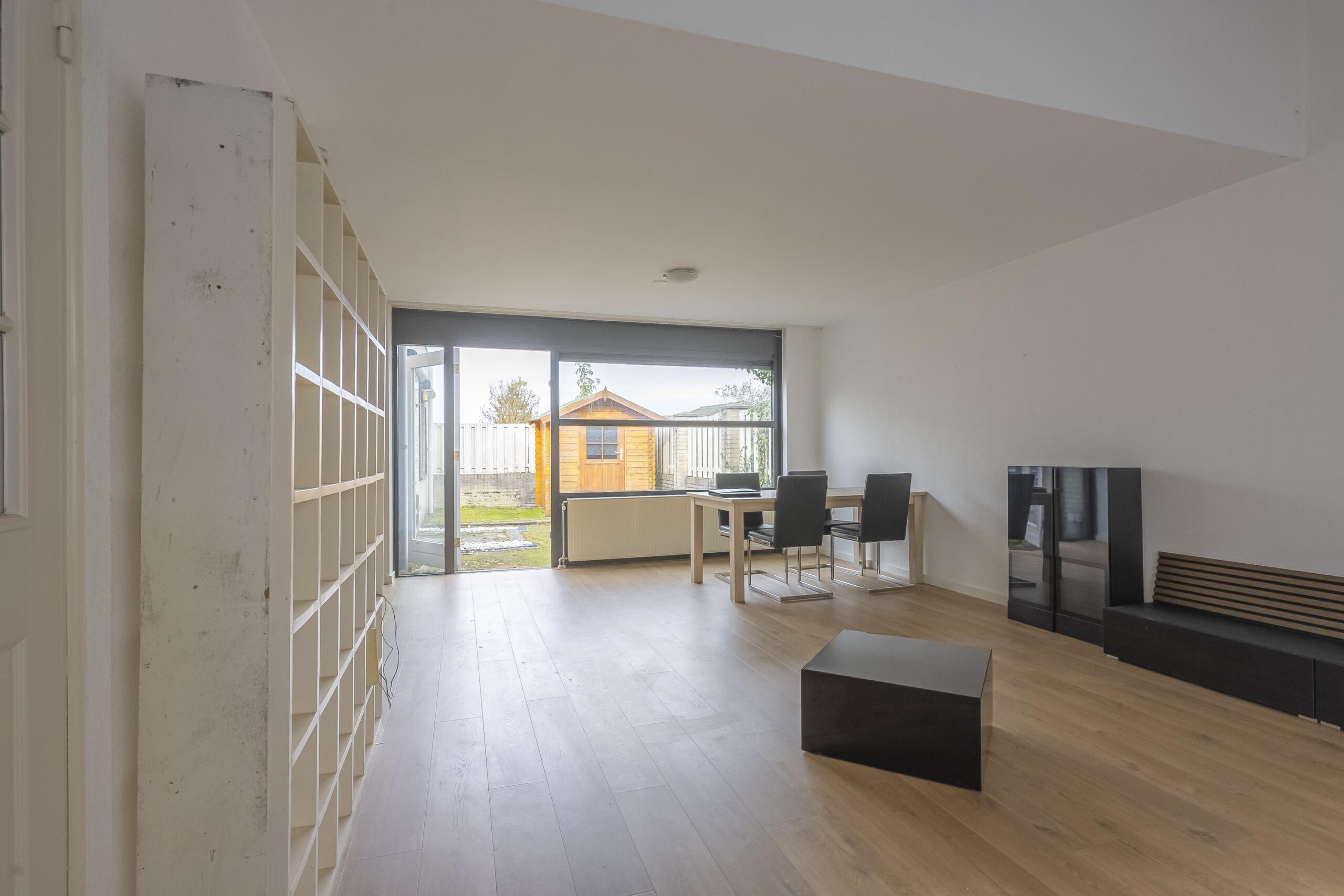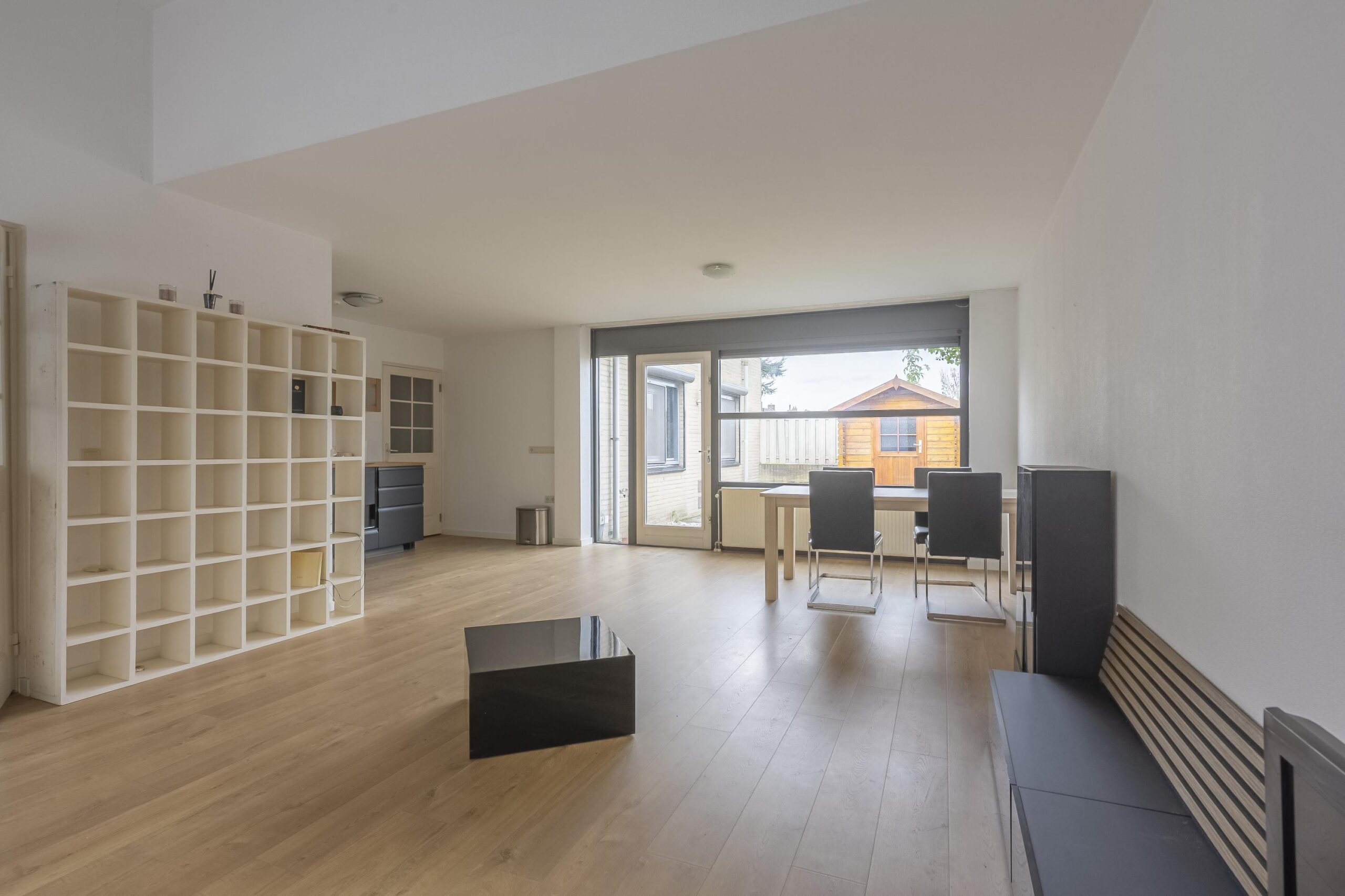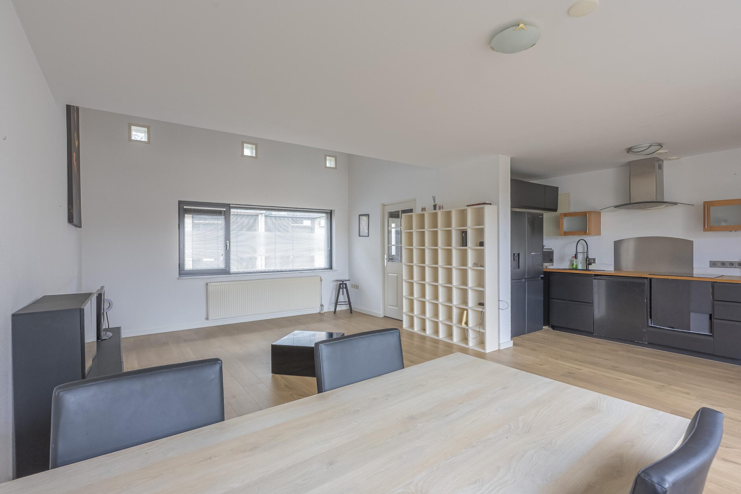 Ruime woonkamer met laminaatvloer. Open keuken inclusief navolgende apparatuur: koel- vriescombinatie,