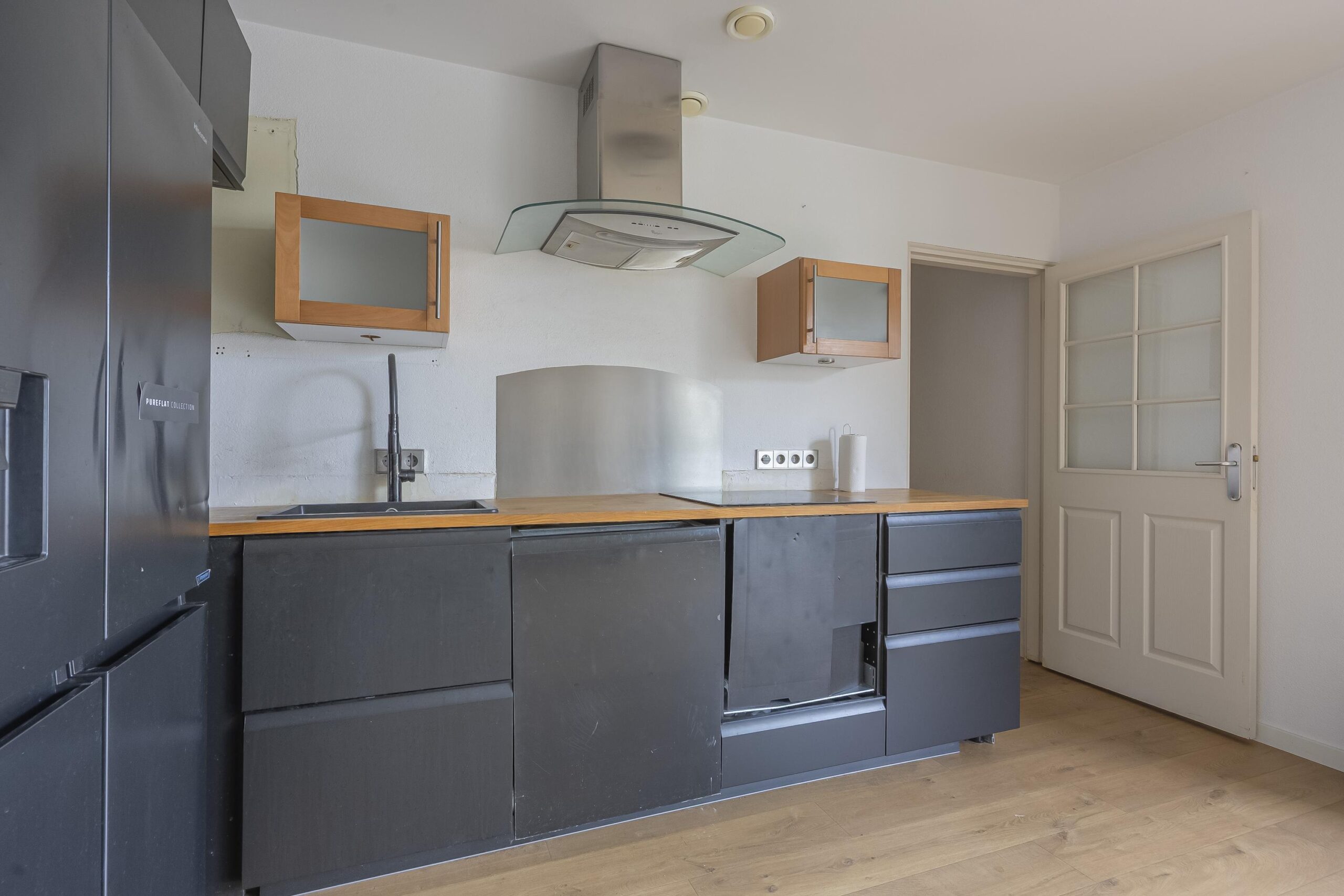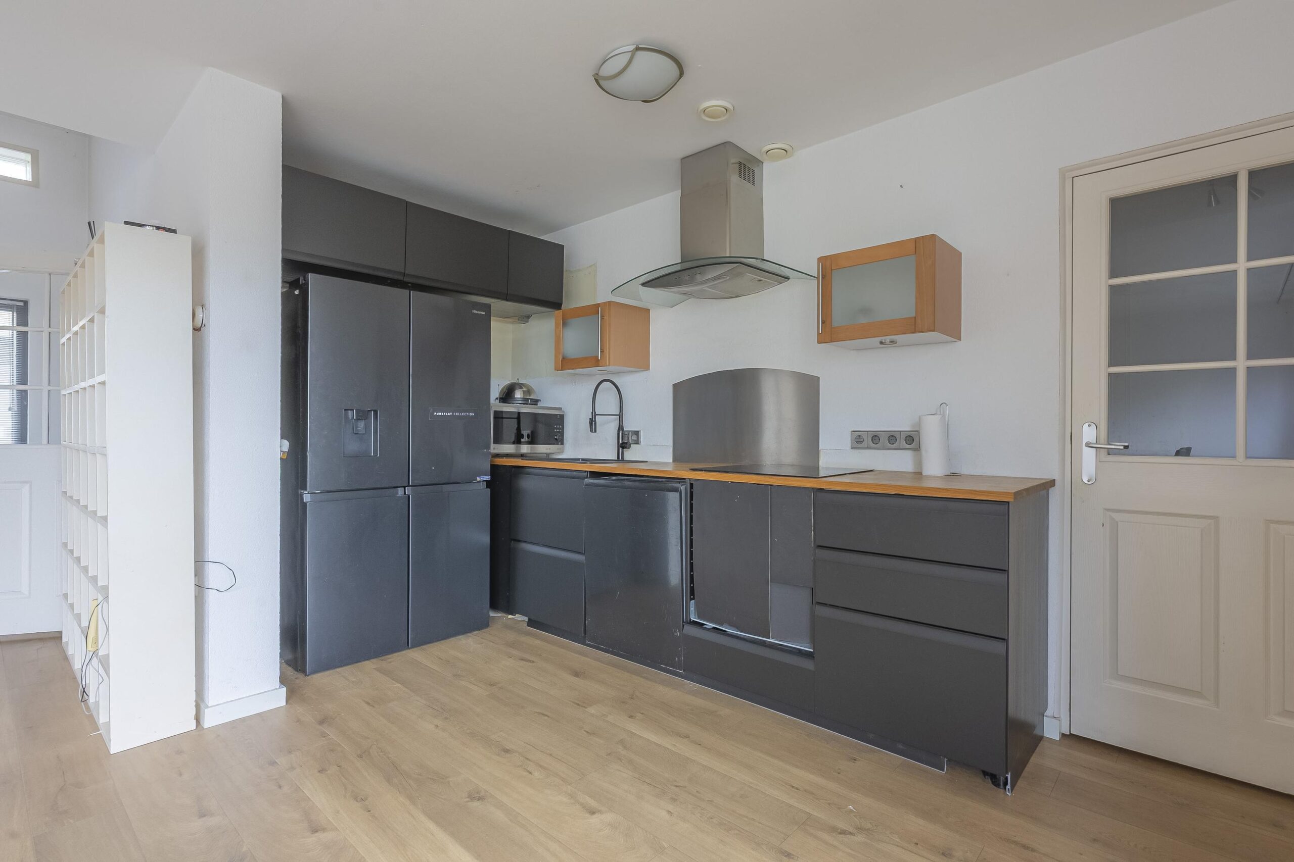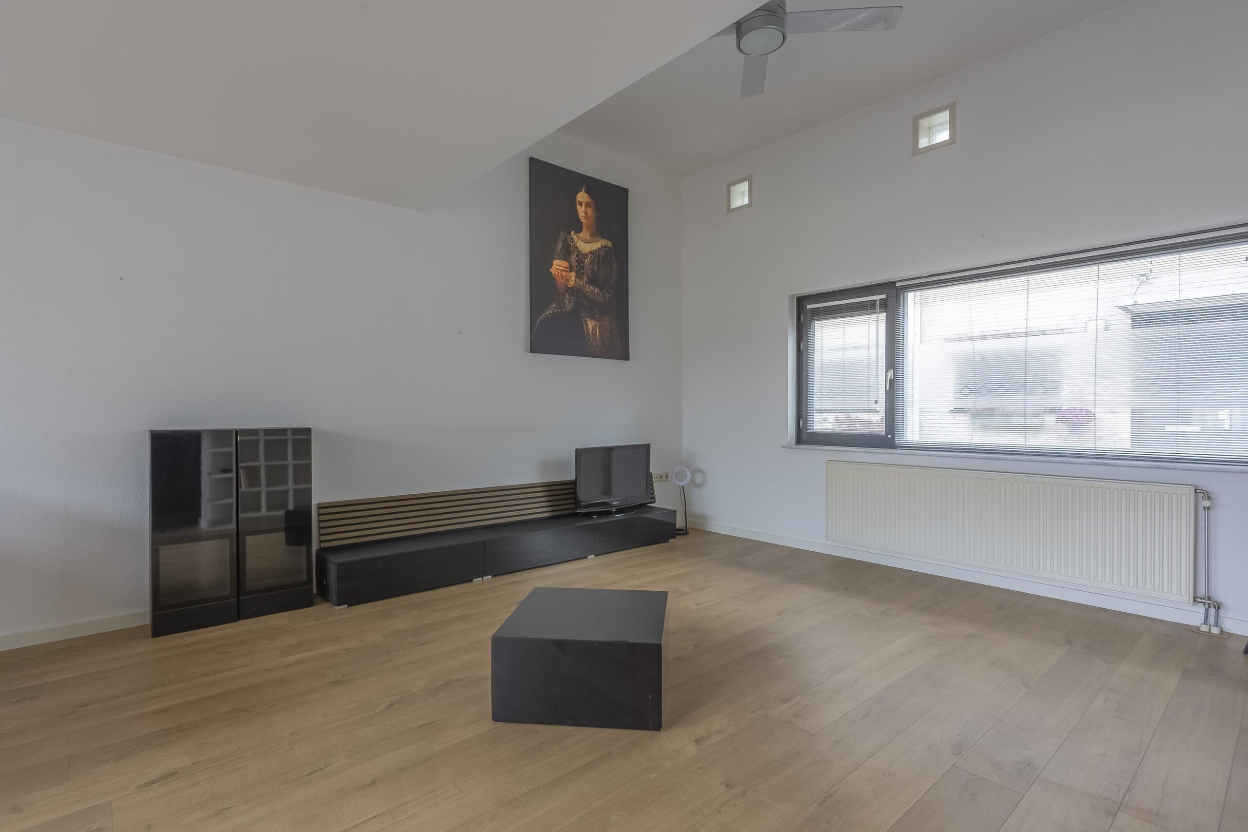 Ruime woonkamer met laminaatvloer. Open keuken inclusief navolgende apparatuur: koel- vriescombinatie,