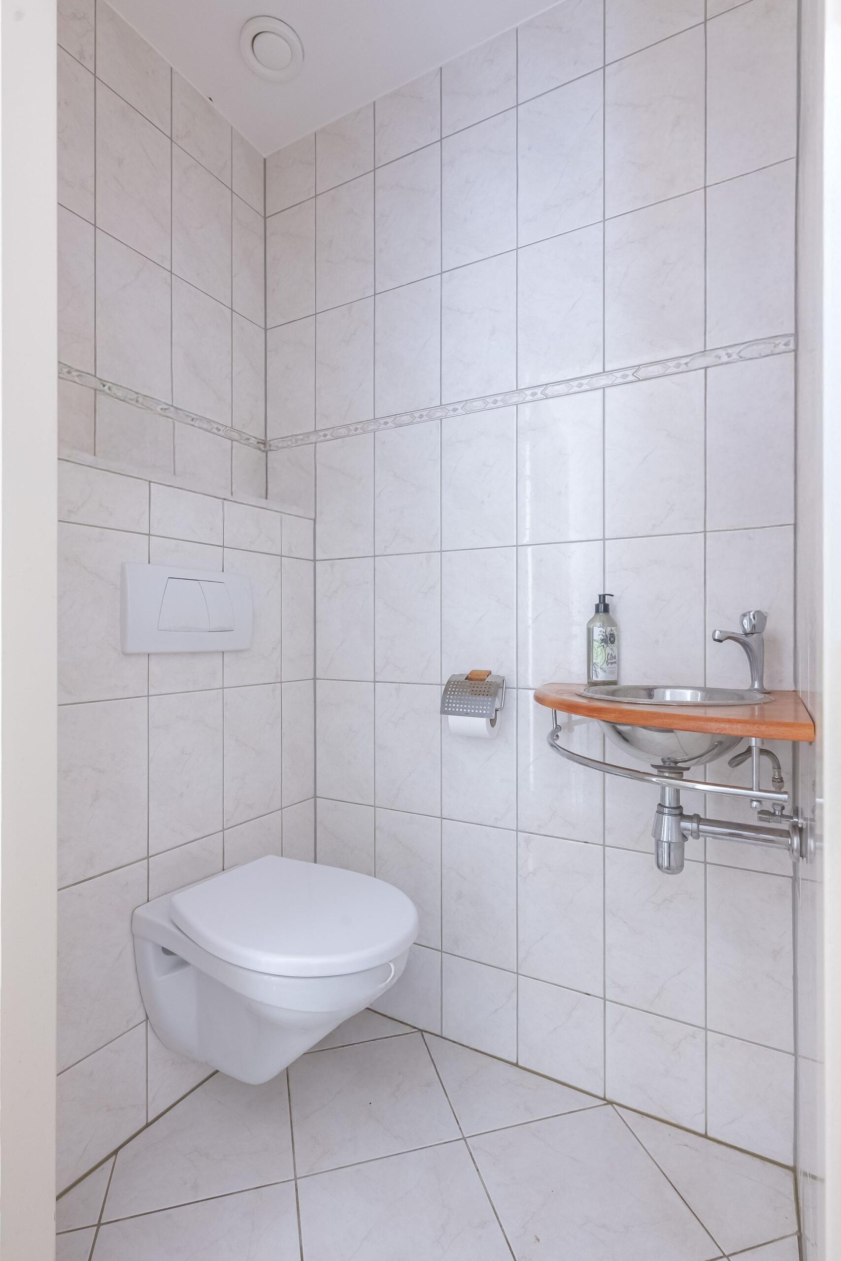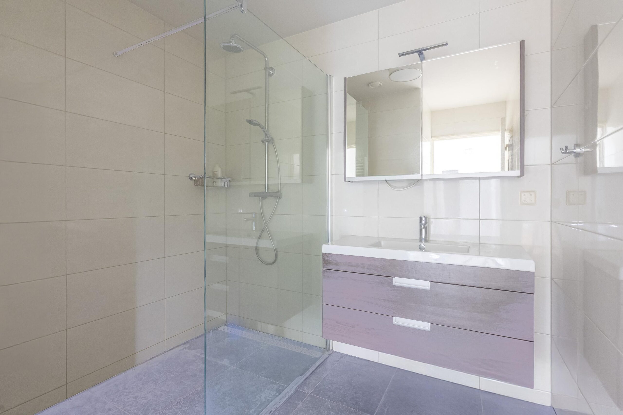 Tussenportaal met geheel betegelde badkamer met inloopdouche en badmeubel met vaste wastafel en geheel