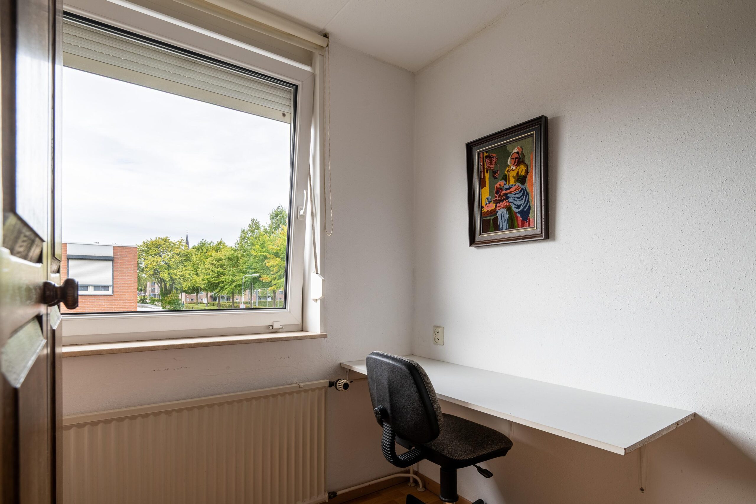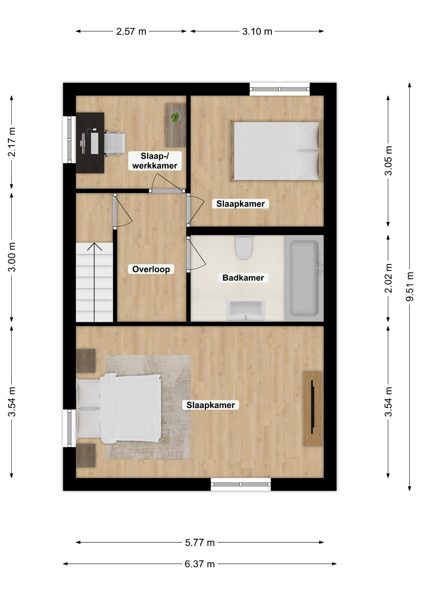 Overloop met toegang tot drie slaapkamers, afgewerkt met laminaat- en parketvloeren. De geheel betegelde badkamer beschikt over een wastafel, tweede toilet, kunststof ligbad en een verlaagd plafond met ingebouwde verlichting.