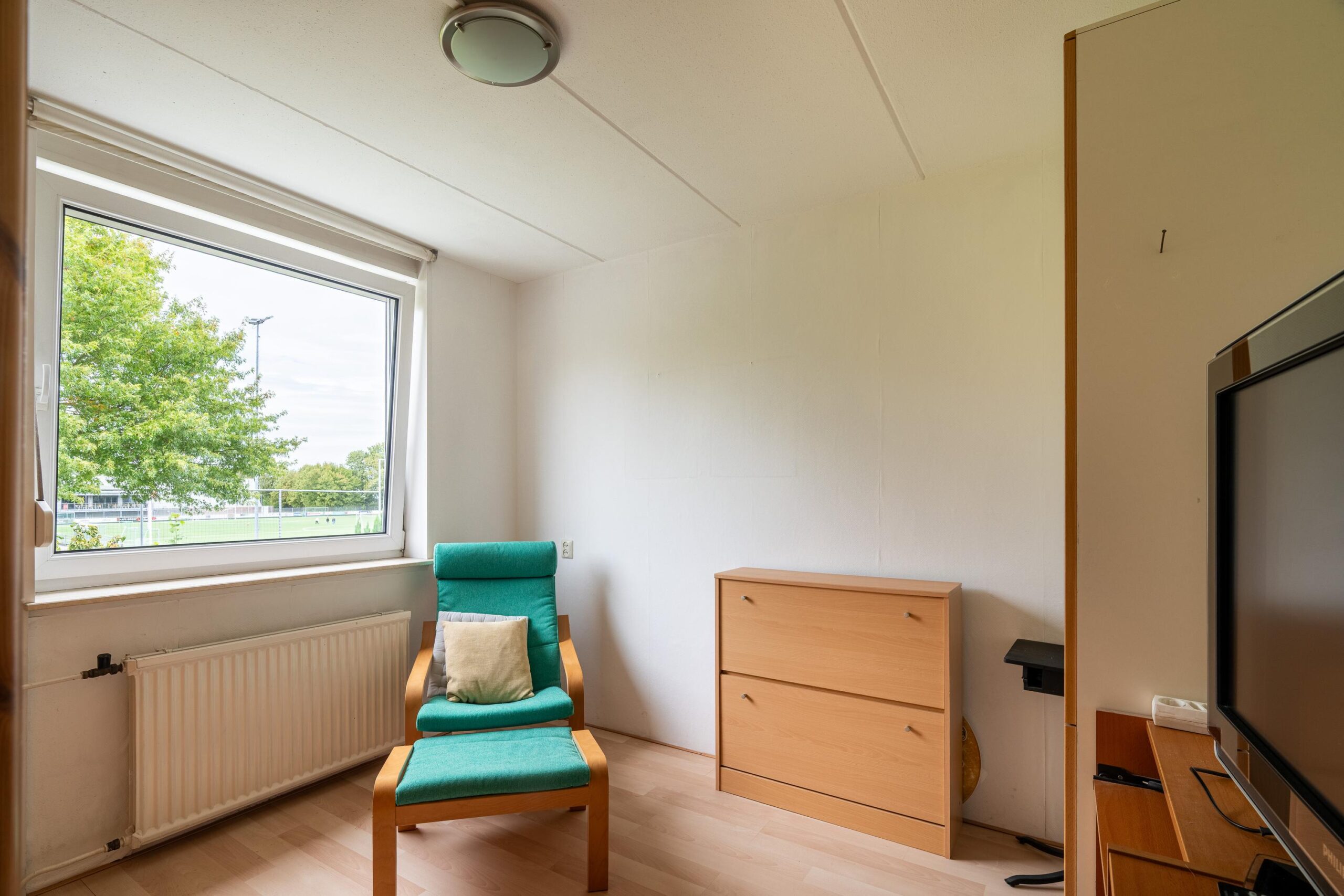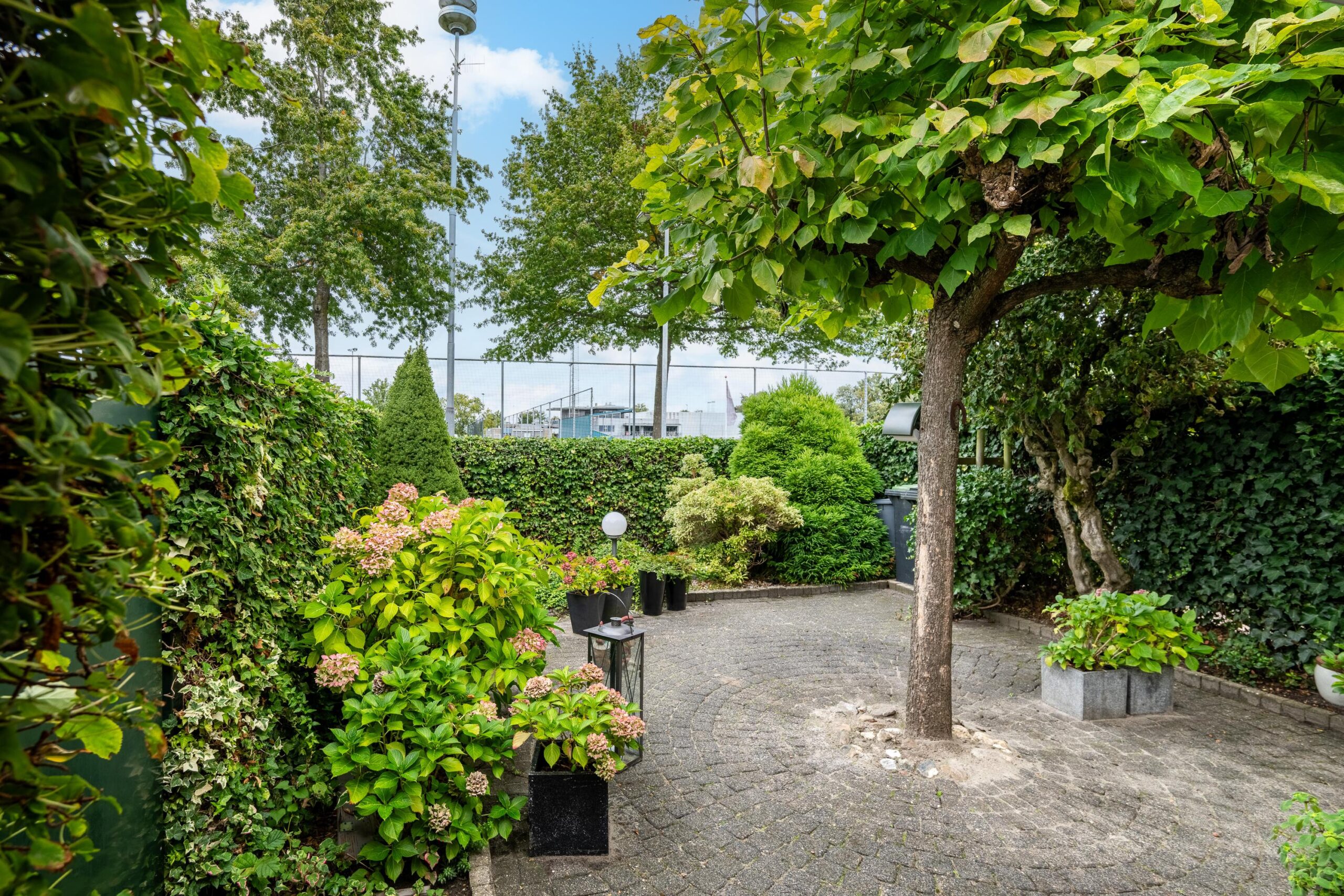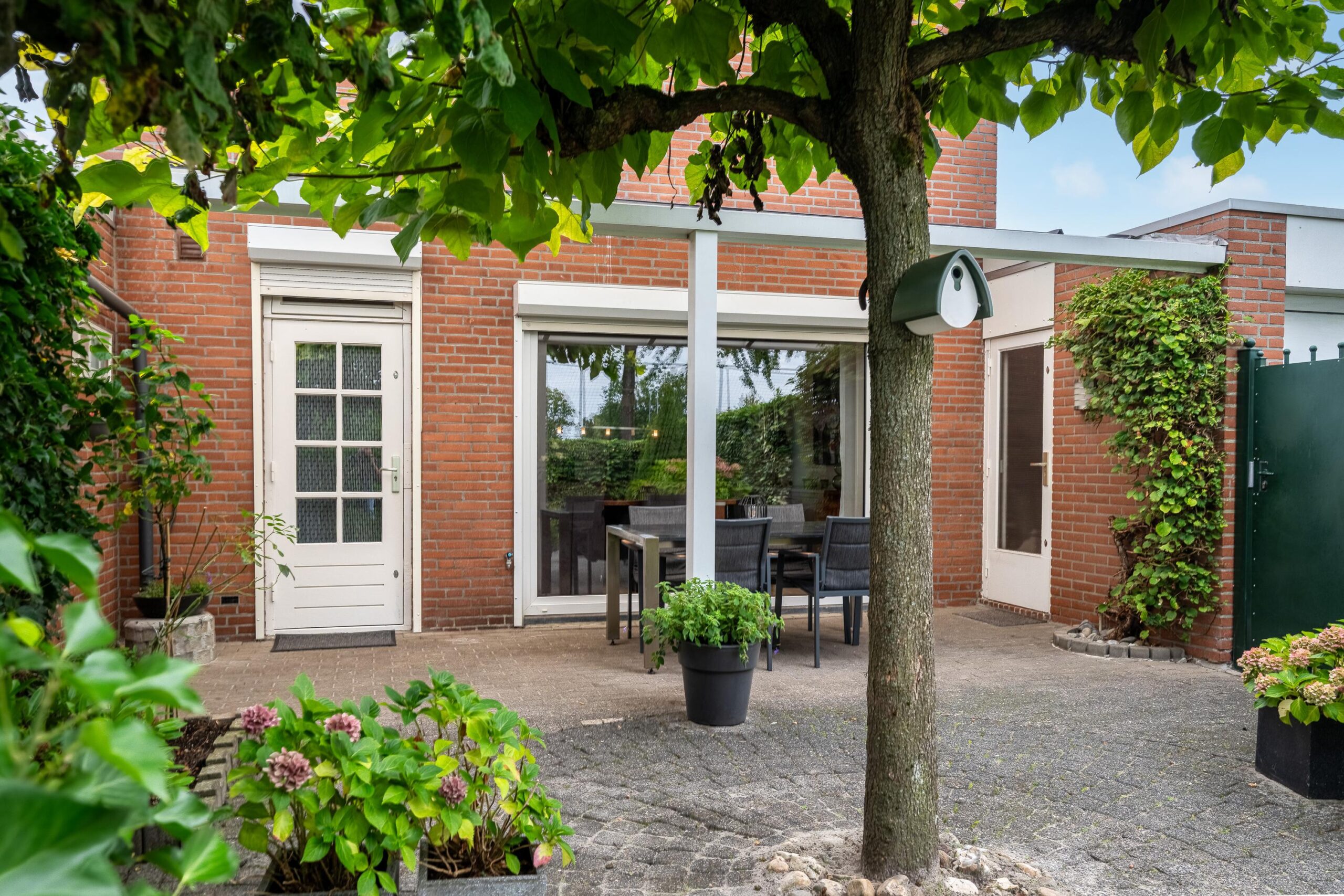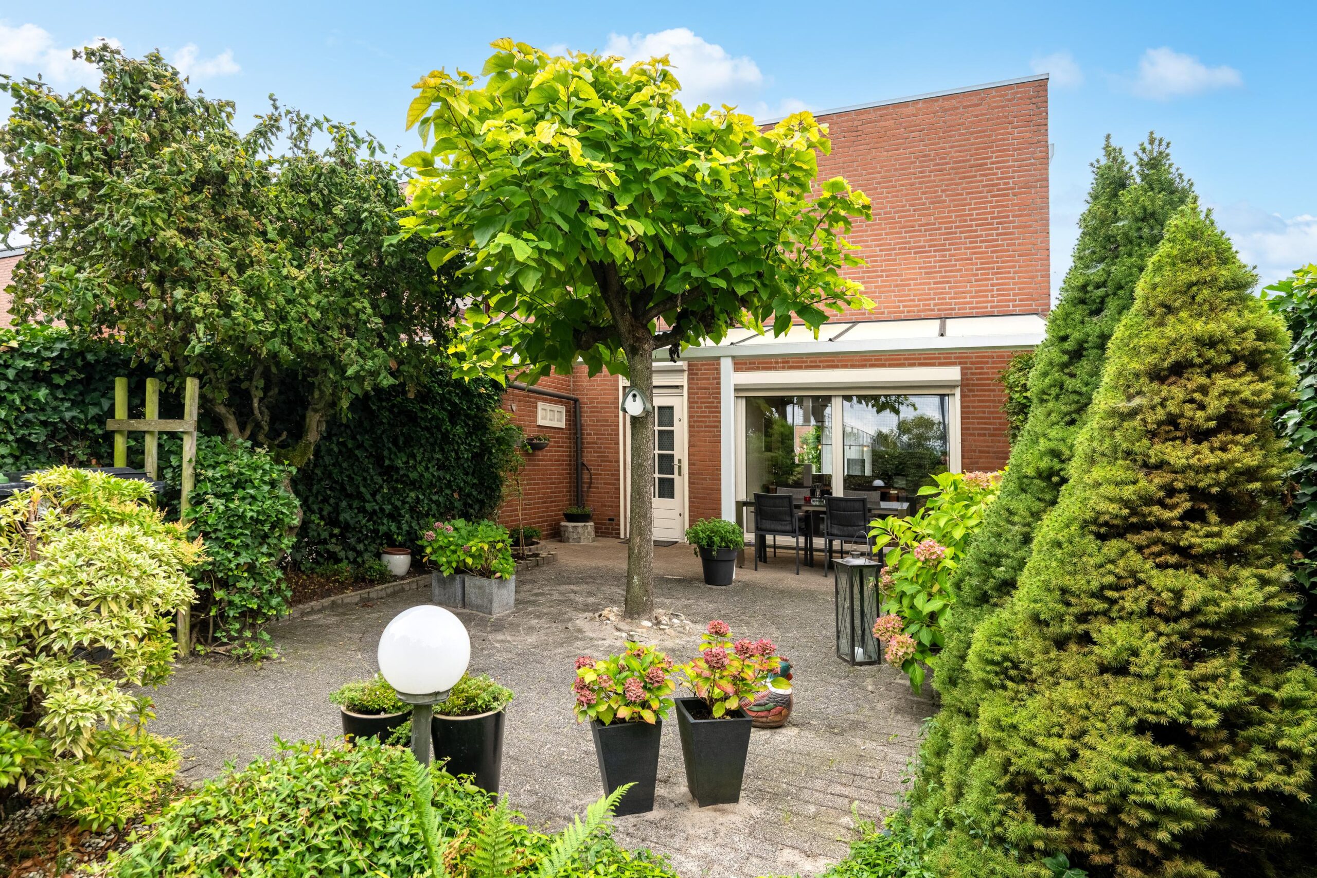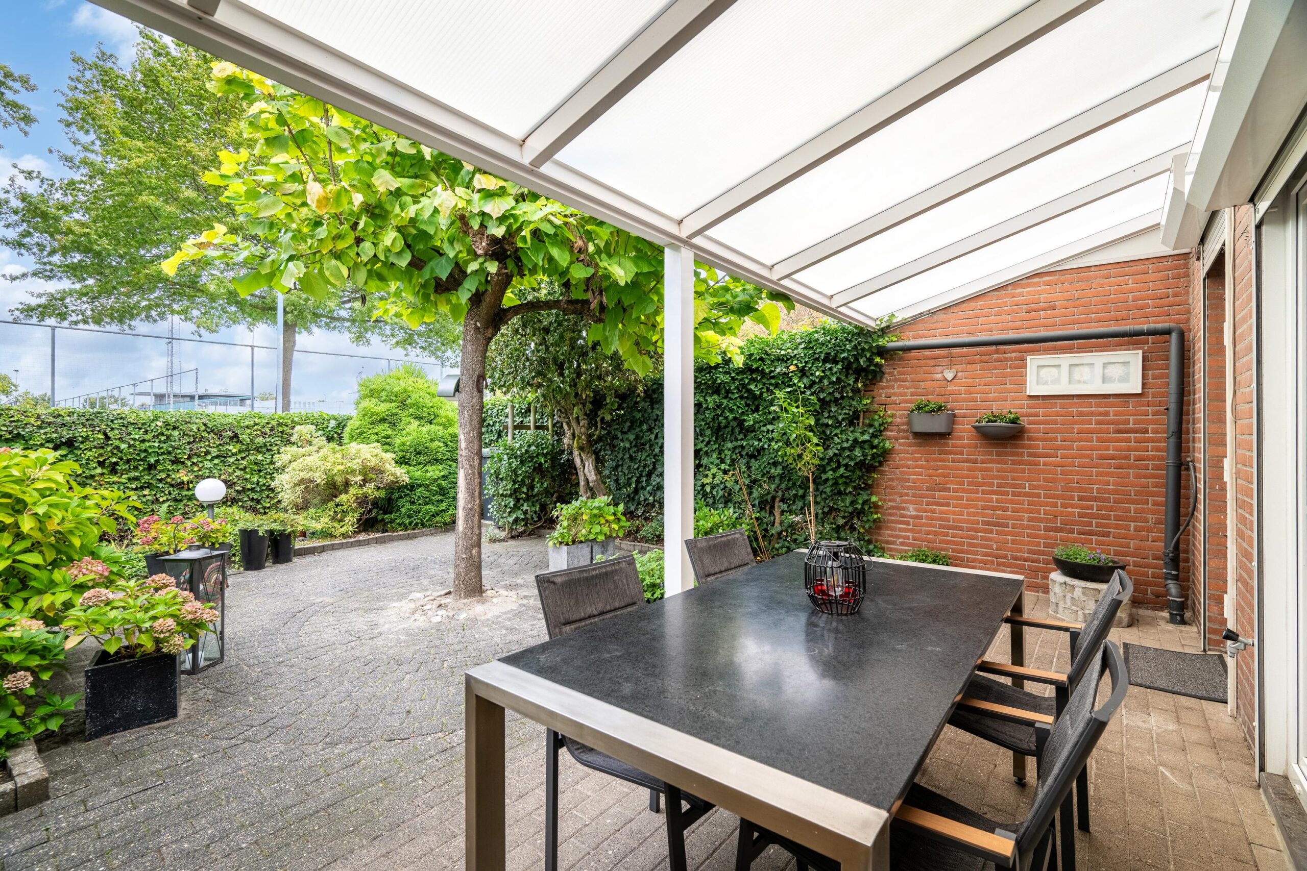 De geheel omsloten tuin is bereikbaar via de keuken, schuifpui, garage of zij-ingang. De tuin is fraai aangelegd en beschikt over een aluminium terrasoverkapping en blijvend vrij uitzicht over de groene omgeving.