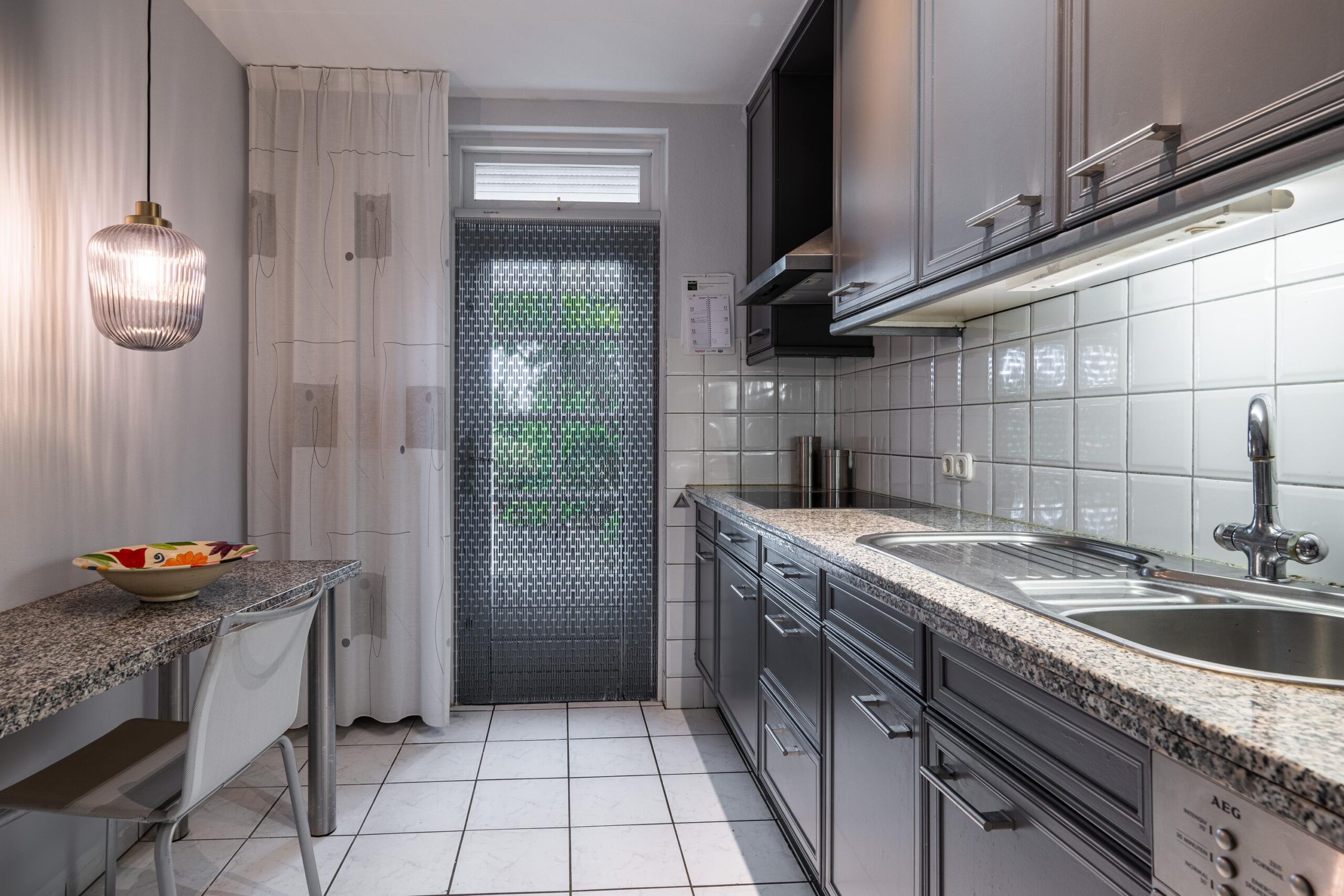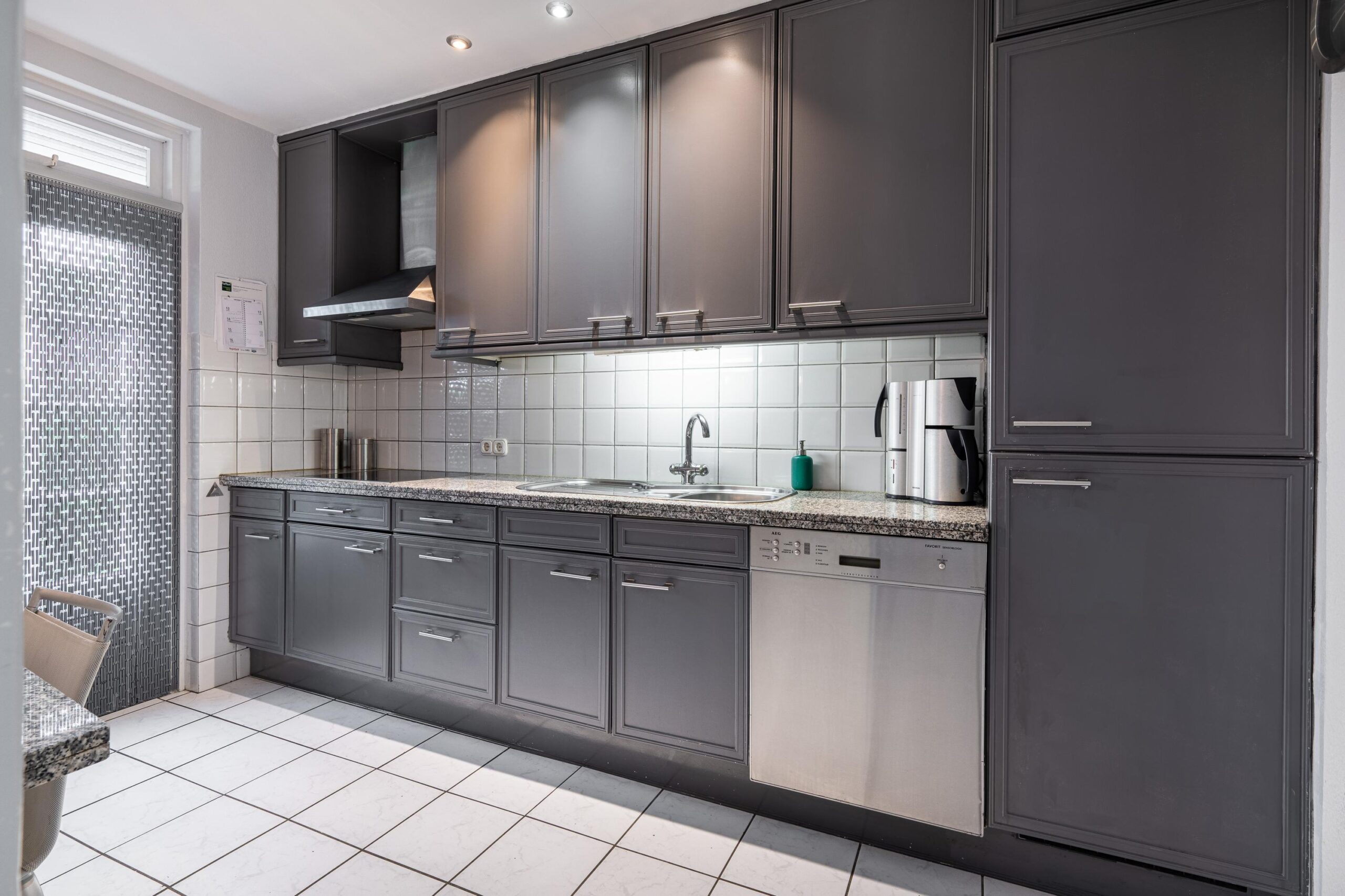 De gesloten leefkeuken is betegeld en uitgerust met een moderne installatie met granieten aanrechtblad en inbouwapparatuur: keramische kookplaat, koelkast, vaatwasser en afzuigkap.