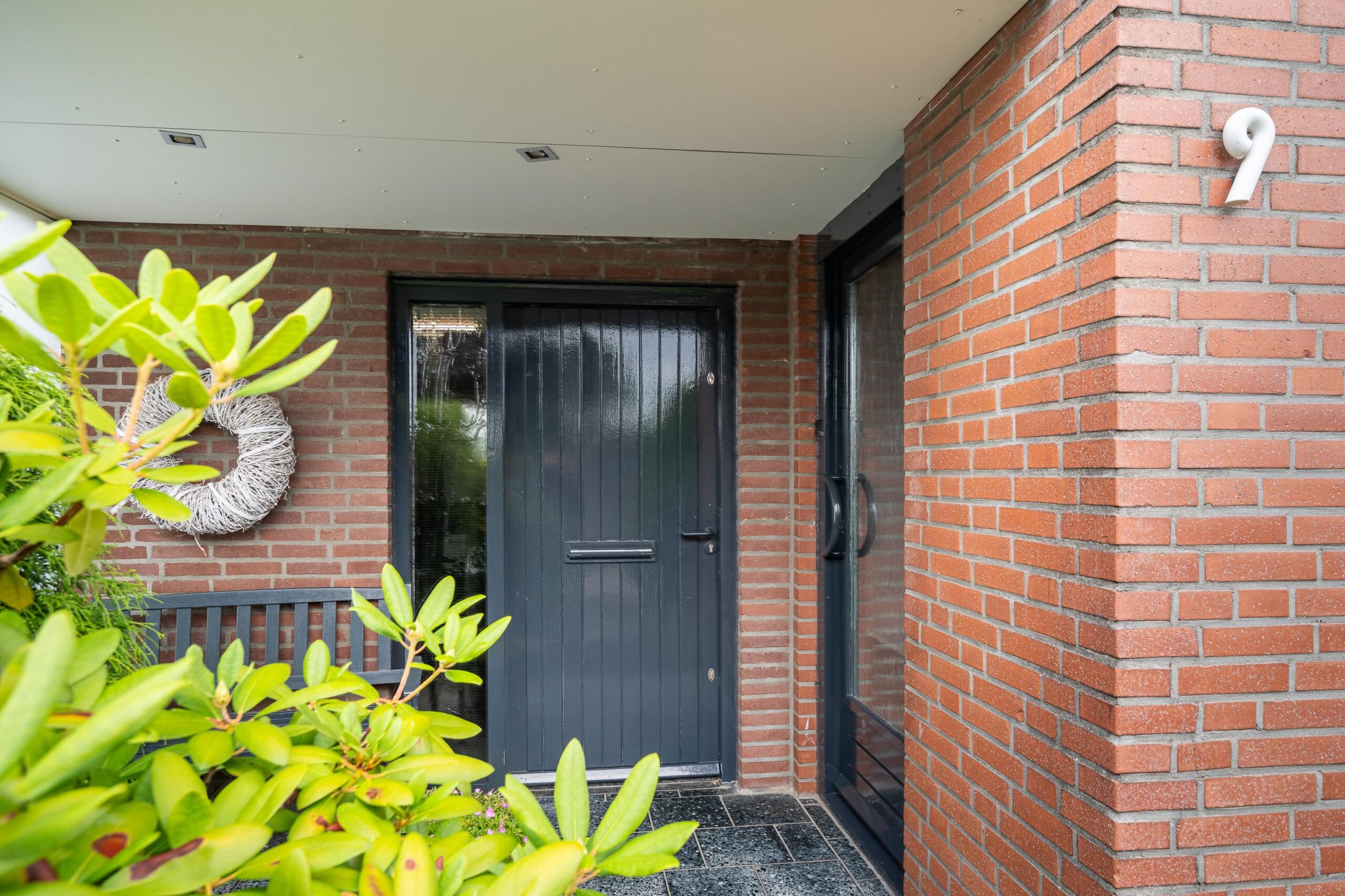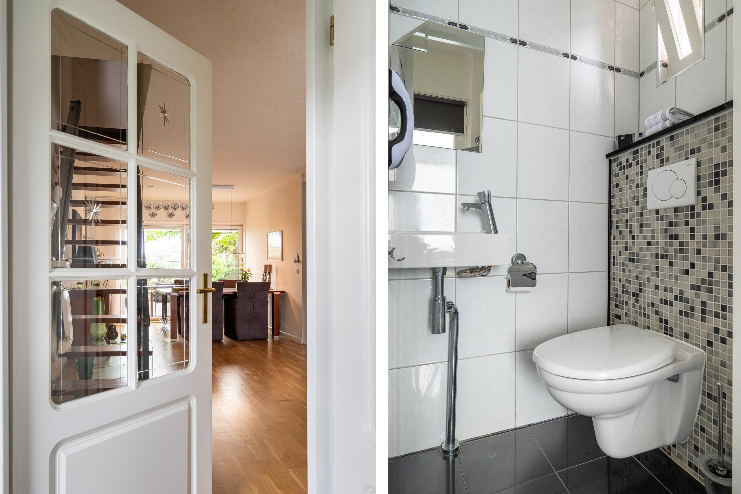Via de aangelegde voortuin bereikt u de ruime, overdekte entree met ingebouwde verlichting en glazen windscherm. De hal beschikt over een garderobenis, plavuizenvloer en een geheel betegeld toilet met fontein.