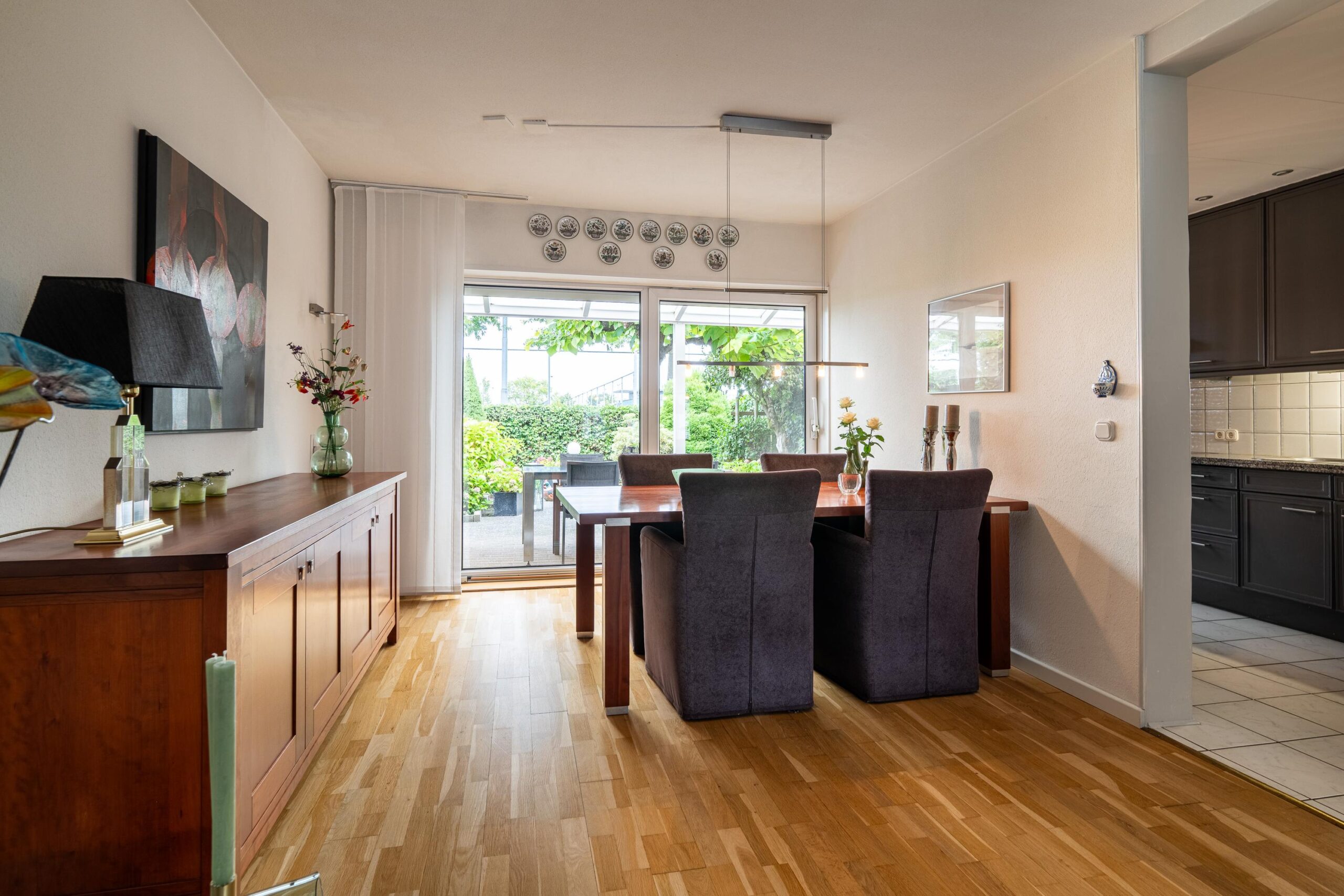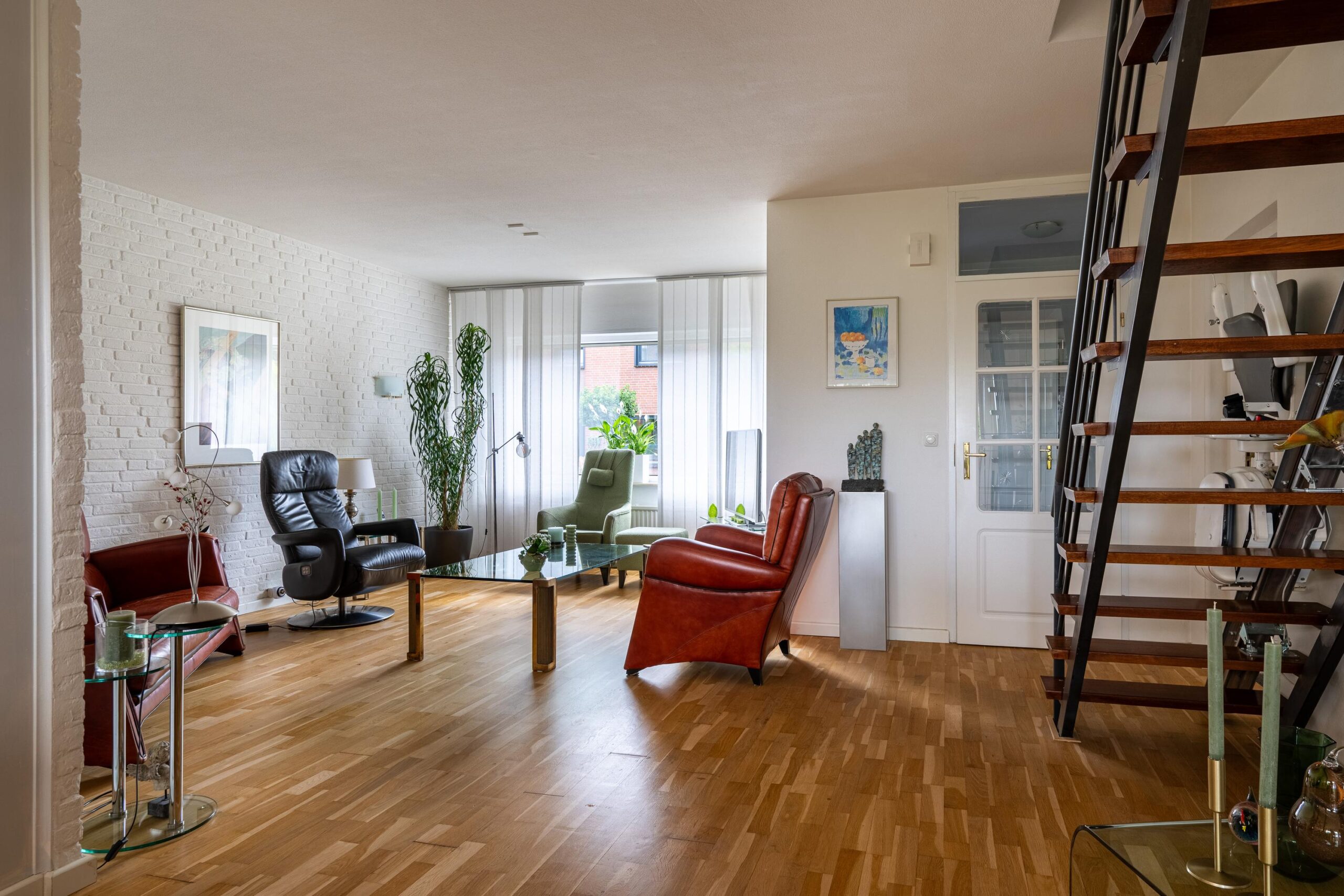 De sfeervolle Z-vormige woonkamer heeft een uitstekende lichtinval, parketvloer, schuifpui naar de tuin en een open hardhouten trap naar de verdieping.