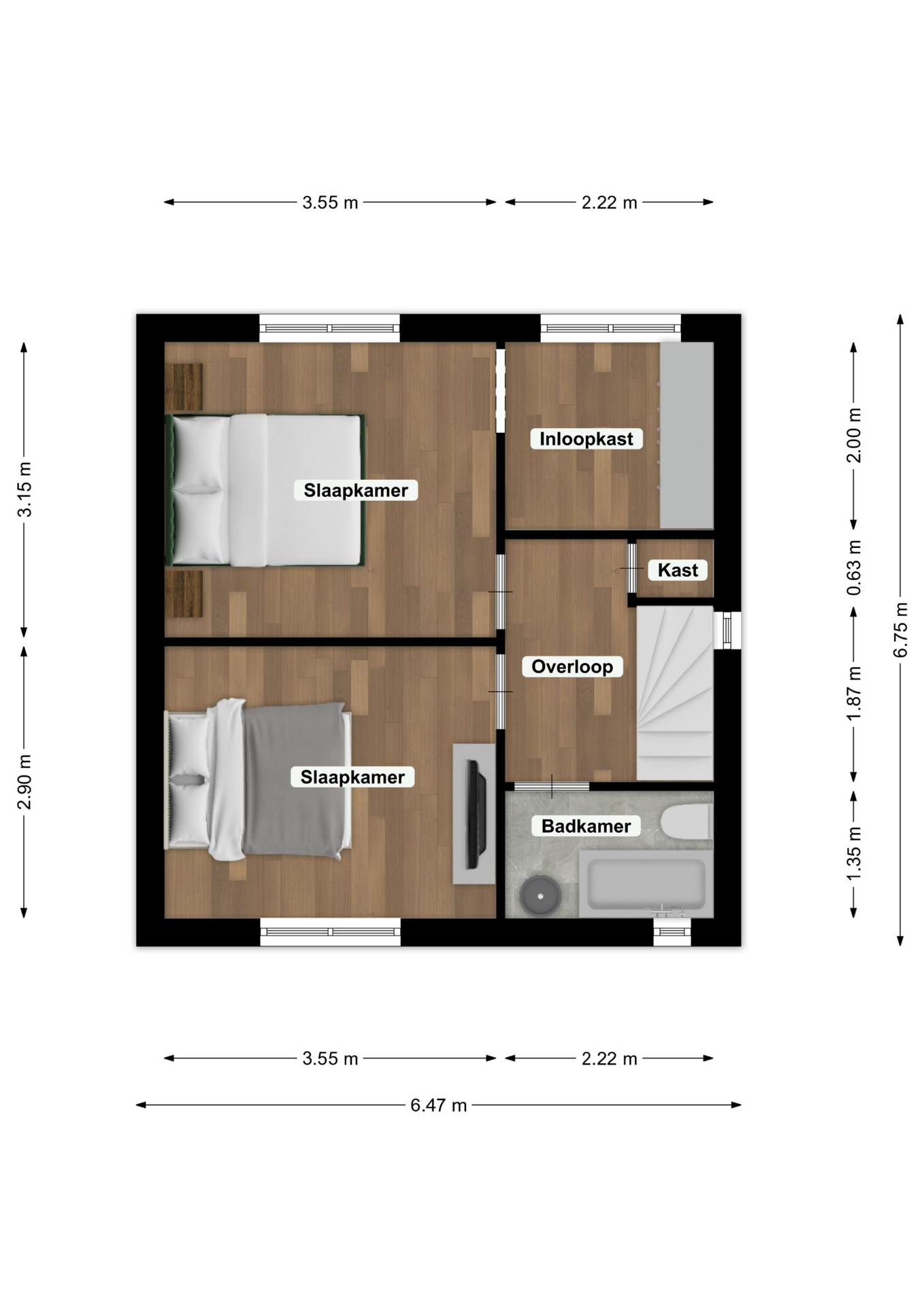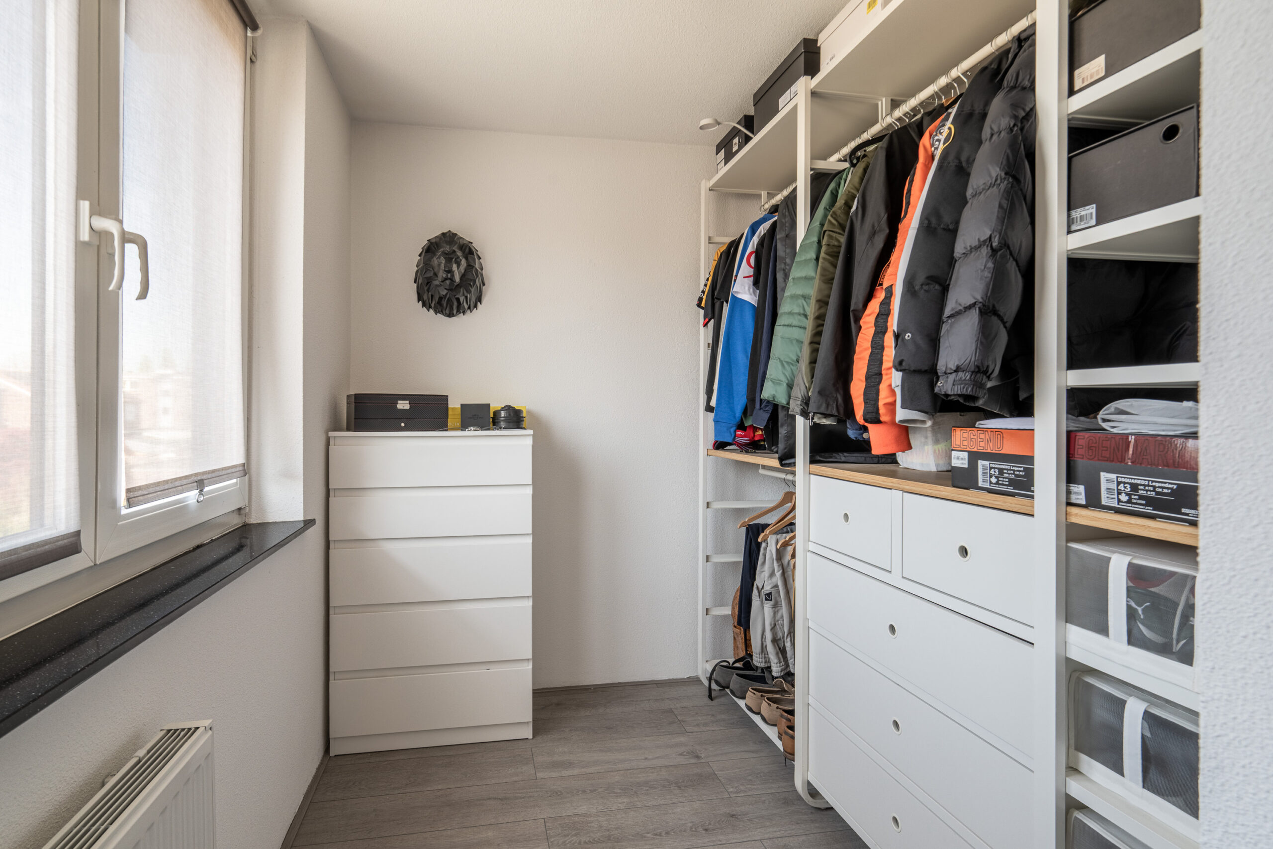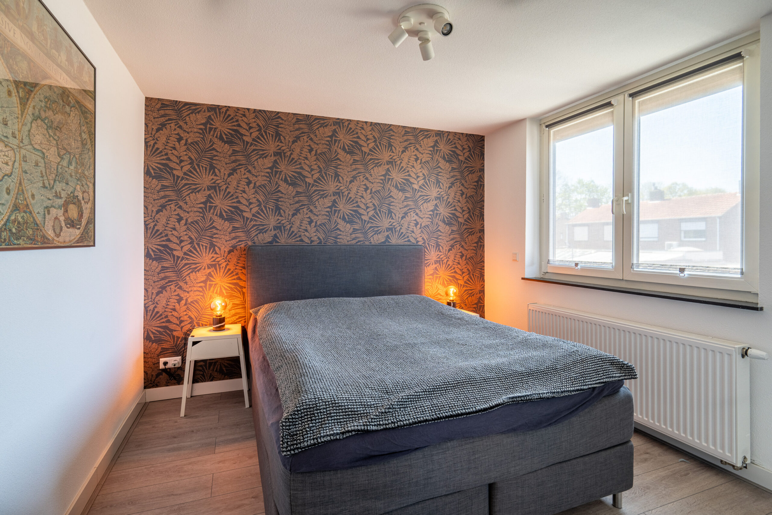 De overloop met bergkast geeft toegang tot twee ruime slaapkamers (voorheen drie). Beide kamers zijn netjes afgewerkt met laminaatvloeren, strak spuitwerk en elektrisch bedienbare rolluiken.