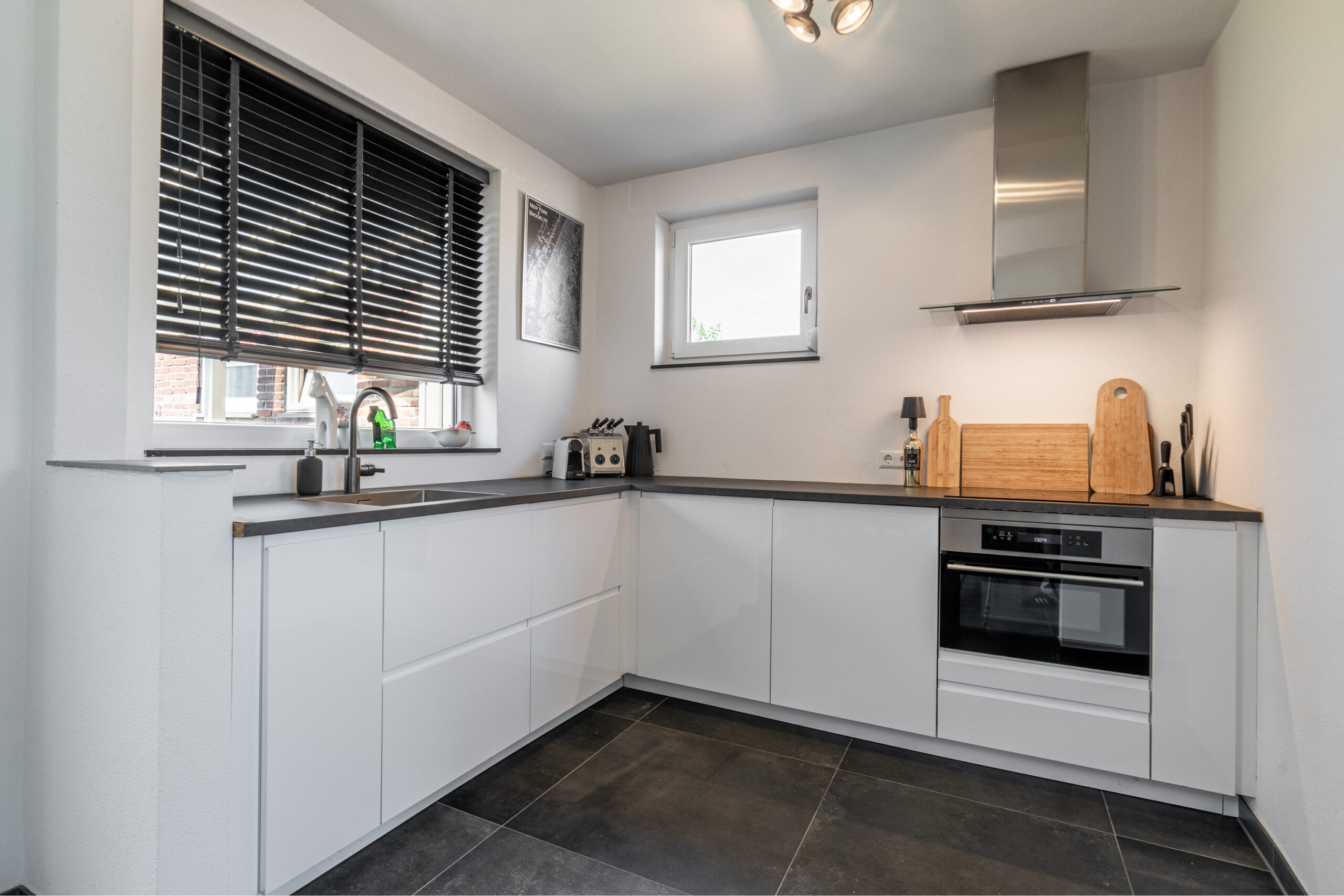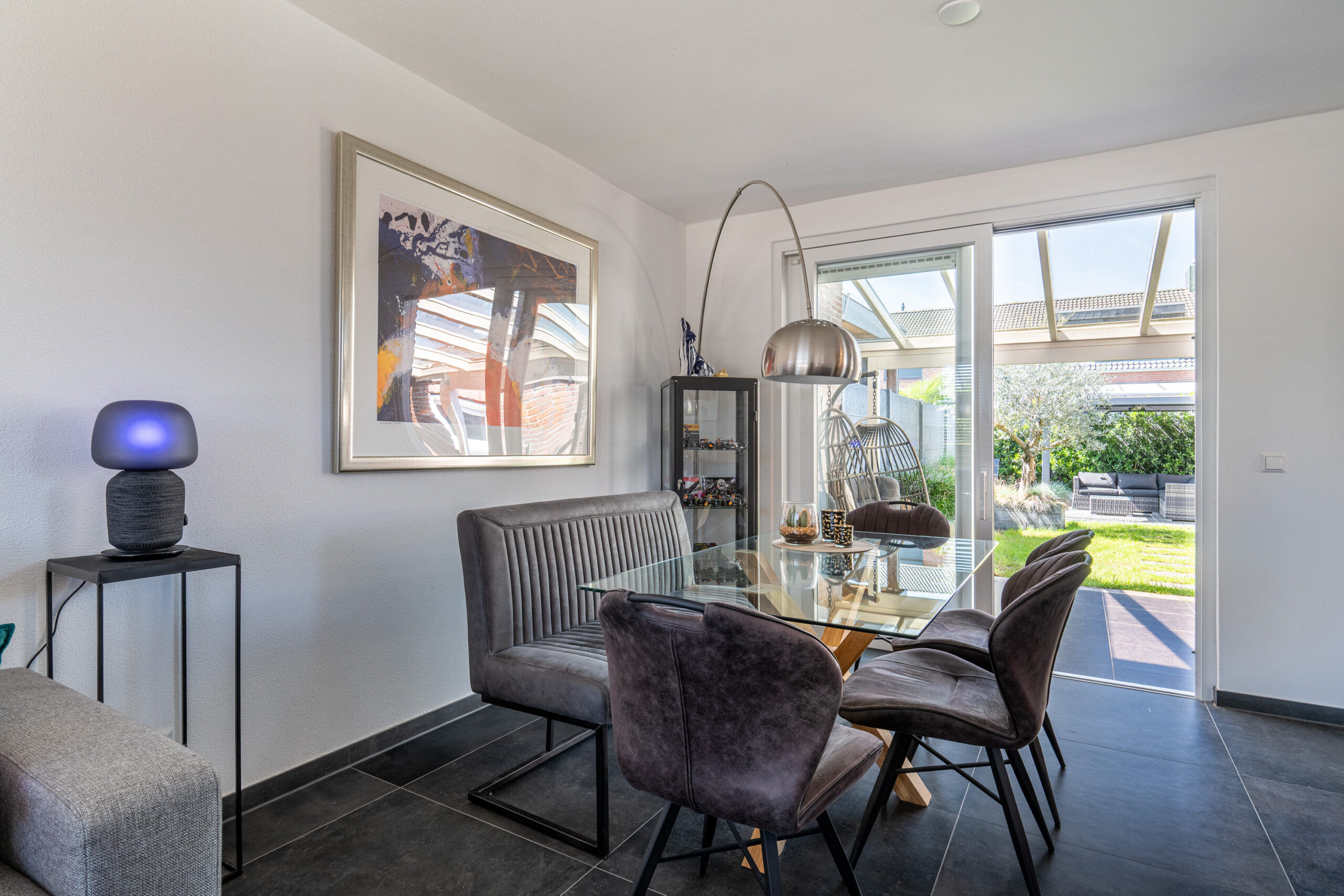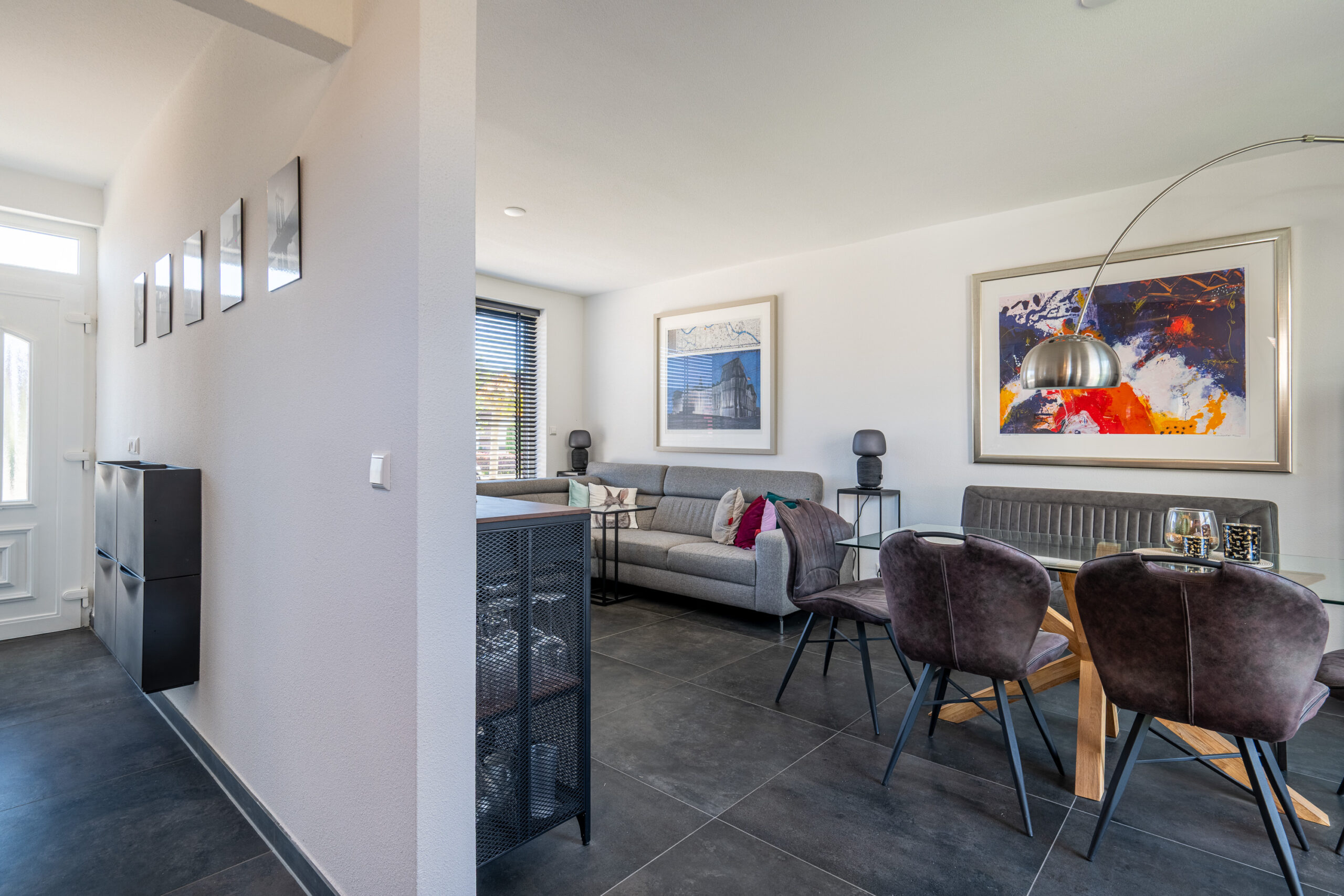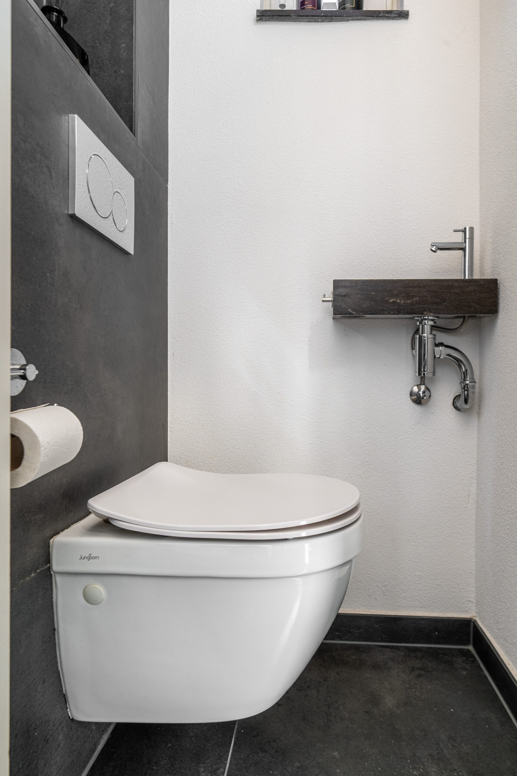 Via de verzorgde, onderhoudsvrije voortuin bereikt u de entree. De hal biedt toegang tot de trap naar de eerste verdieping en een modern, vrijhangend gastentoilet met natuurstenen fonteintje en raam. De woonkamer is strak afgewerkt, voorzien van een antracietkleurige keramische tegelvloer met vloerverwarming, en geniet van een prettige lichtinval. De open L-vormige keuken sluit naadloos aan op de woonkamer en versterkt het ruimtelijke gevoel. Deze moderne, greeploze keuken is uitgerust met diverse inbouwapparatuur, waaronder een combimagnetron, inductiekookplaat, afzuigkap, koelkast en vaatwasser.