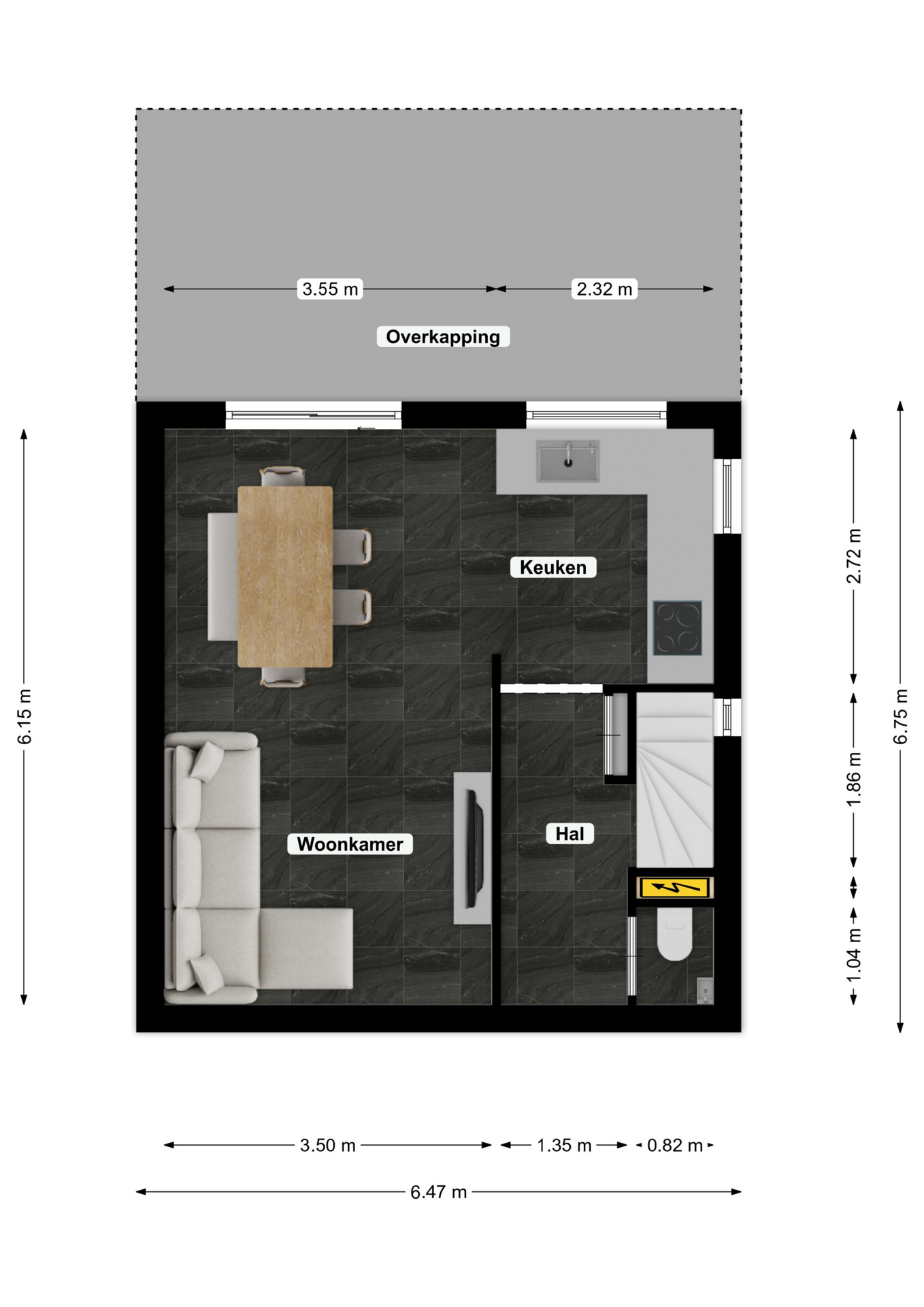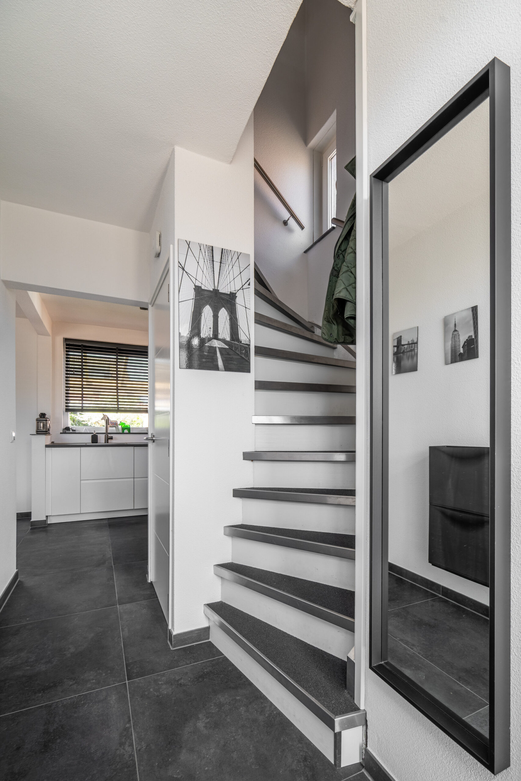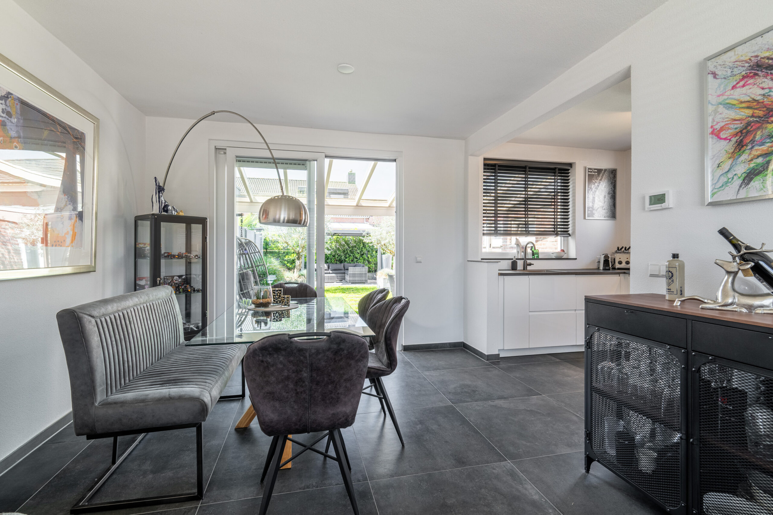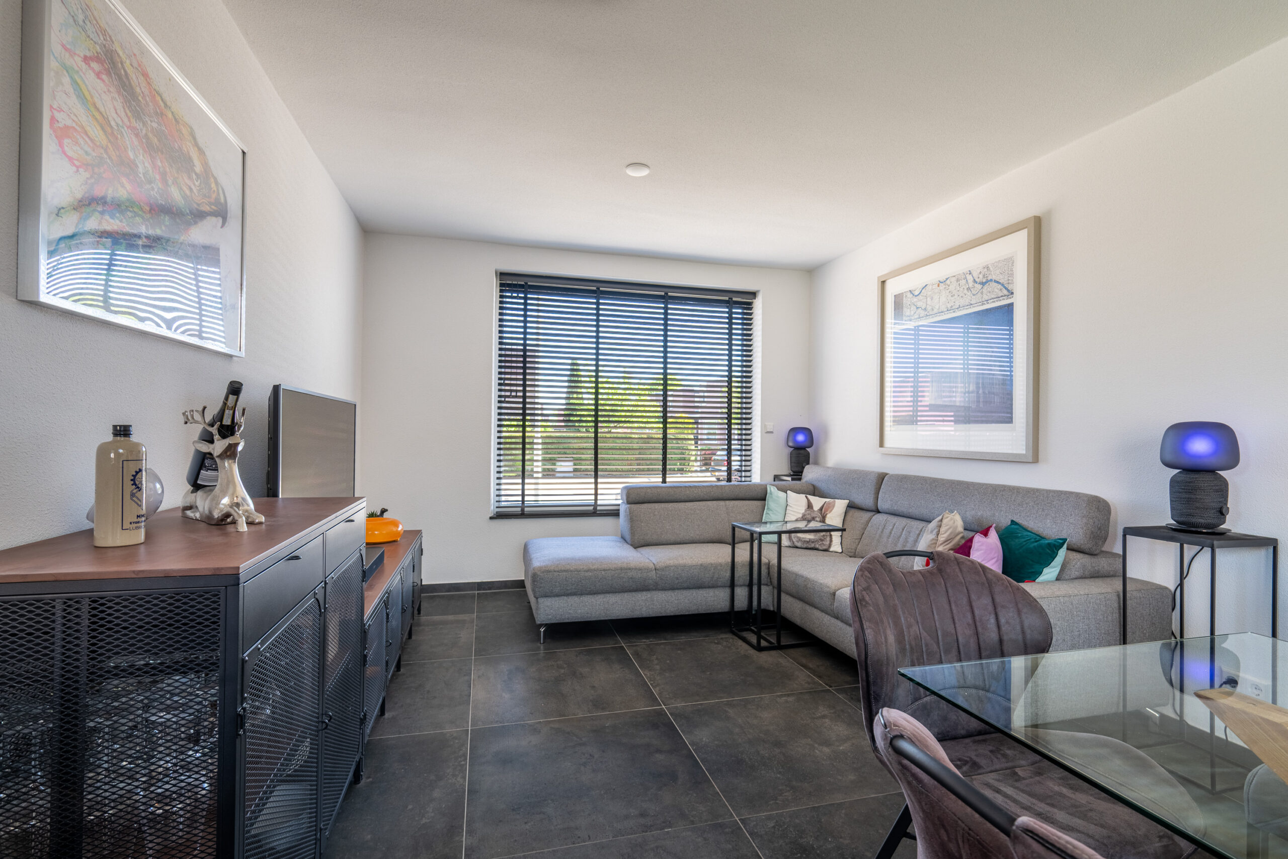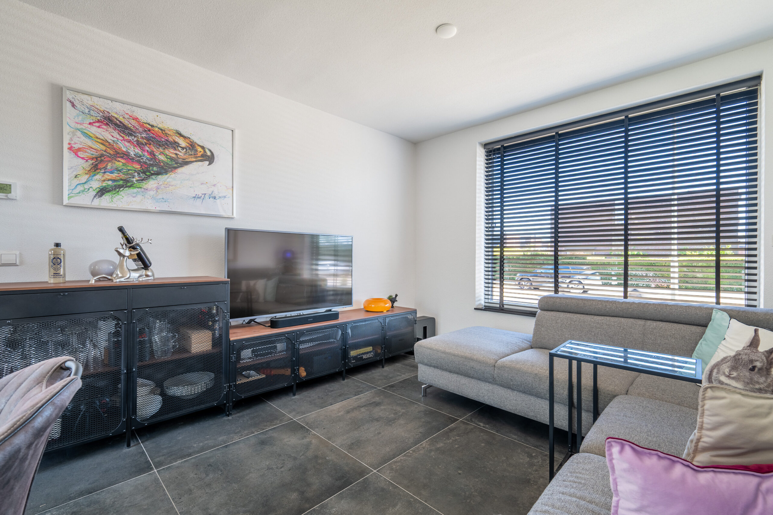 Via de verzorgde, onderhoudsvrije voortuin bereikt u de entree. De hal biedt toegang tot de trap naar de eerste verdieping en een modern, vrijhangend gastentoilet met natuurstenen fonteintje en raam. De woonkamer is strak afgewerkt, voorzien van een antracietkleurige keramische tegelvloer met vloerverwarming, en geniet van een prettige lichtinval. De open L-vormige keuken sluit naadloos aan op de woonkamer en versterkt het ruimtelijke gevoel. Deze moderne, greeploze keuken is uitgerust met diverse inbouwapparatuur, waaronder een combimagnetron, inductiekookplaat, afzuigkap, koelkast en vaatwasser.