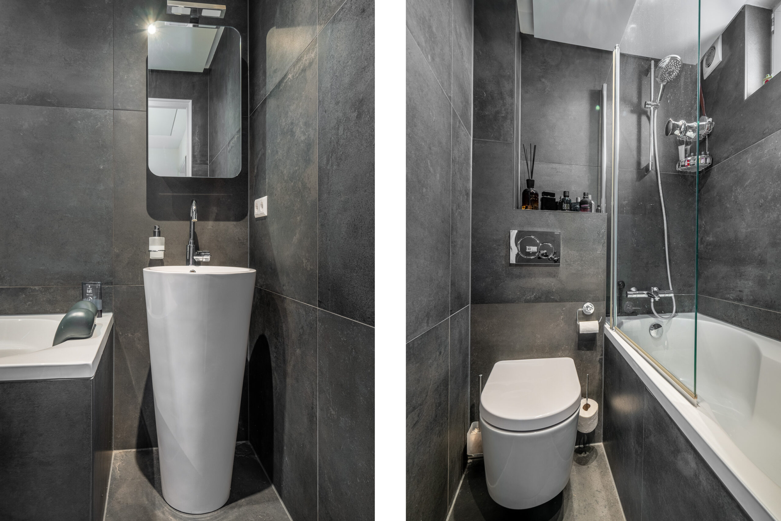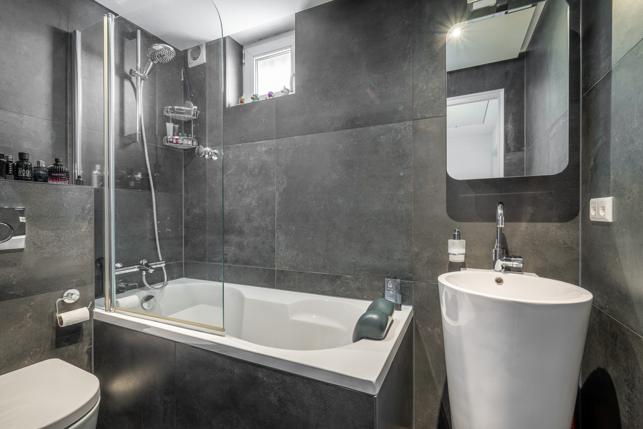 De moderne, volledig betegelde badkamer is luxe uitgevoerd en voorzien van een tweede vrijhangend toilet, design wastafel, ligbad met douchewand, mechanische ventilatie, een raam voor daglicht en elektrische vloerverwarming.