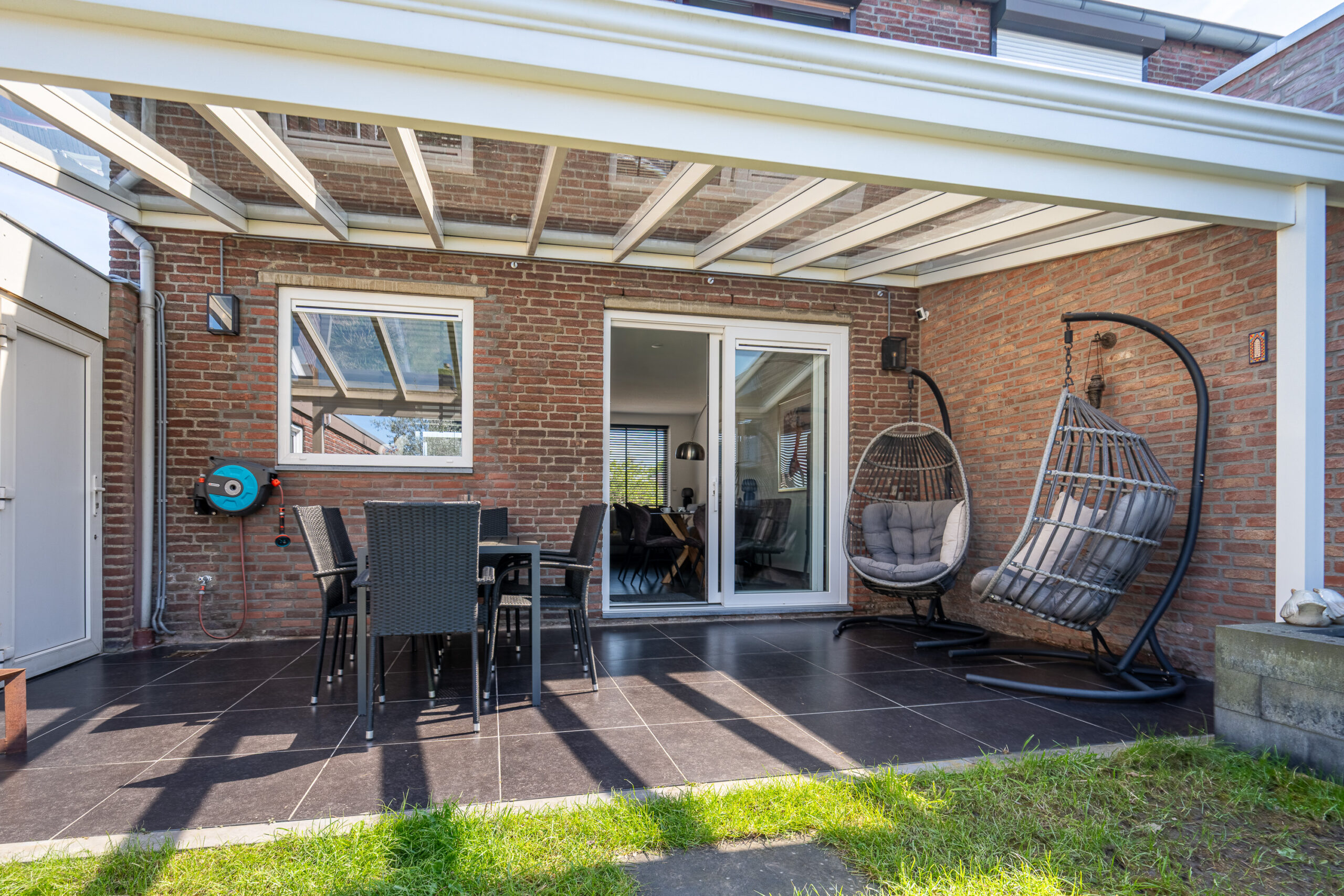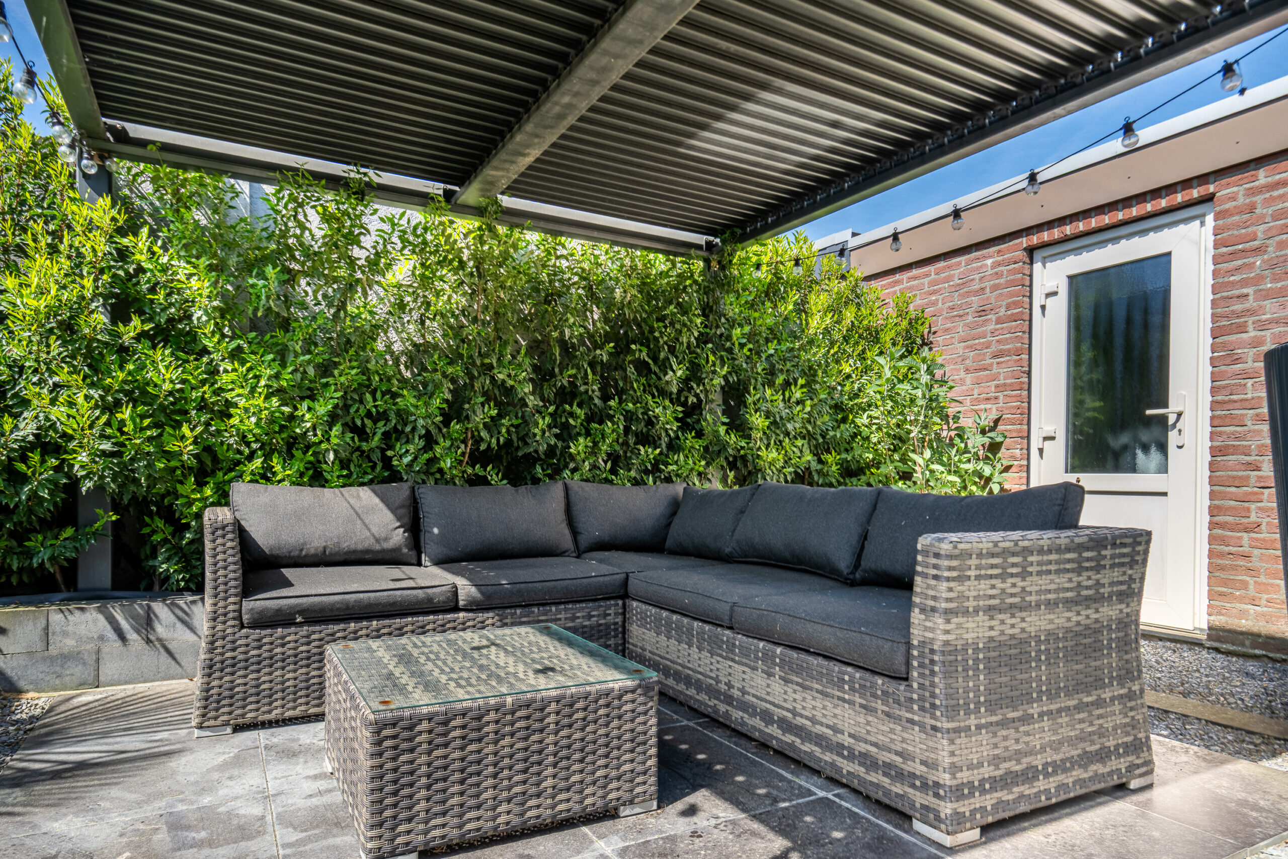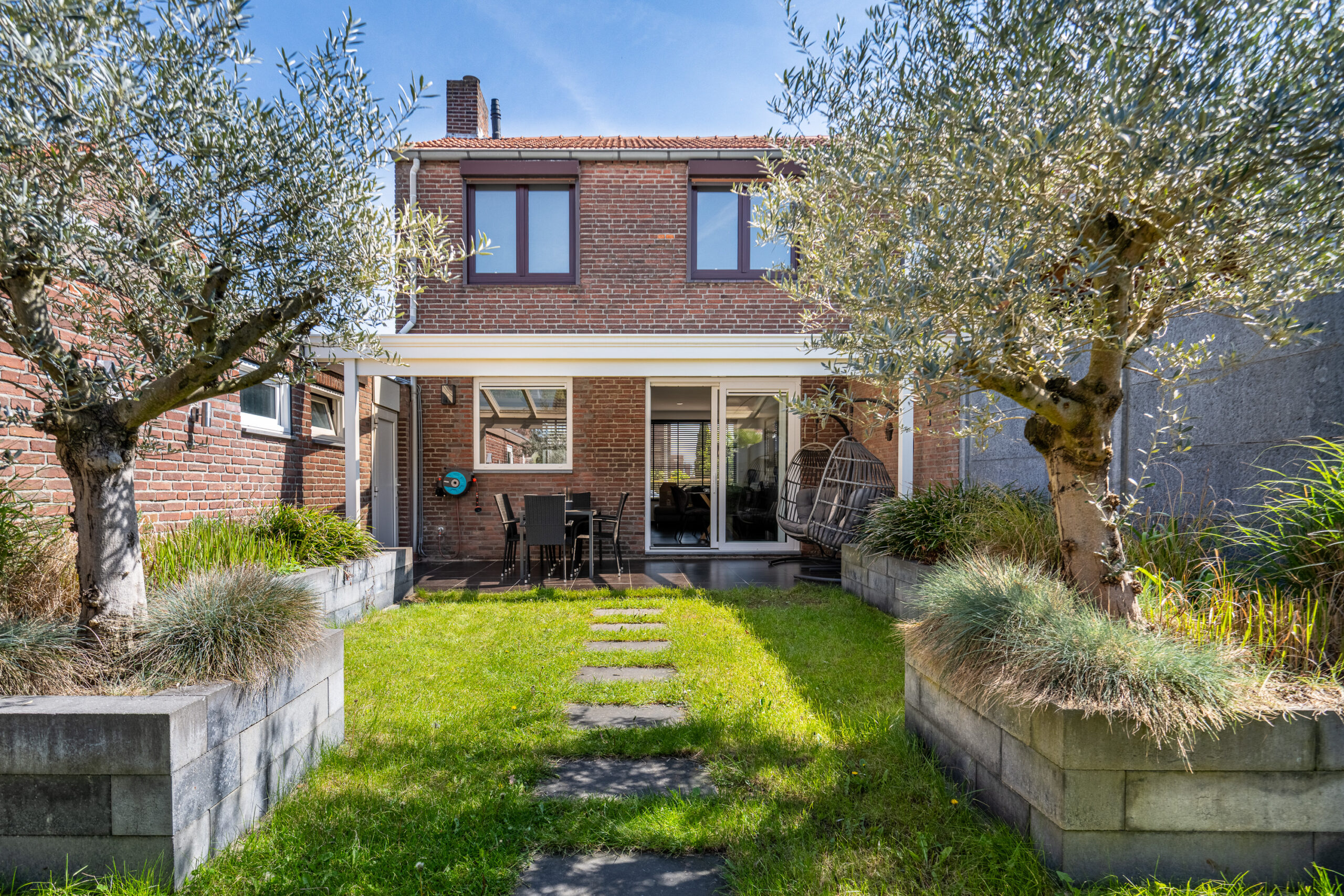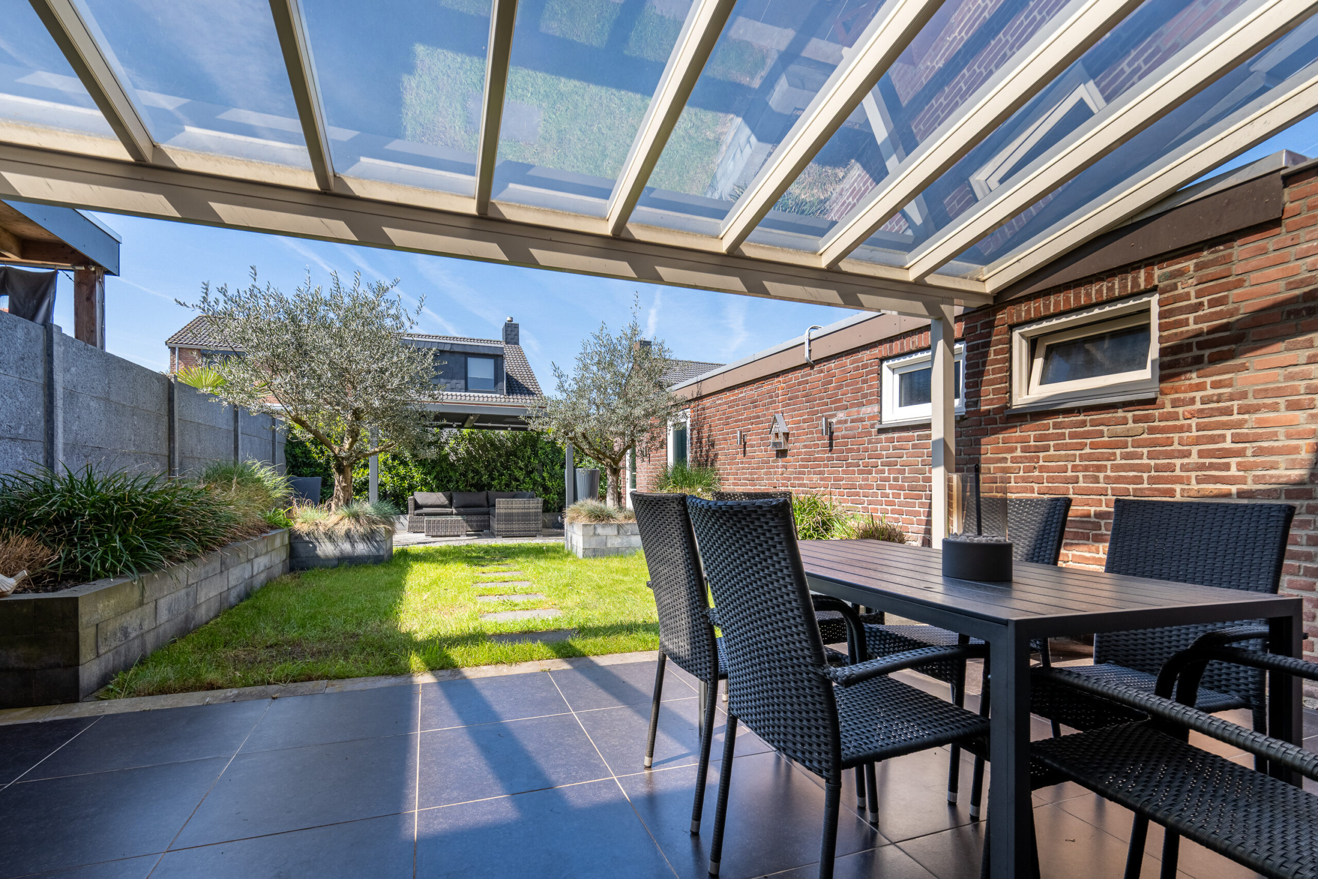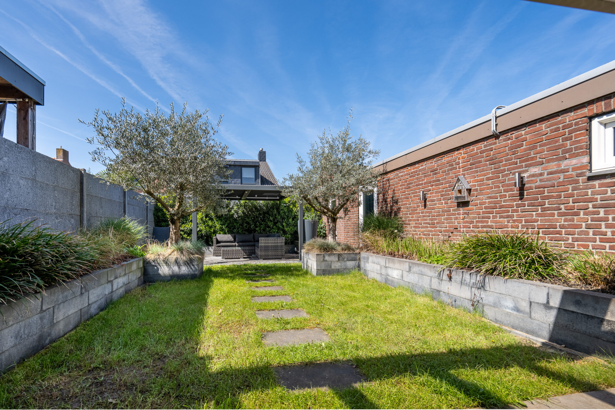 De fraai aangelegde, volledig omsloten achtertuin is bereikbaar via de oprit en via een schuifpui in de woonkamer. Hier vindt u onder andere twee imposante olijfbomen, twee betegelde (deels overdekte) terrassen, een gazon en strak afgewerkte borders, een ideale plek om te ontspannen en te genieten van de zon.