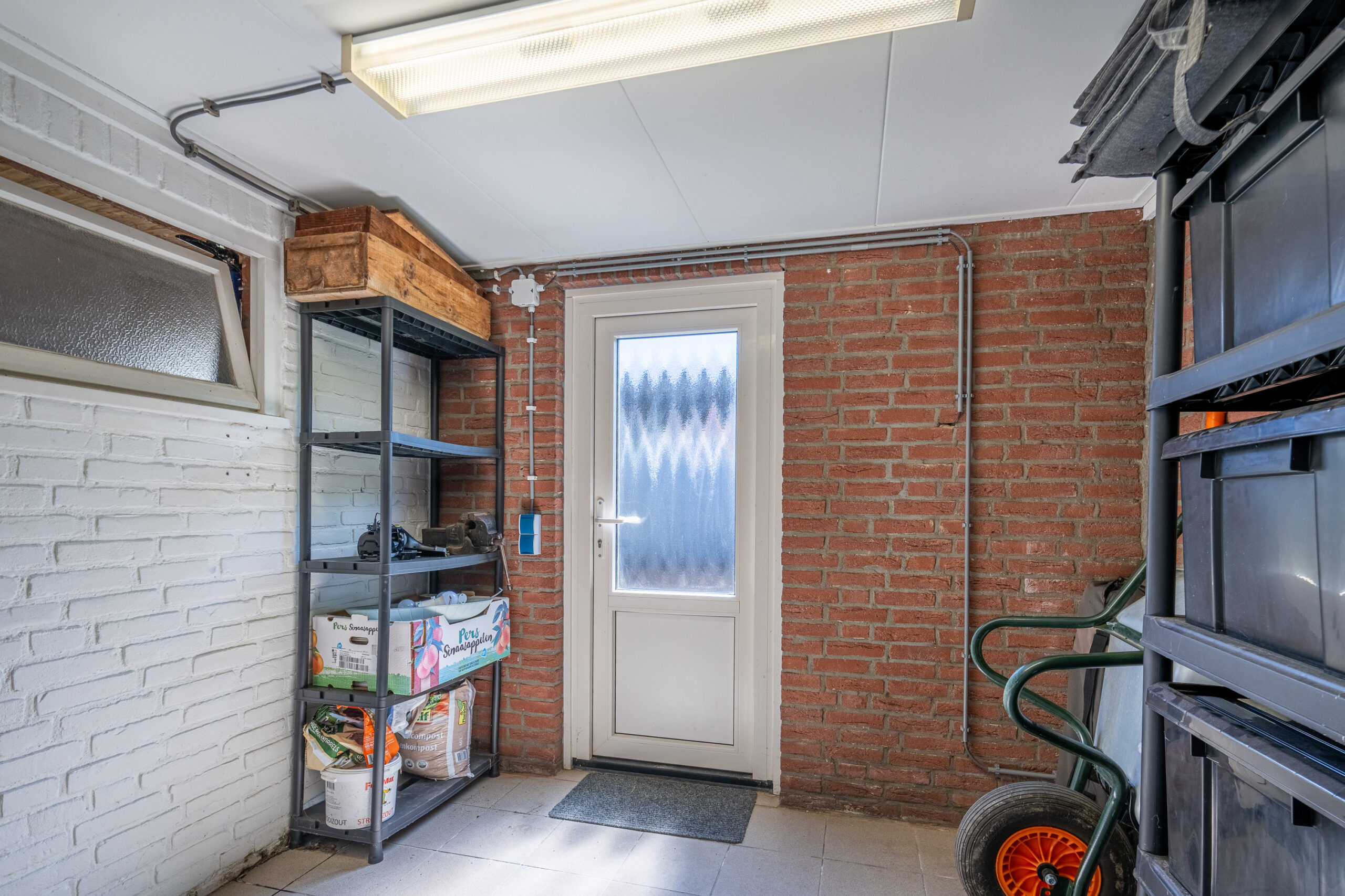 De diepe garage is voorzien van een elektrisch bedienbare sectionaalpoort en biedt voldoende ruimte voor een auto en meerdere motoren. Via een loopdeur is er directe toegang tot de tuin. Daarnaast is er een separate, betegelde berging, perfect voor het opbergen van tuinmeubilair, fietsen of hobbyspullen.