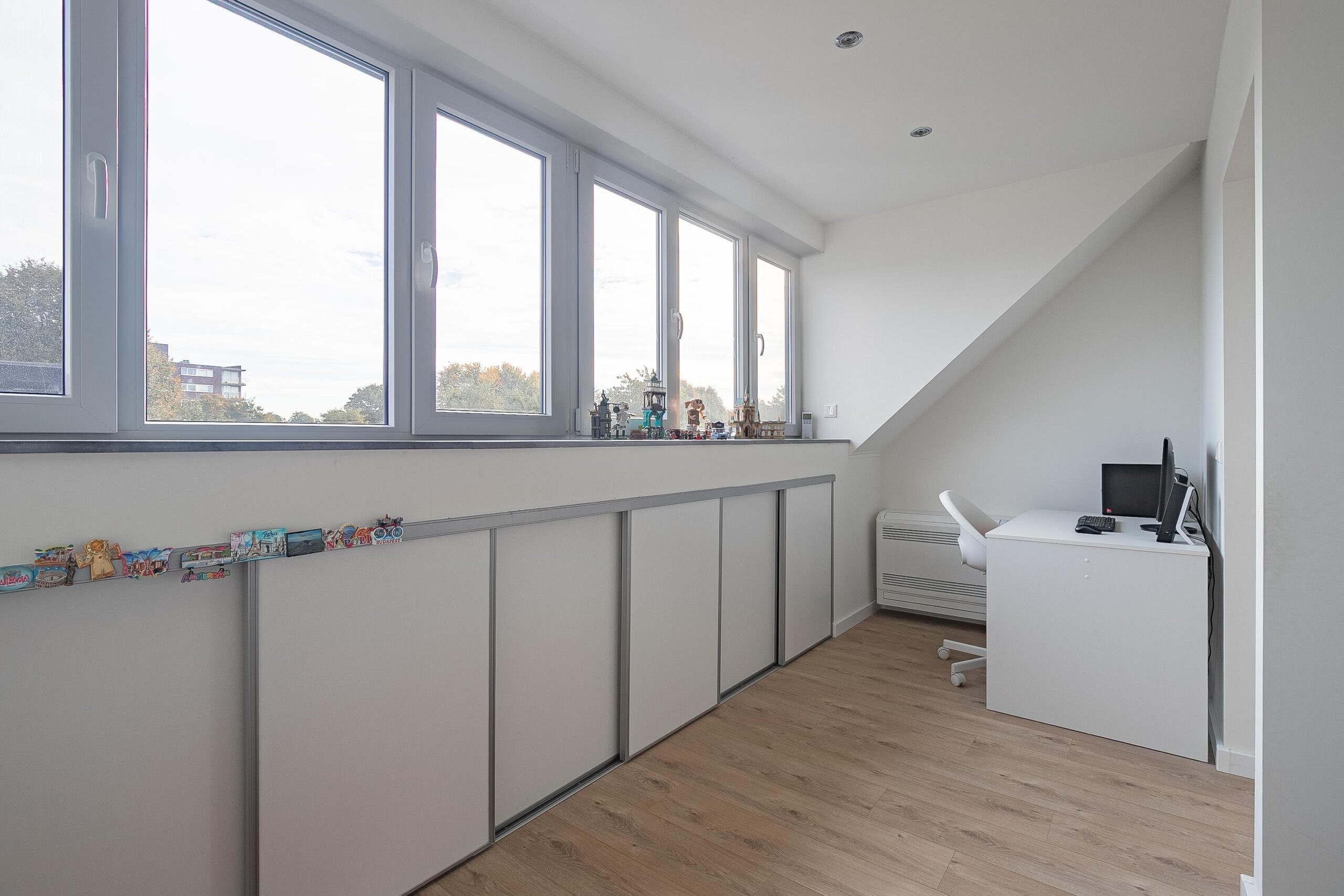 Overloop met toegang tot drie slaapkamers (ca. 12 m², 11 m² en 7 m²), alle voorzien van een donkere laminaatvloer. Vanuit de overloop is de ruime badkamer (ca. 8 m²) bereikbaar. De badkamer is volledig betegeld en uitgerust met een ligbad, tweede wandcloset, wastafelmeubel en inloopdouche. Ook deze verdieping is voorzien van airconditioning.