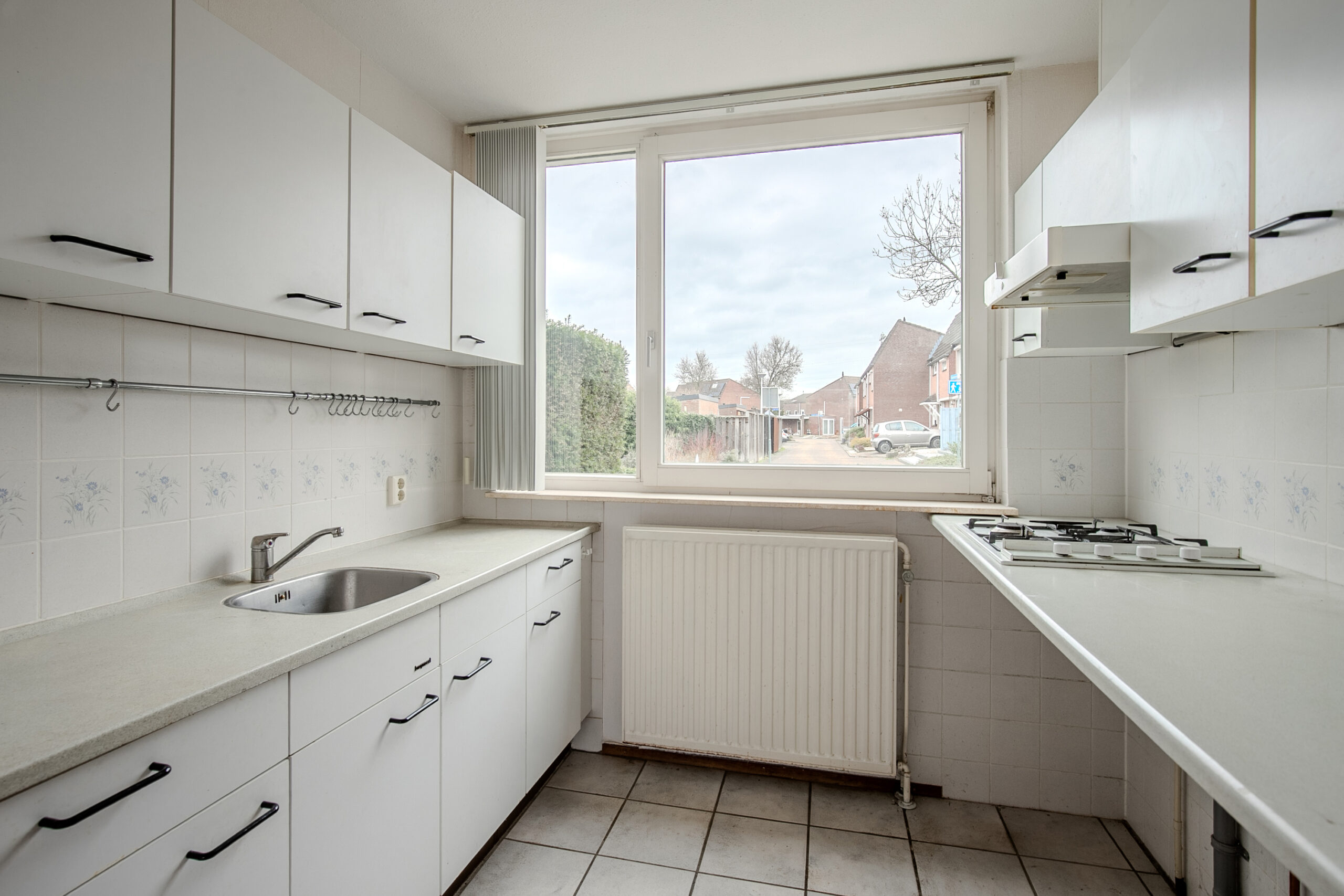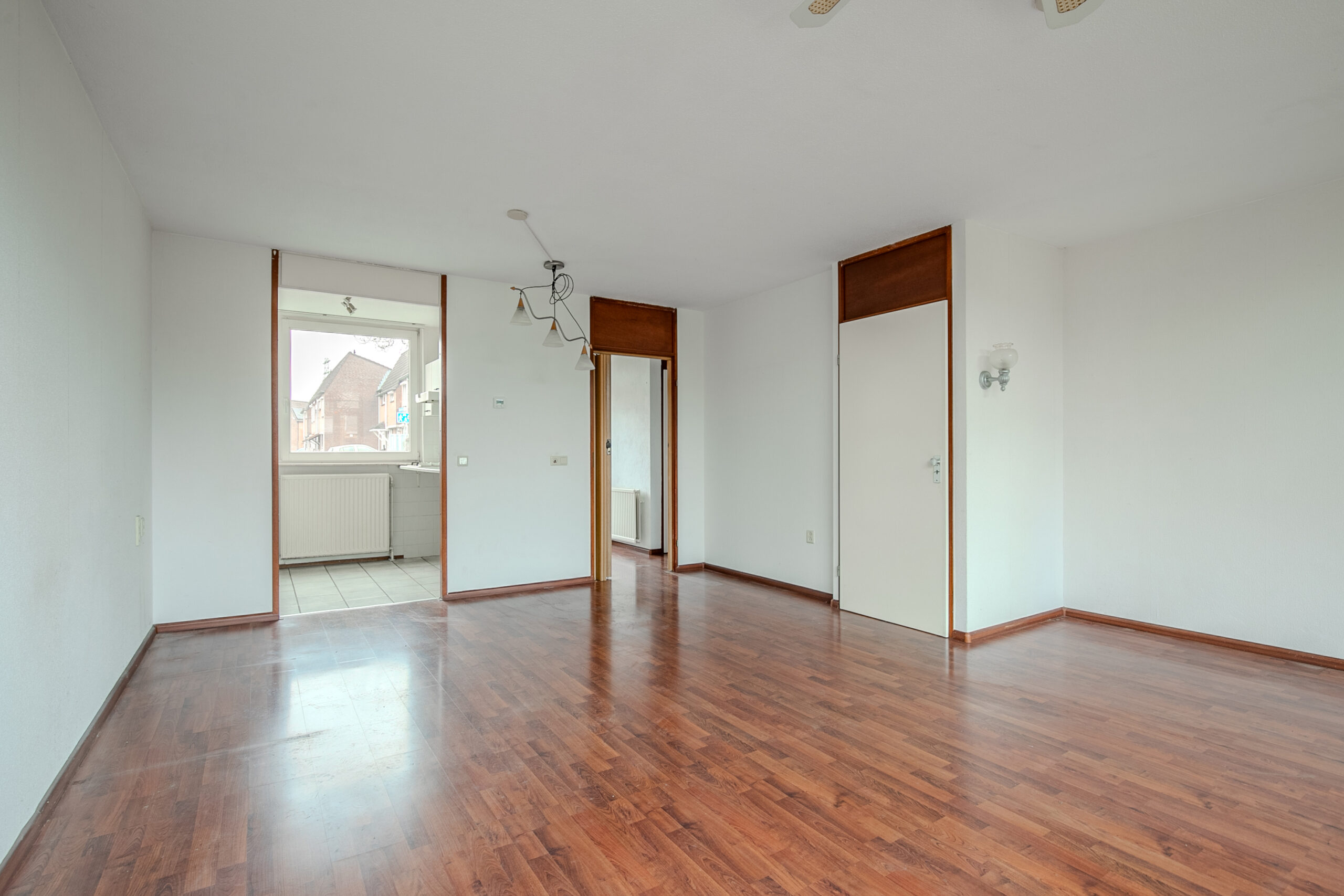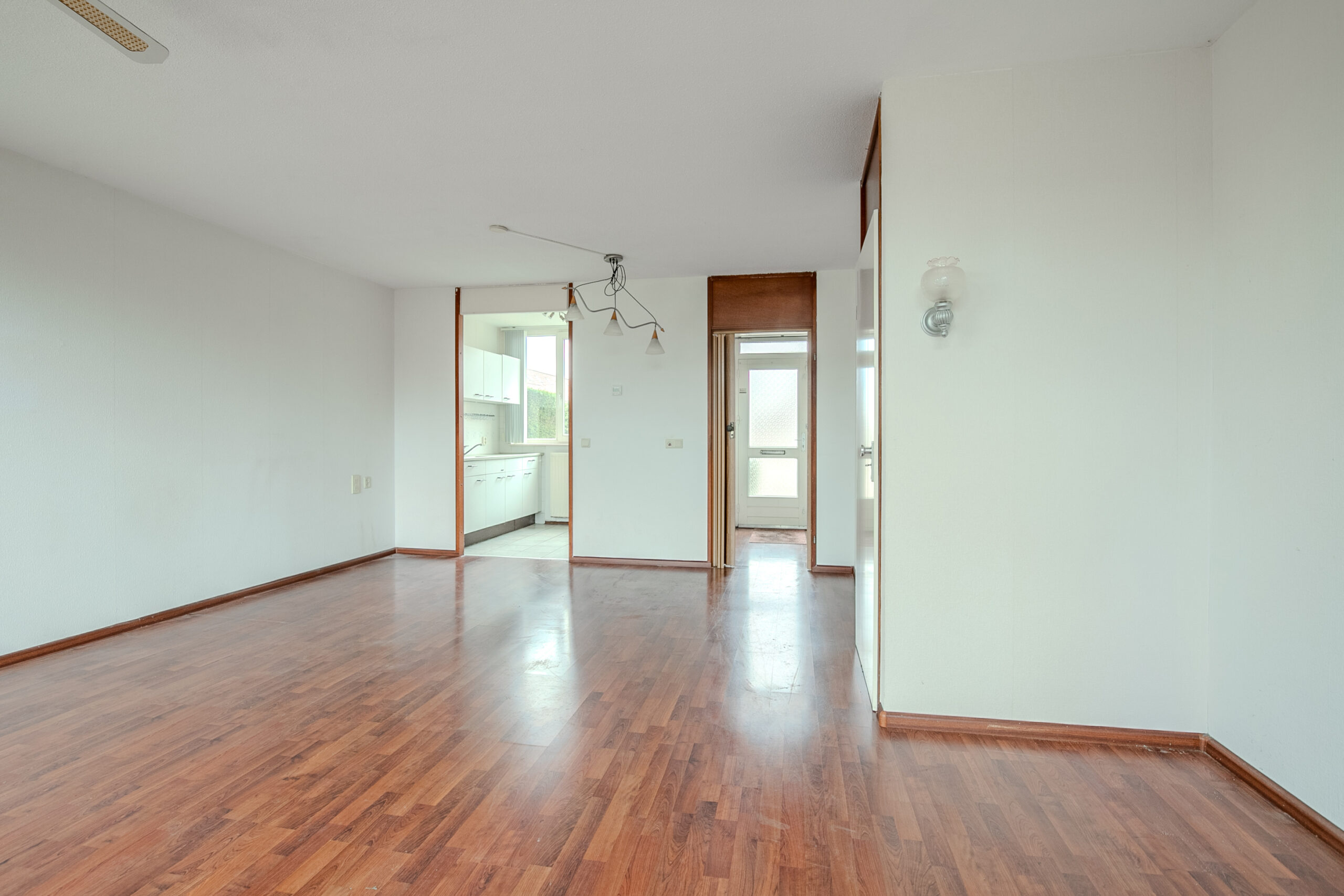 Vanuit de hal bereikt u de woonkamer met berging en de halfopen keuken. De woonkamer is voorzien van een laminaatvloer en geniet een goede mate van daglichttoetreding door de raampartijen aan weerszijde van de woning. De halfopen keuken is voorzien van een eenvoudige keukeninstallatie aan weerszijde.