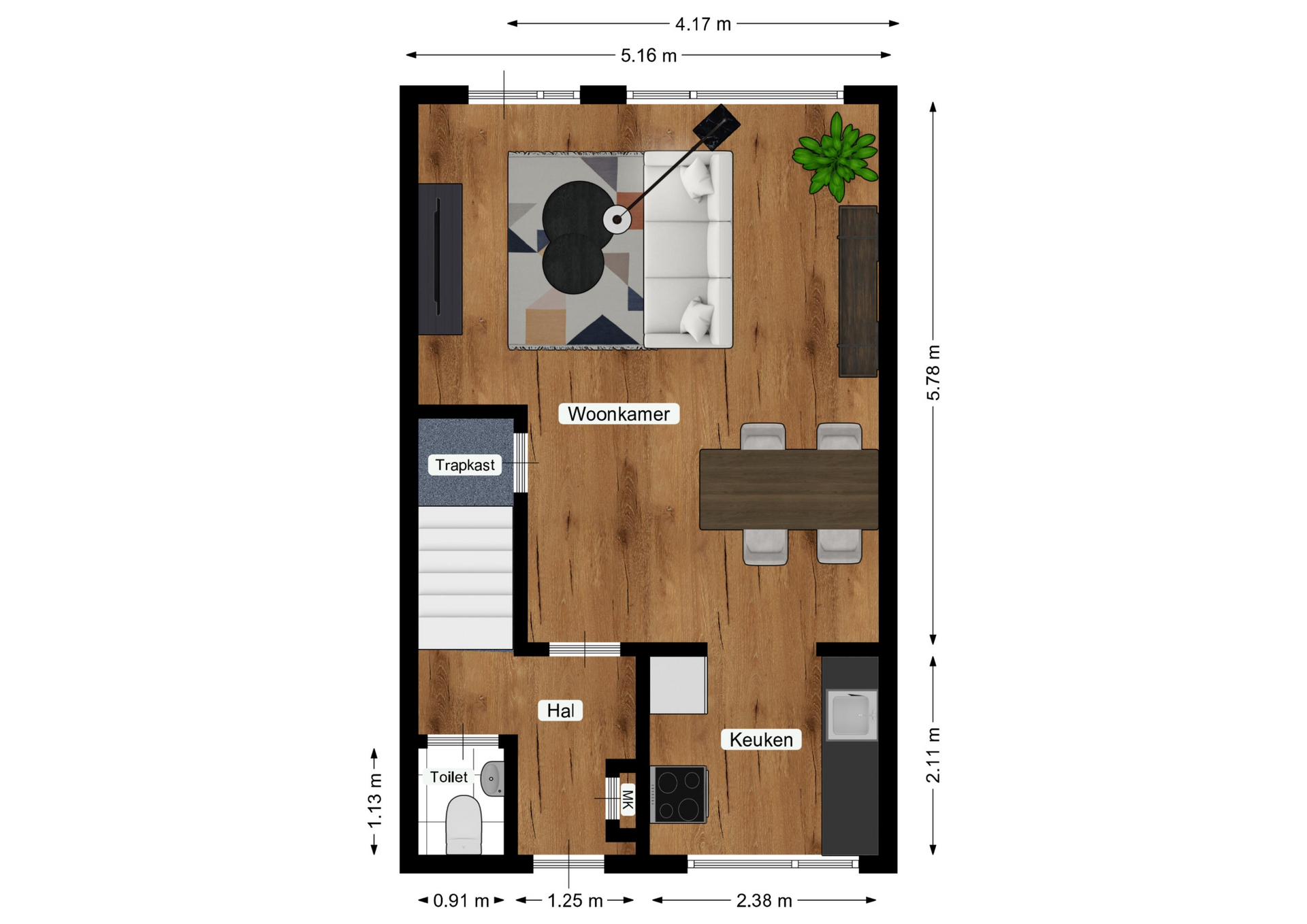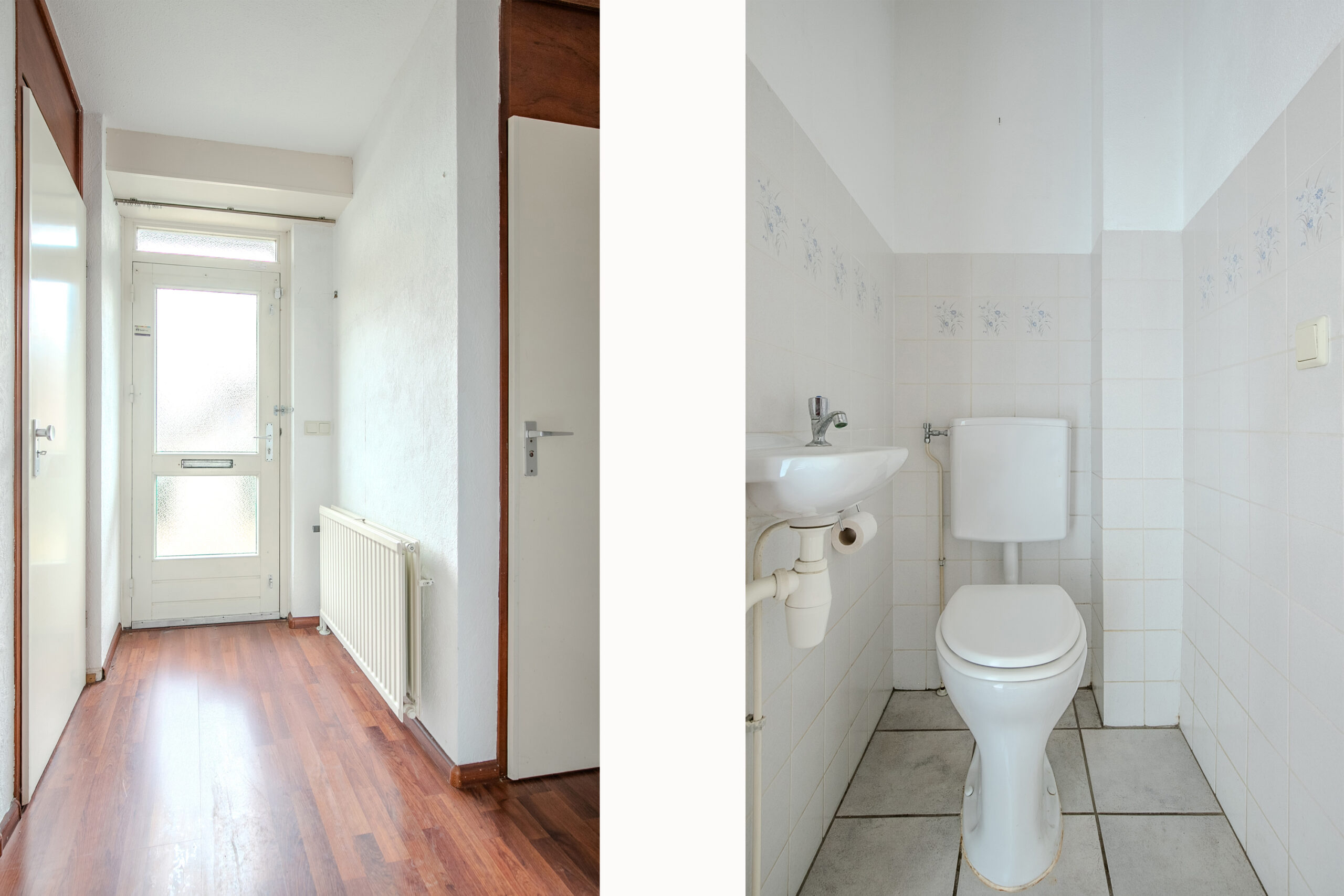 Via de voortuin bereikt u de entree van de woning. De hal biedt toegang naar de toiletruimte met zwevend toilet en trapopgang naar de eerste verdieping.