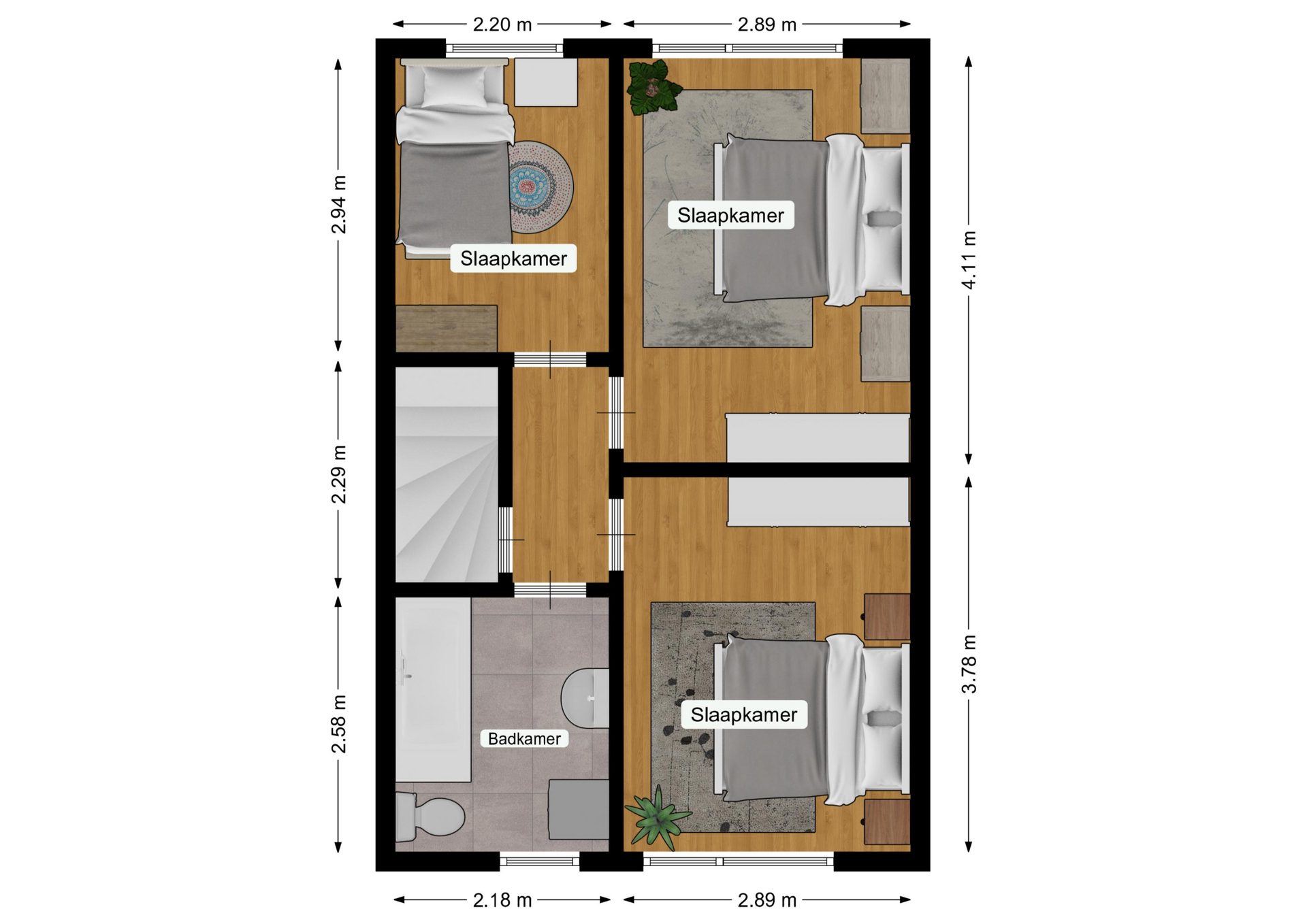 Overloop met toegang naar drie slaapkamers. De slaapkamers zijn respectievelijk 12m2, 11m2 en 6.5m2 groot, waarvan twee slaapkamers zijn voorzien van laminaatvloer en de andere met vloerbedekking.