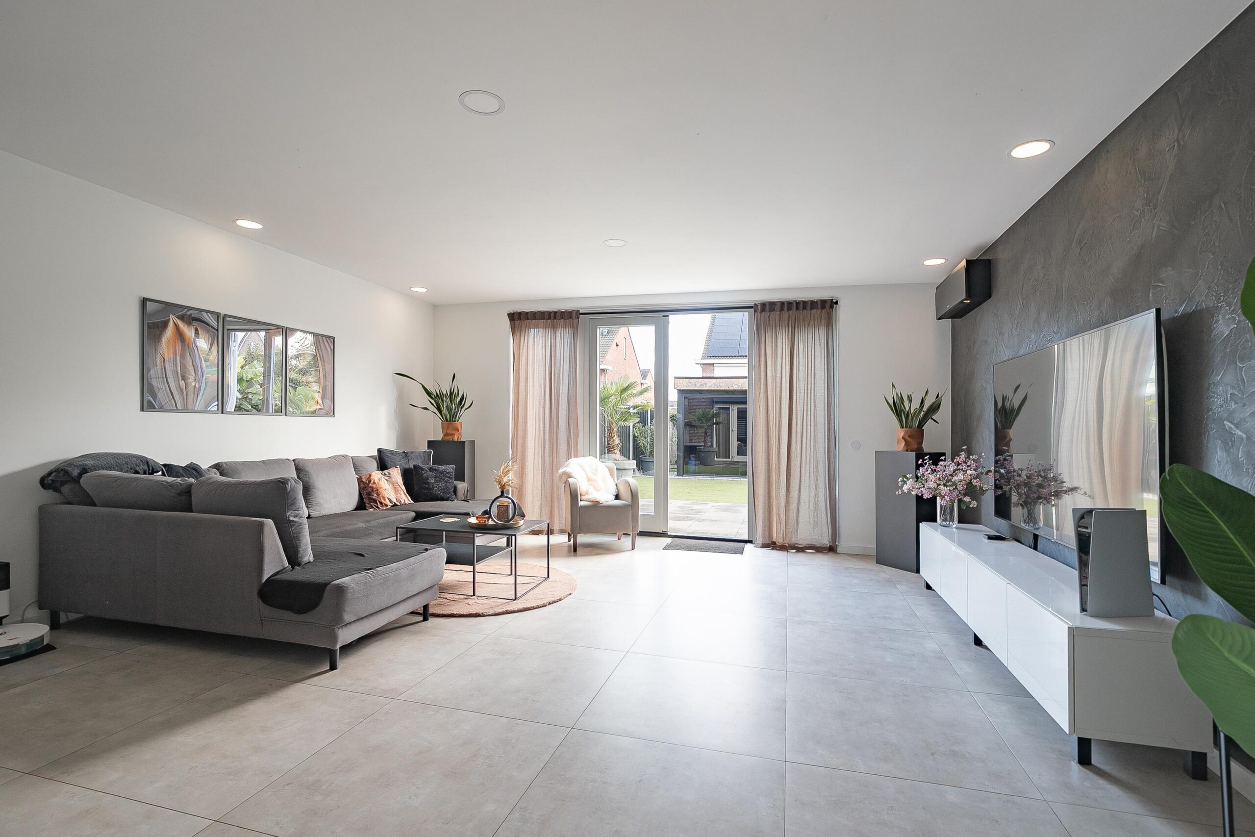 Via een glasdeur toegang naar de ruime woonkamer met aanbouw, veel lichtinval, airco installatie berging, plavuizenvloer eveneens met vloerverwarming en openslaande deuren naar de tuin.