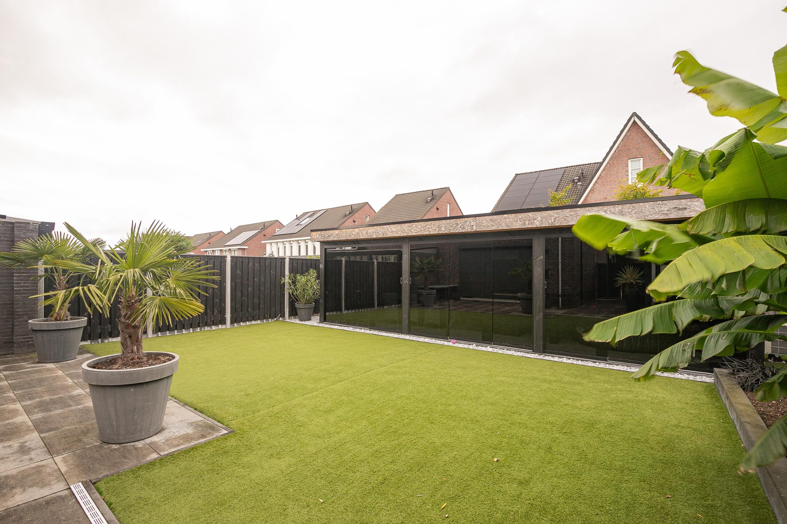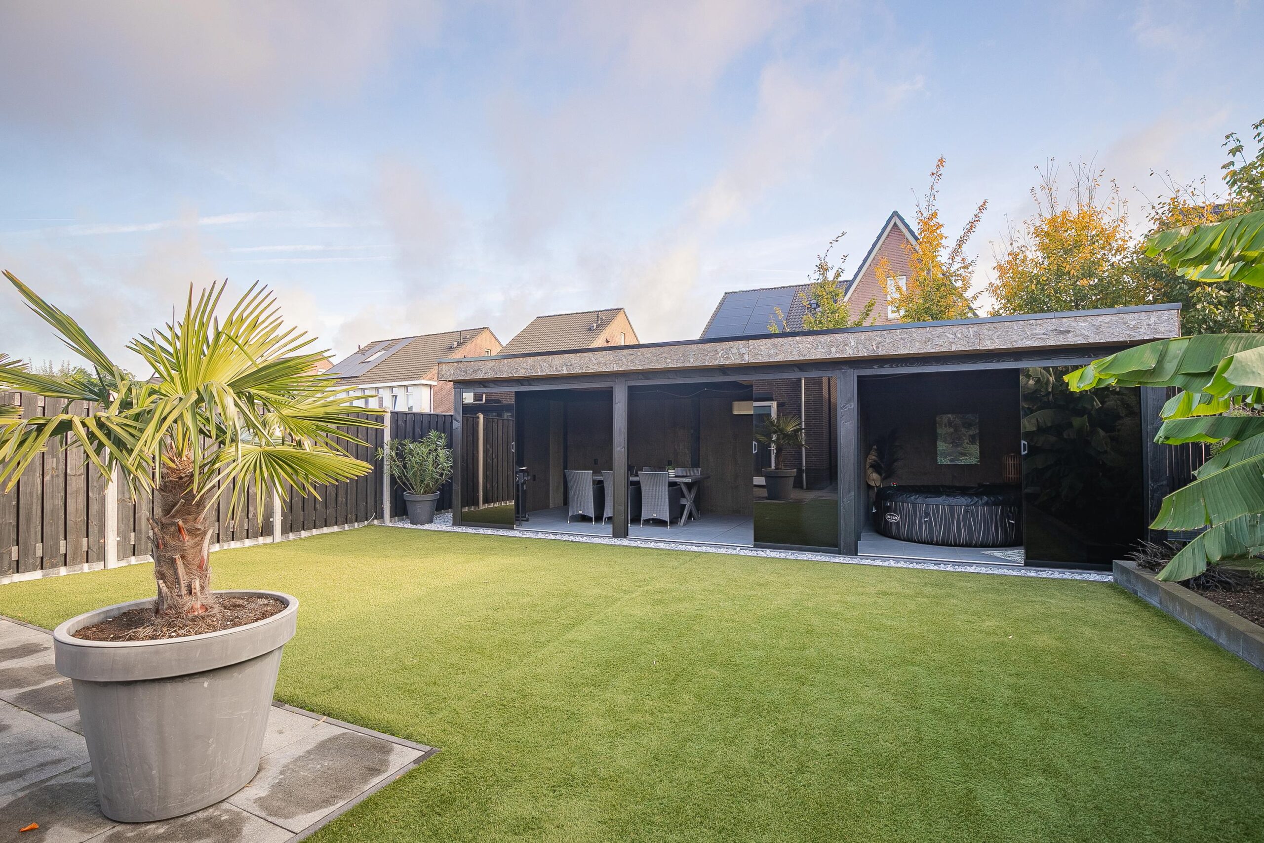 Terras, tuin en een prachtige zeer groot tuinhuis met isolatie, aparte meterkast met krachtstroom, airco installatie, aparte mechanische ventilatie, bar en jacuzzi.