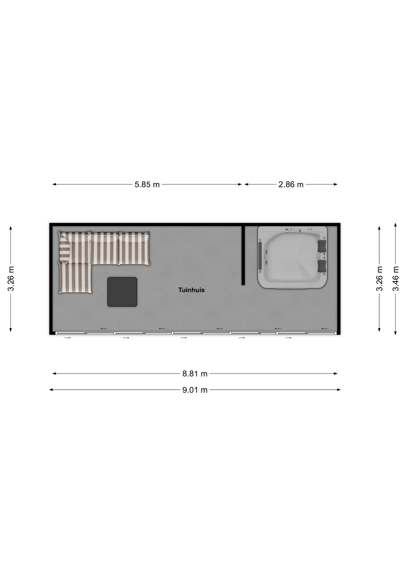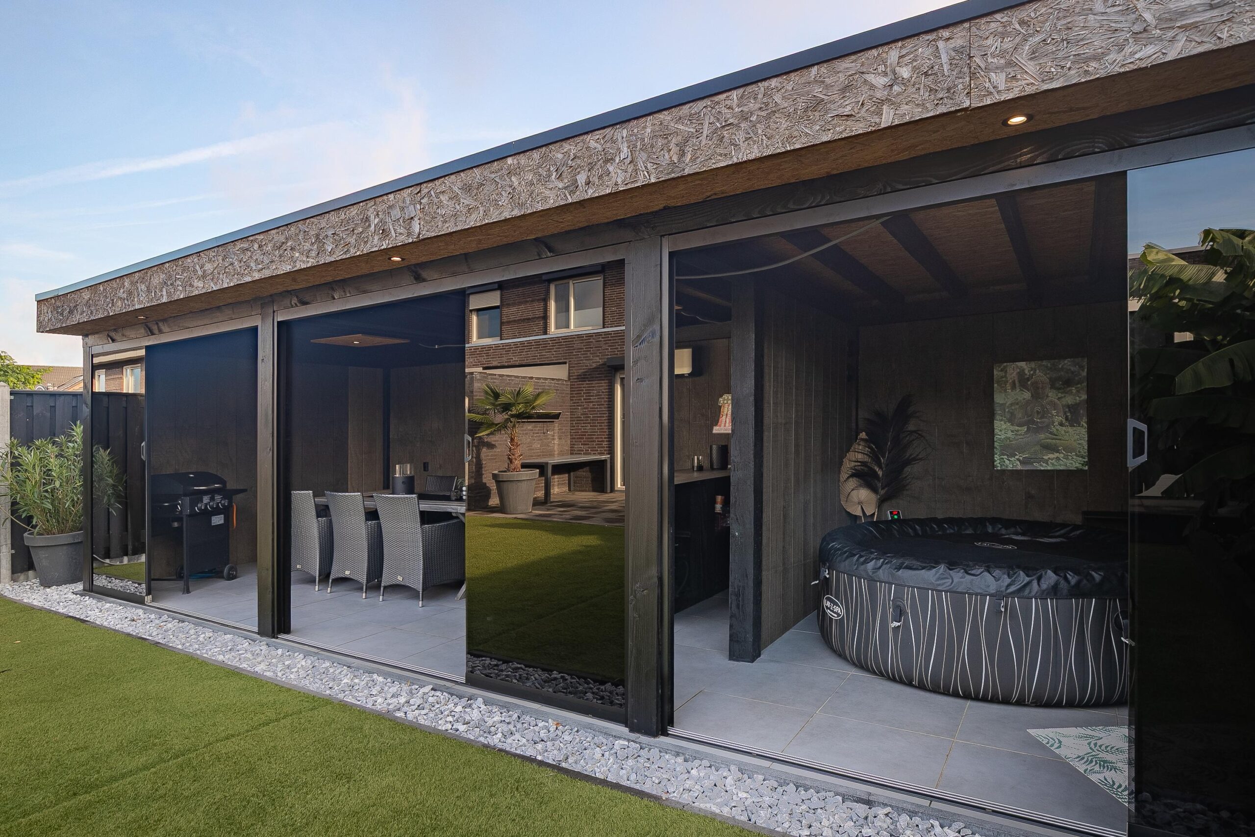 – Zeer groot tuinhuis met isolatie, glasdeuren, meterkast, bar en jacuzzi.