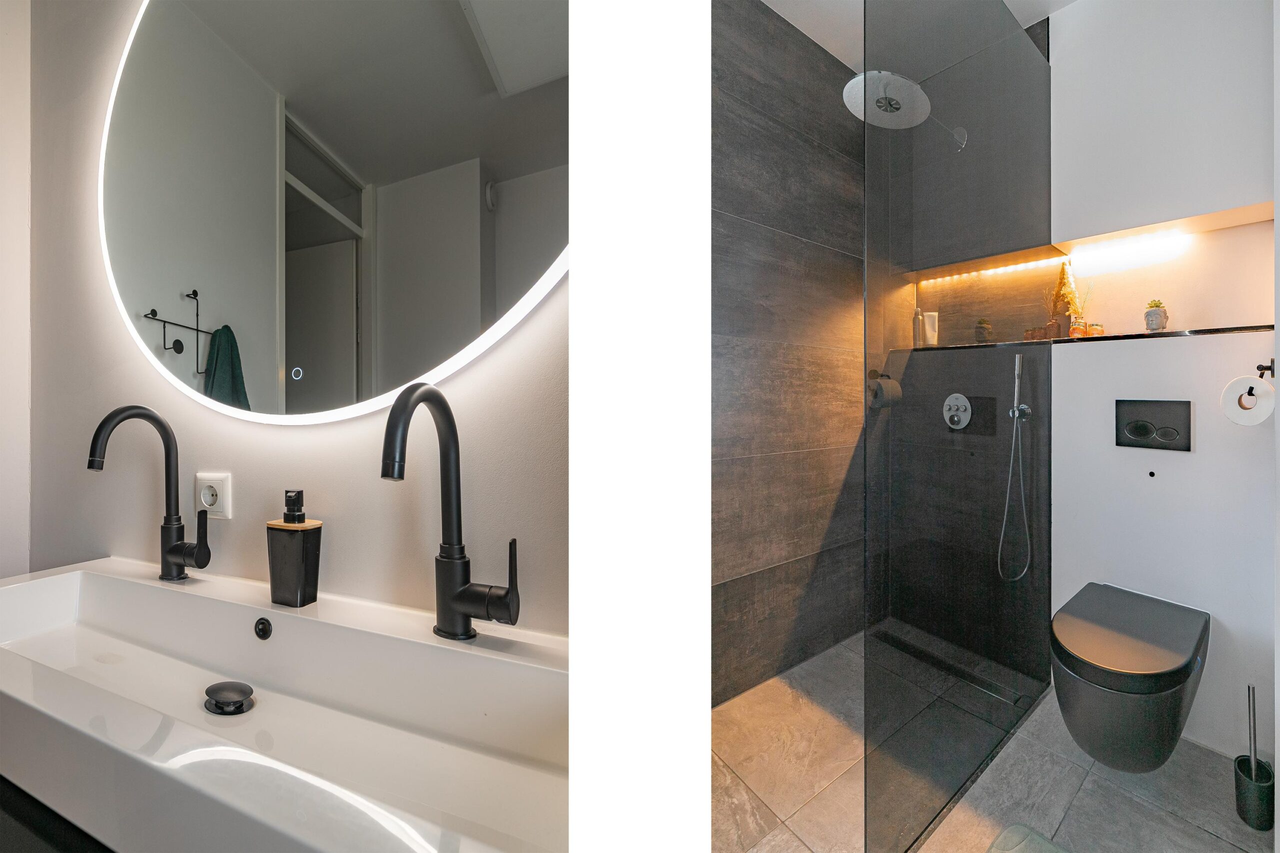 Prachtige badkamer eveneens met vloerverwarming, inloopdouche, 2e zwevend toilet en badmeubel met