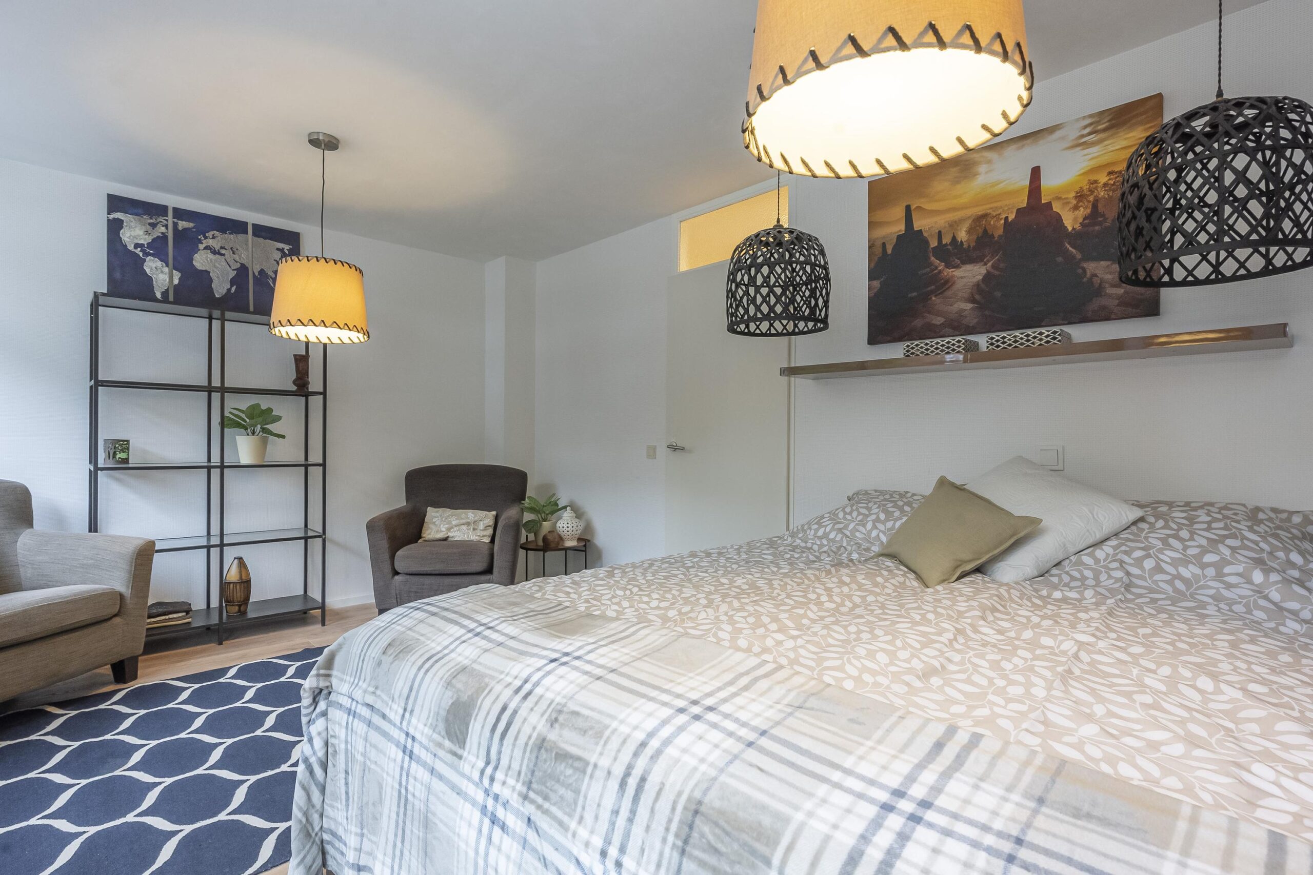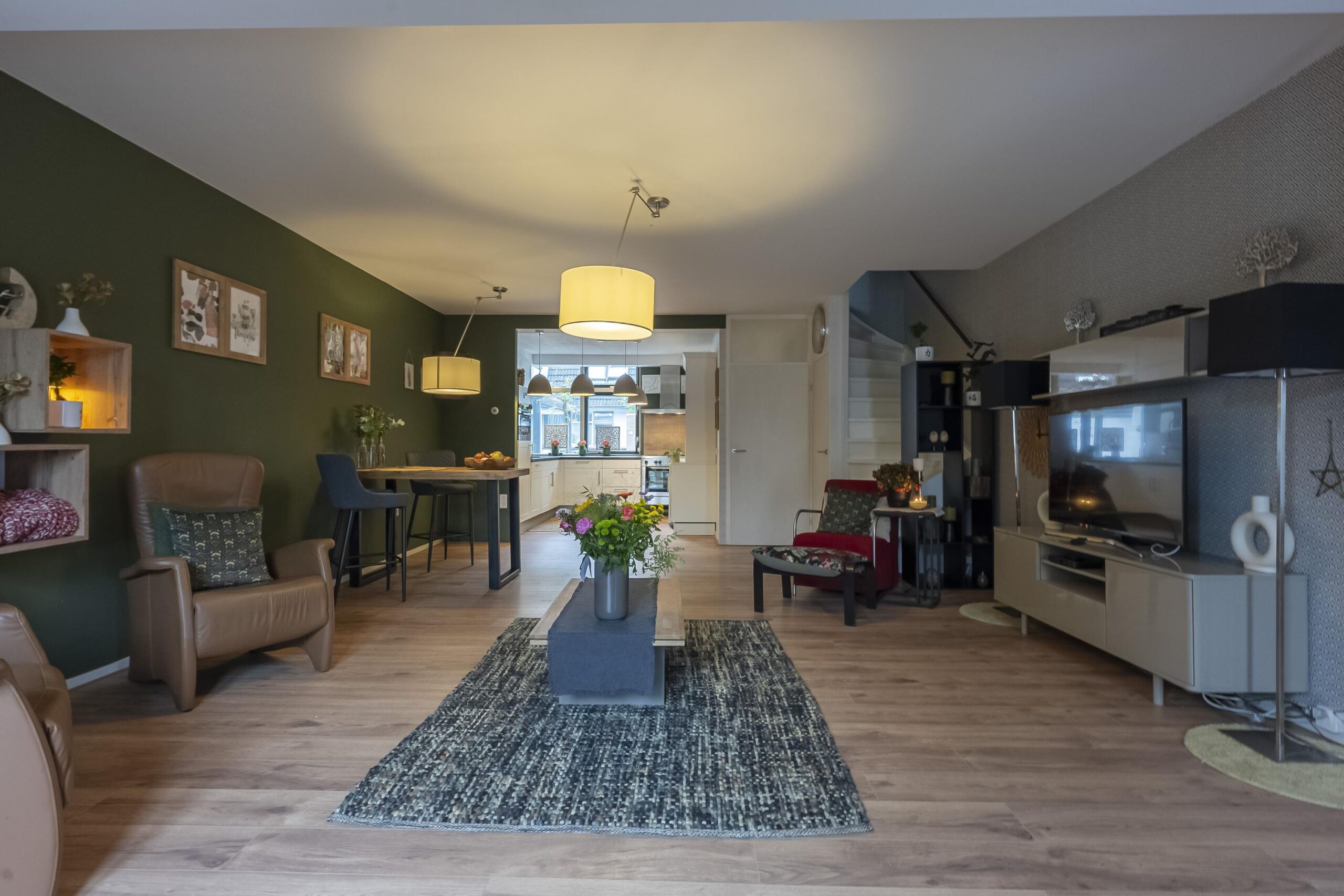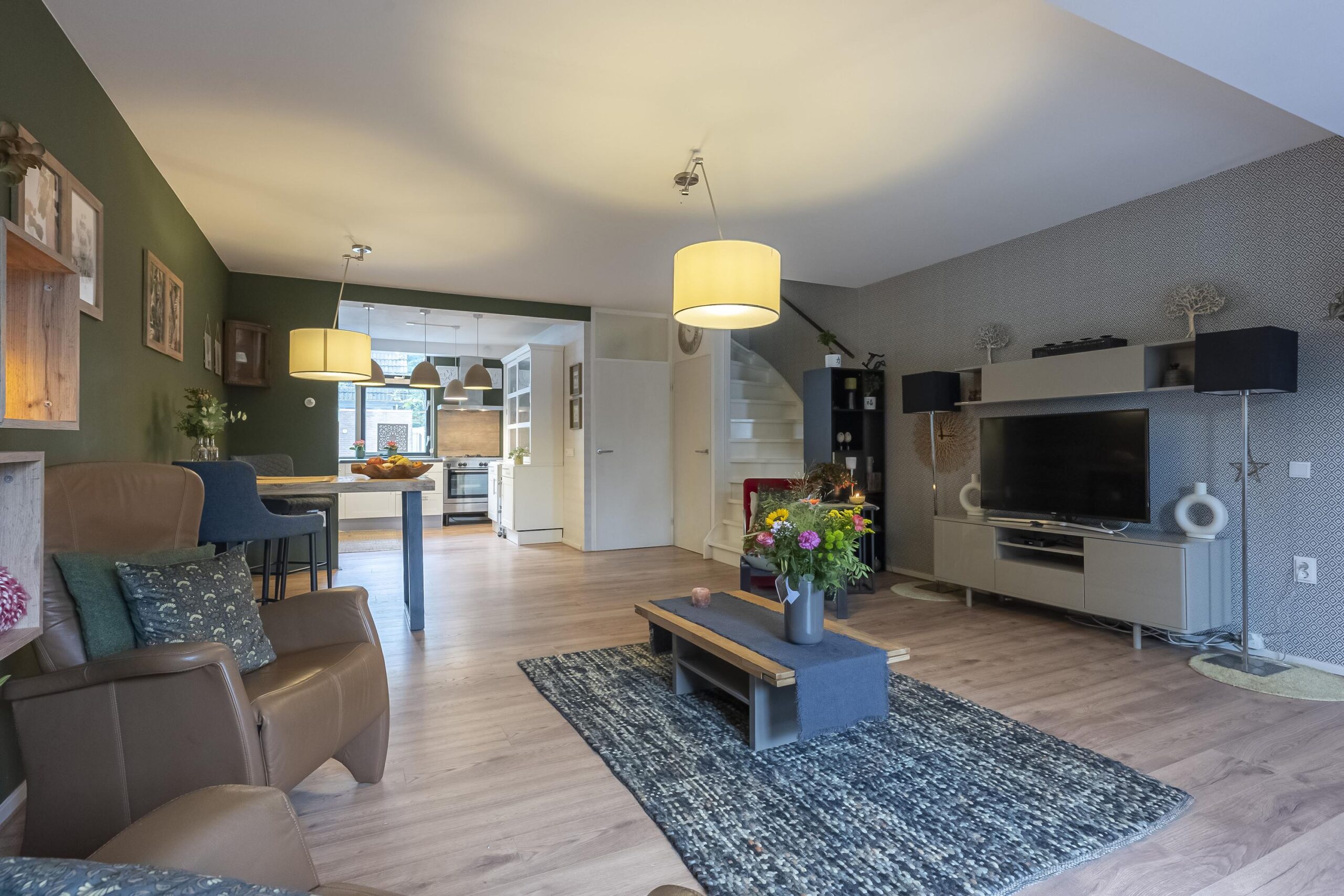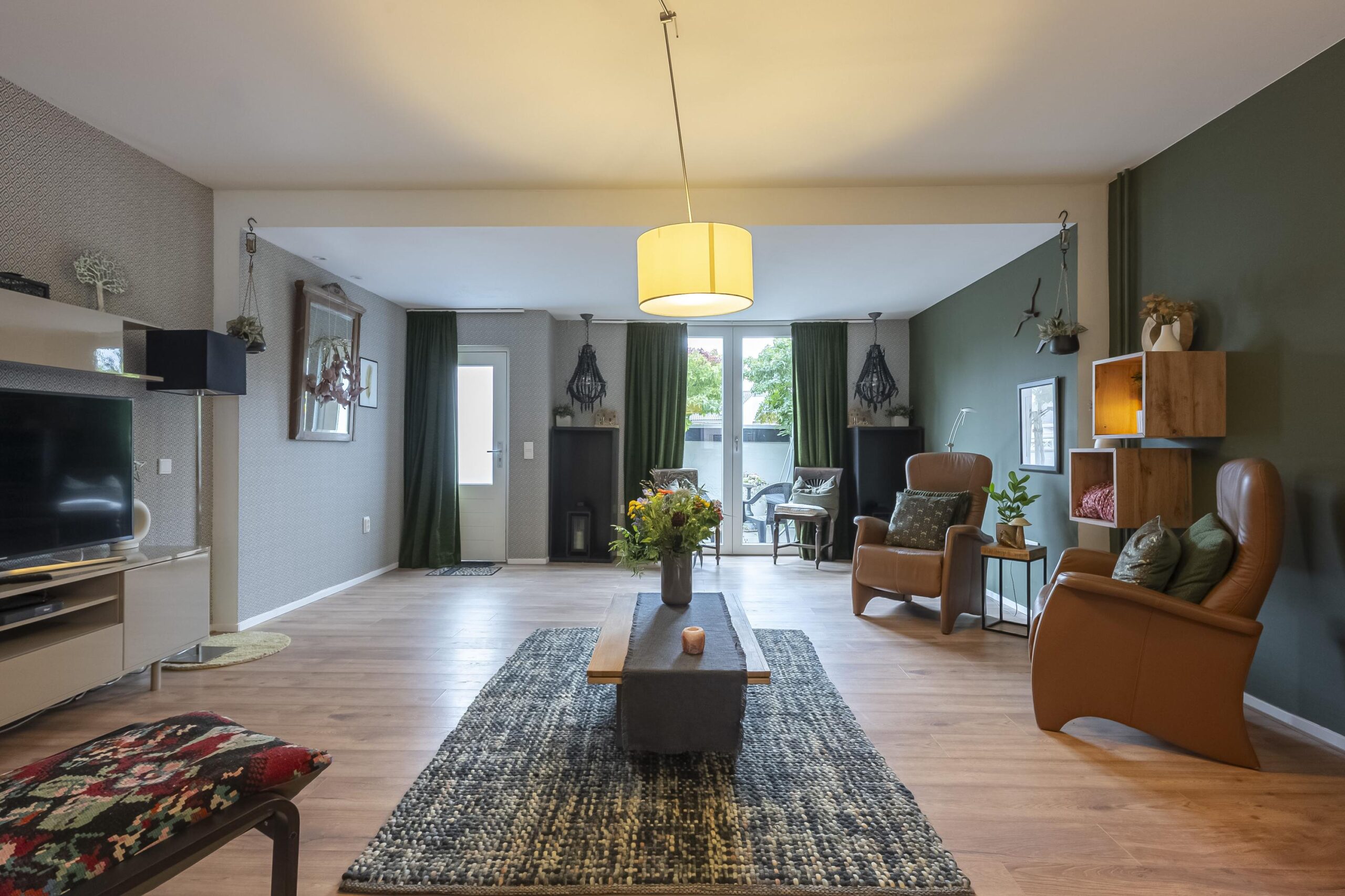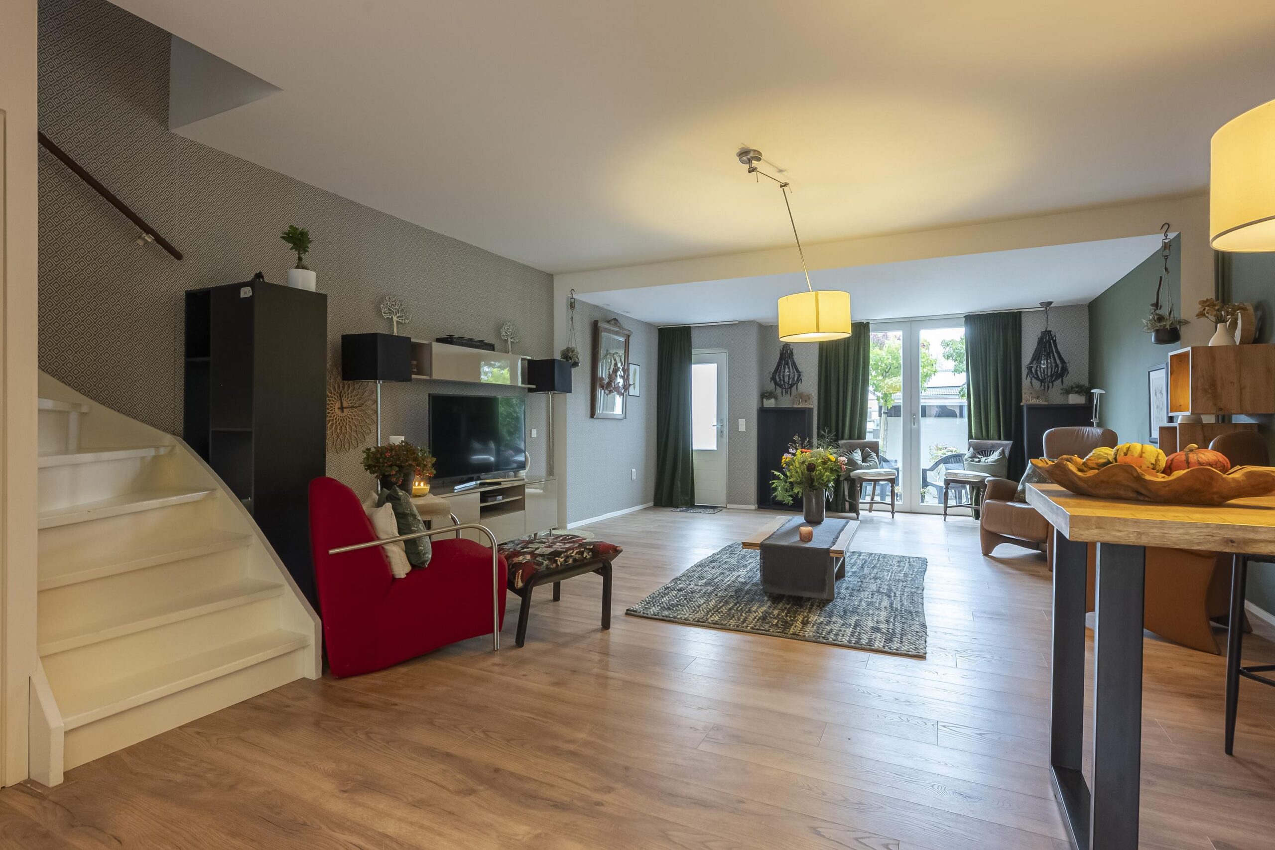 In de woonkamer met dichte trap is onder de trap een trapkast gerealiseerd. En zijn er tuindeuren welke u toegang geven tot de tuin.