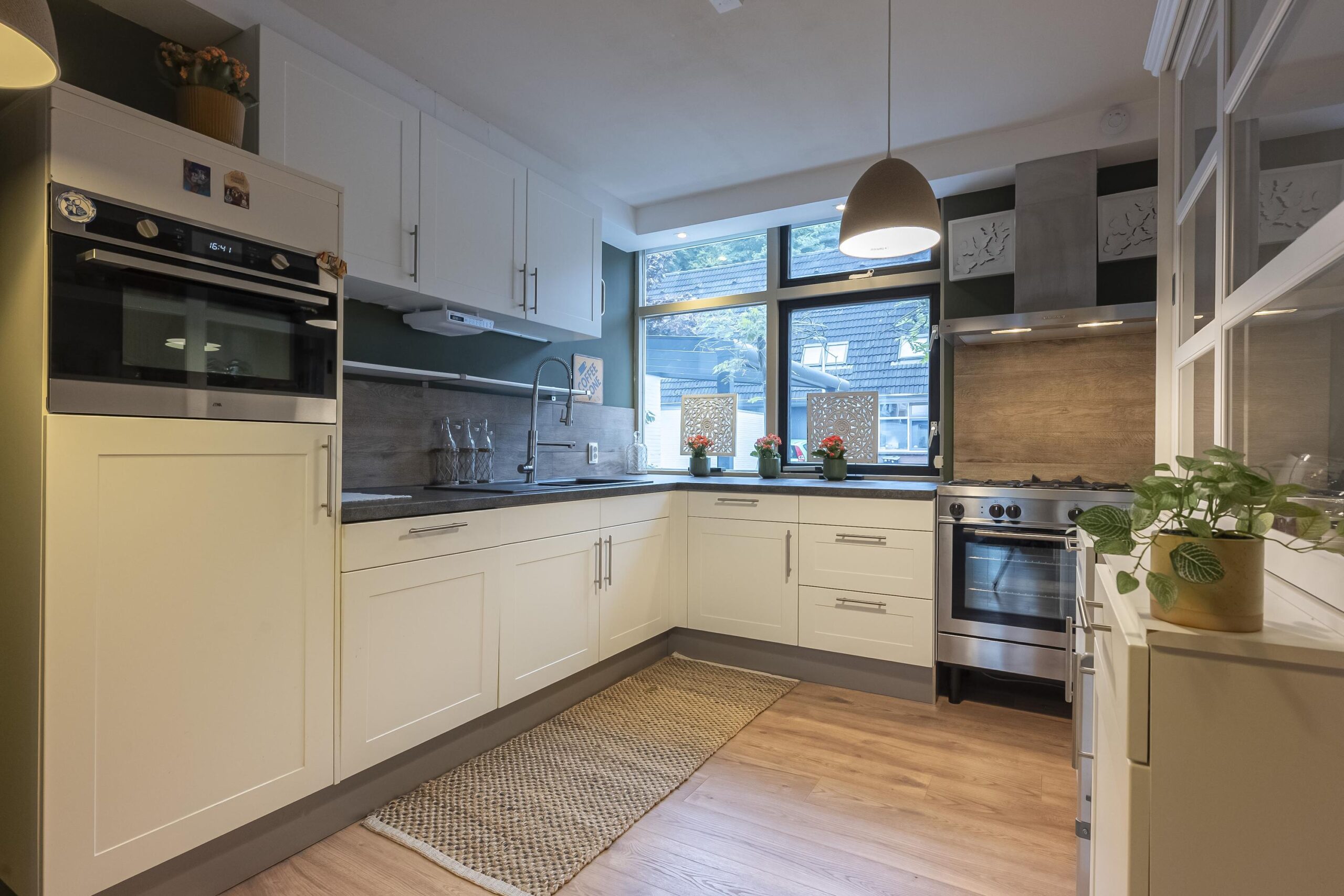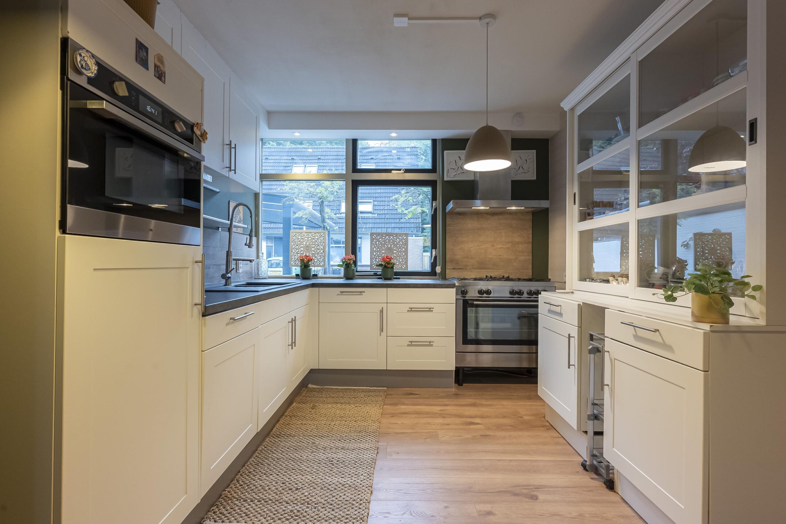 De keuken is voorzien van een hoekopgestelde keukeninrichting met extra diepe werkbladen (90 cm) en de navolgende apparatuur: grote 5-pits gaskookplaat, oven, vaatwasser, elektrische combi-oven en koelkast.