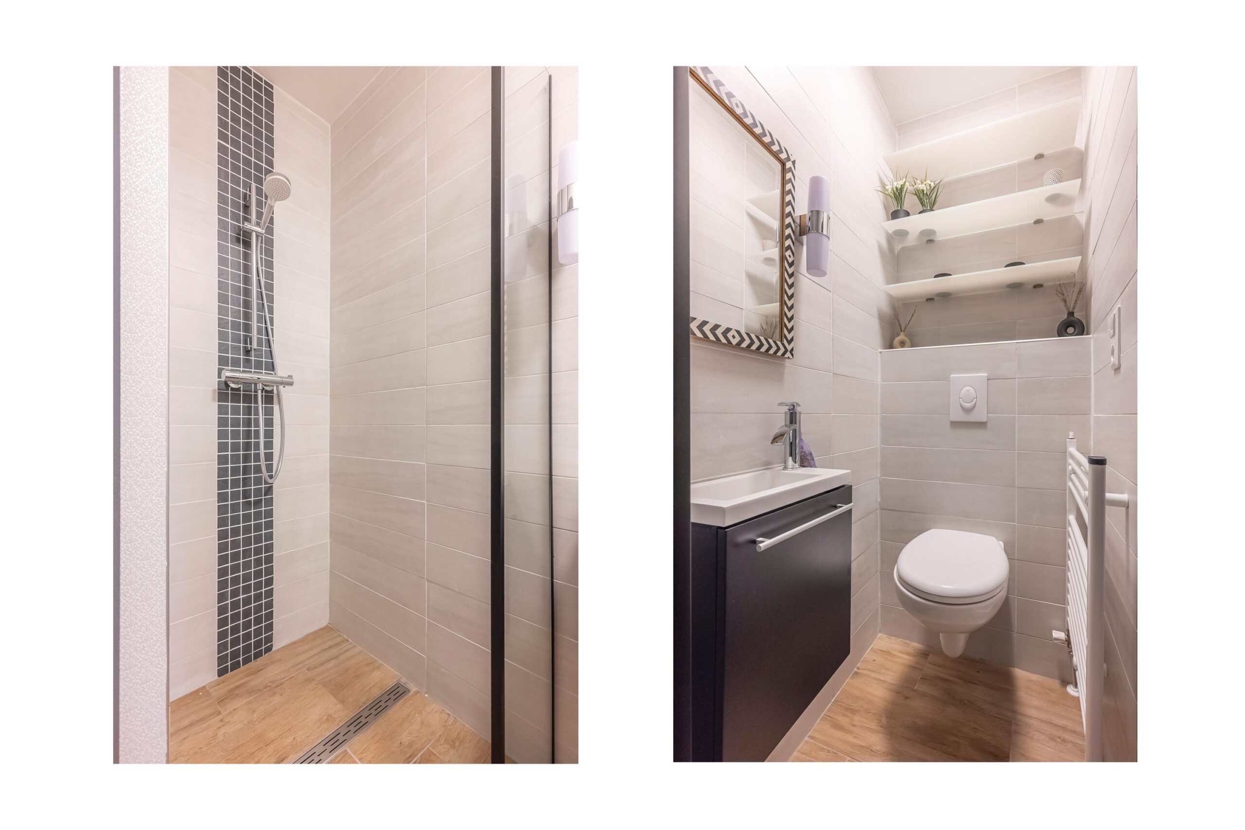 In de hal met meterkast is een grote toiletruimte/badkamer met een zwevend toilet, inloopdouche met thermostaat douchemengkraan en wasbakje.