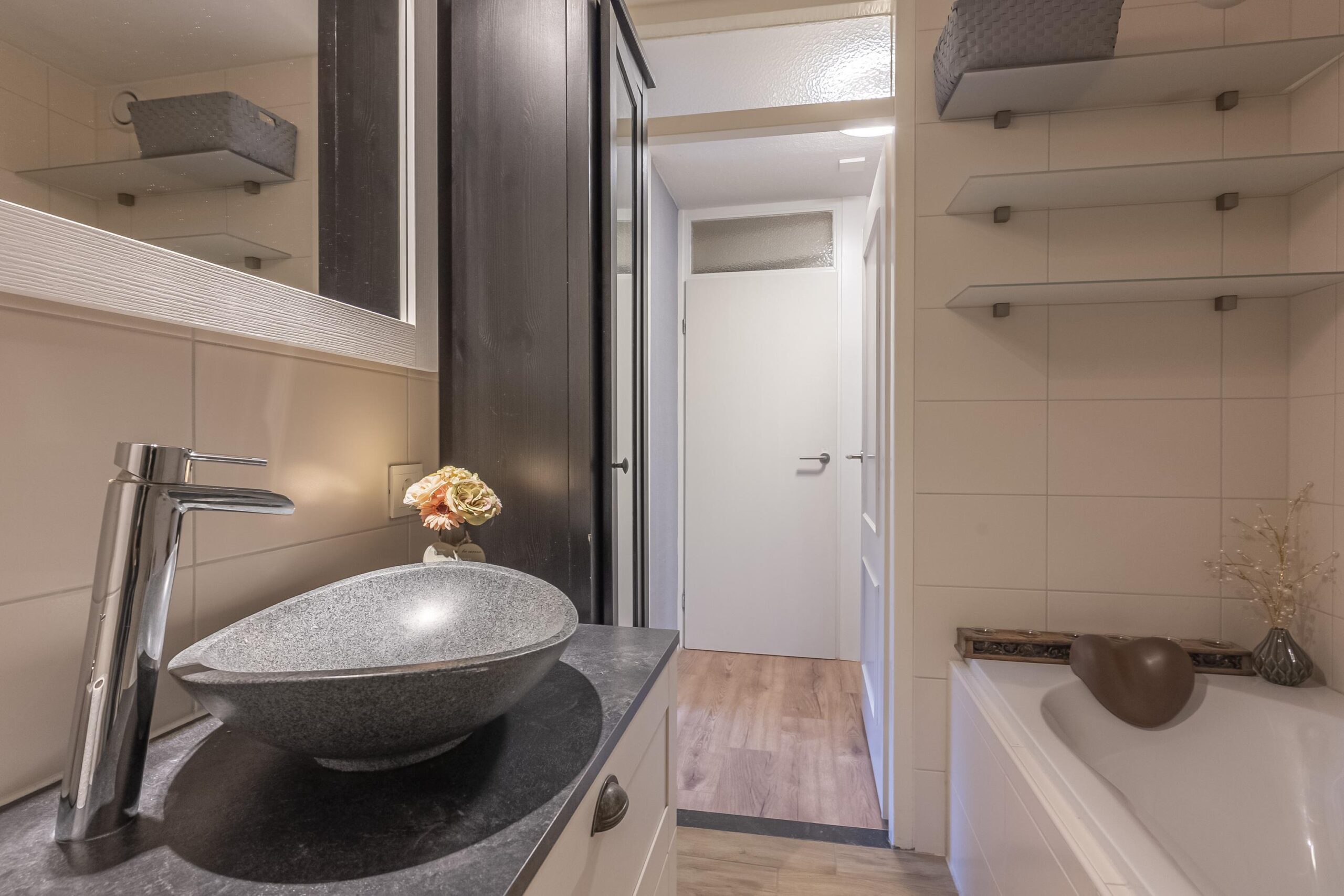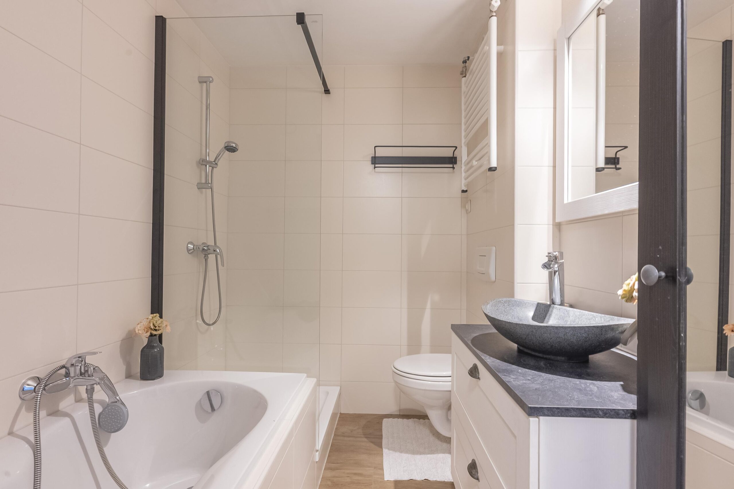 De badkamer is groot ca. 5 m² en is voorzien van een vaste wastafel met meubel en hangkast, douche, ligbad en een zwevend toilet.