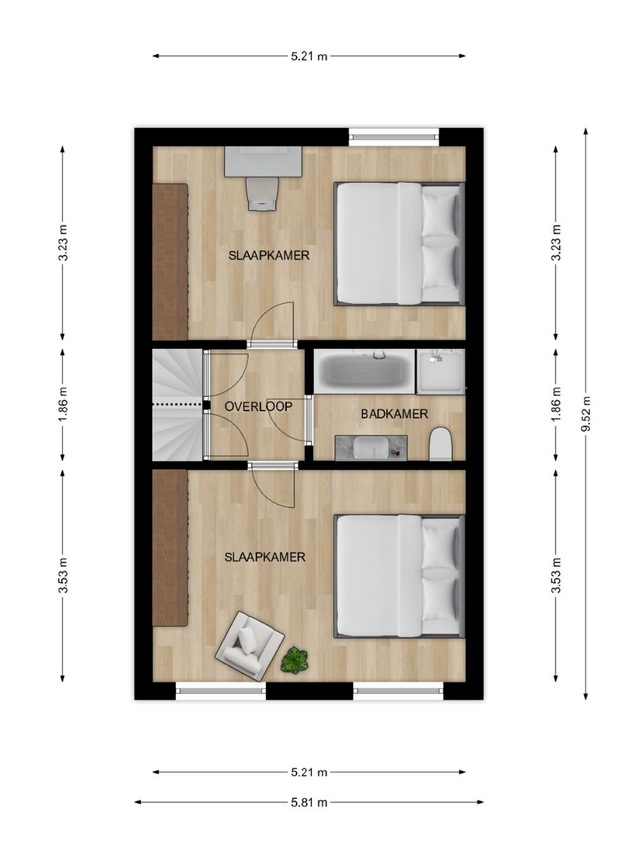 Middels de overloop heeft u toegang tot de 2 ruime slaapkamers en geheel betegelde badkamer.