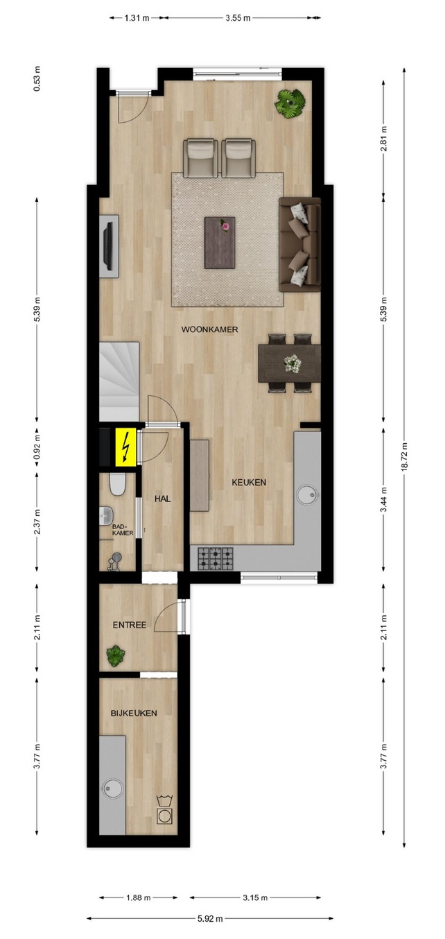 Middels de hal/entree heeft u toegang tot de bijkeuken aan de voorzijde. Deze ruimte is groot ca. 7 m² alwaar de aansluiting voor de wasmachine gerealiseerd is.