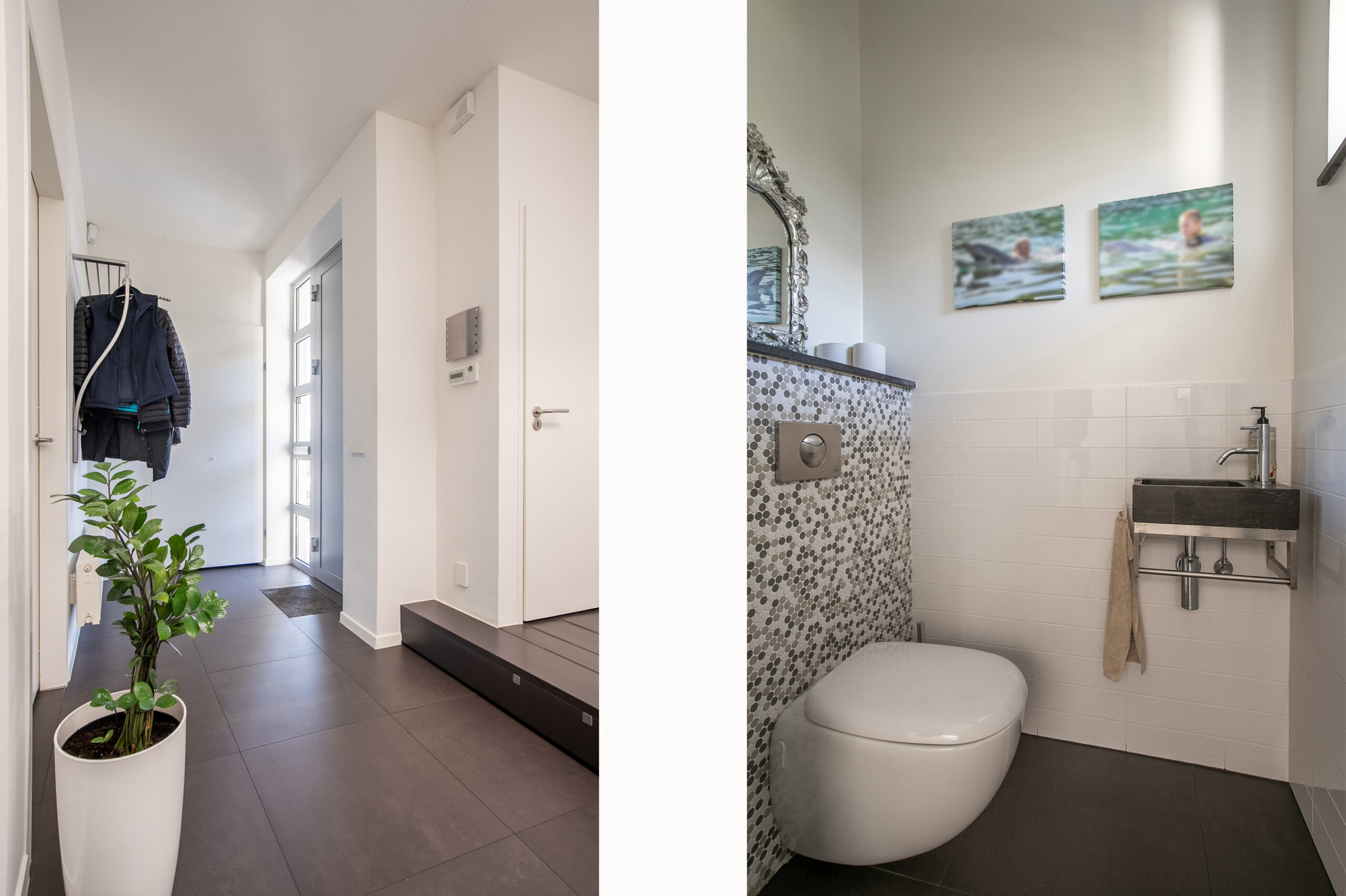 Via de fraai aangelegde voortuin bereikt u de overdekte entree van de woning. De ruime ontvangsthal is strak afgewerkt en biedt toegang tot de garderobe, moderne toiletruimte met zwevend toilet en fontein, de meterkast, de trapopgang naar boven én het souterrain.