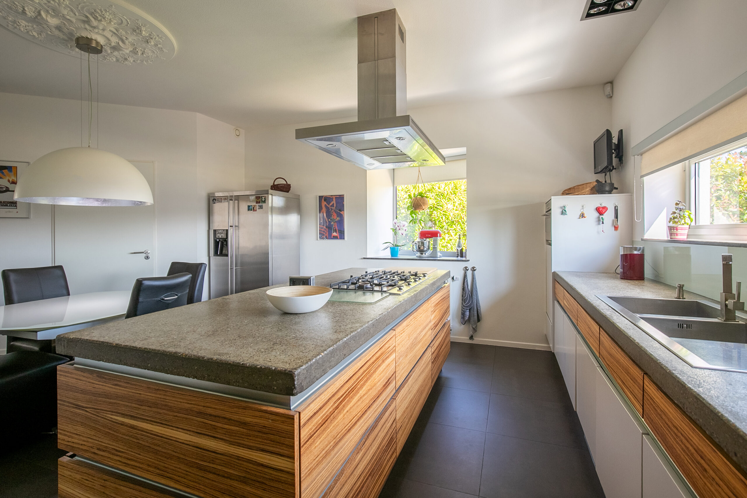 Aan de voorzijde ligt de moderne open keuken, stijlvol ingericht met een wand- en eilandopstelling en voorzien van hoogwaardige inbouwapparatuur: een 5-pits gasfornuis, rvs afzuigkap, oven, magnetron, vaatwasser en rvs spoelbak met mengkraan. Vanuit de keuken kijkt u vrij uit over het groene plantsoen aan de overkant van de straat.