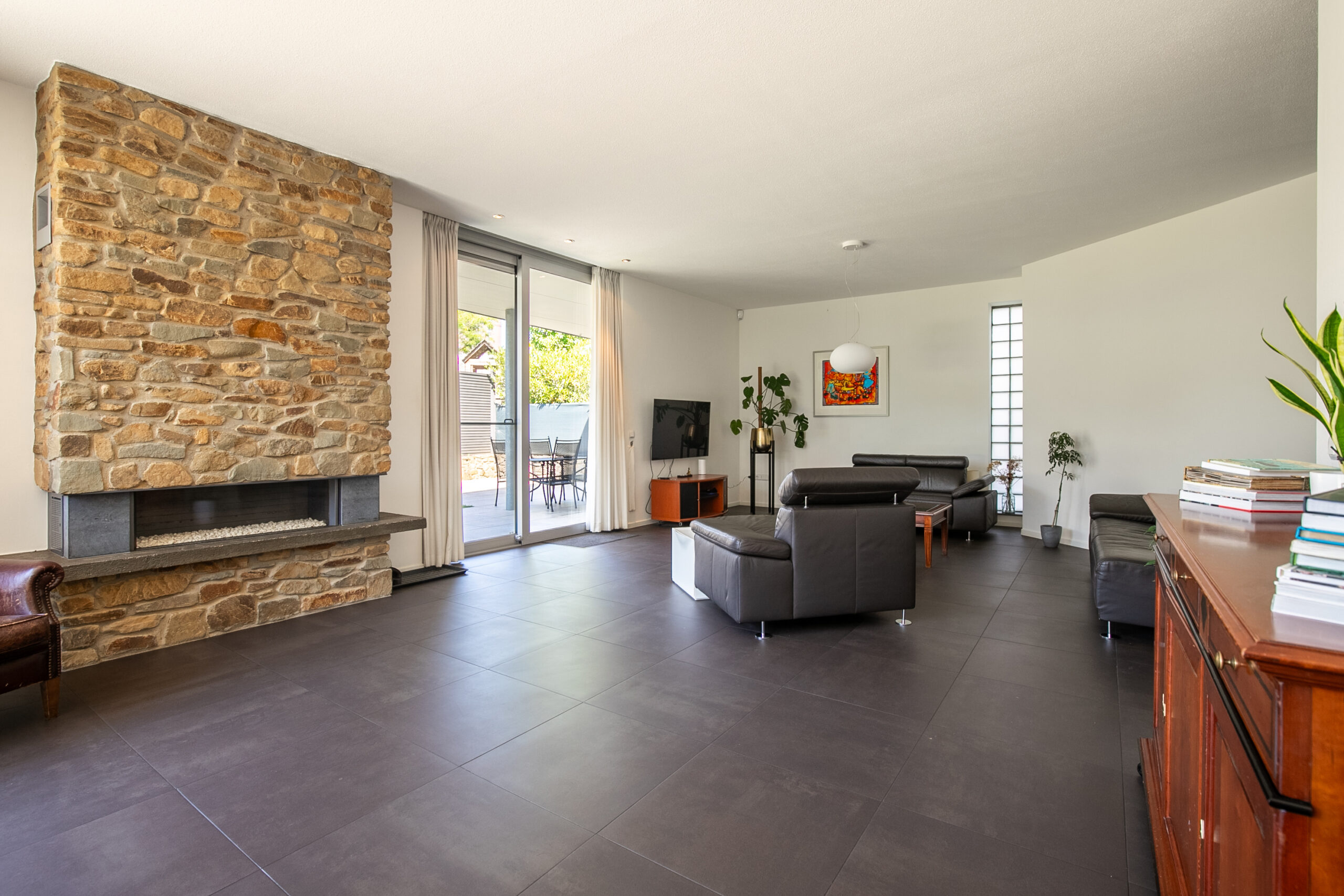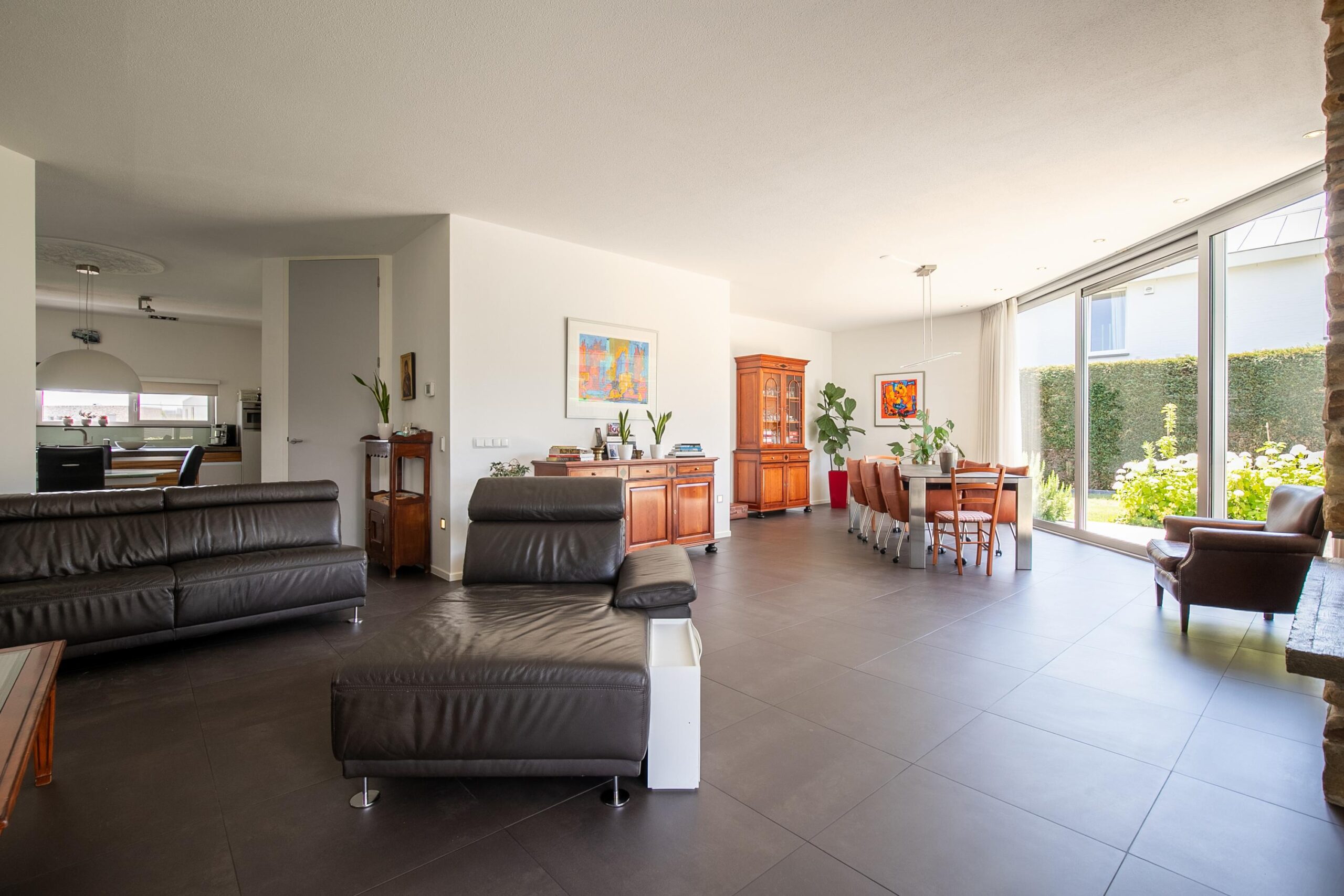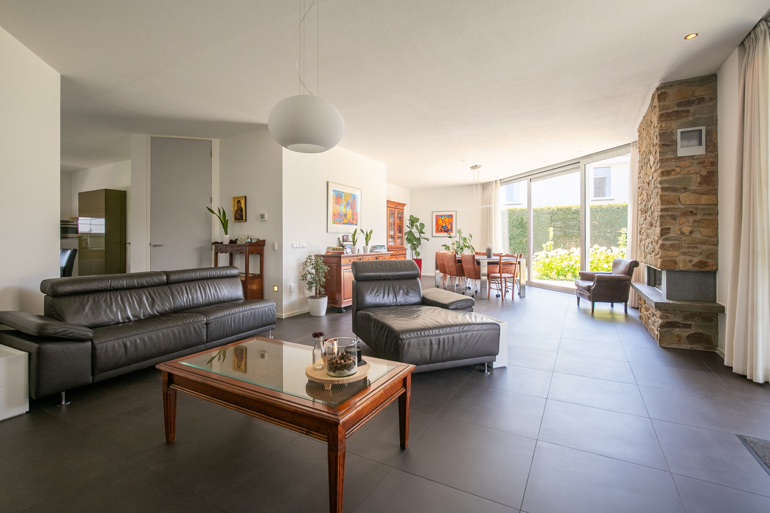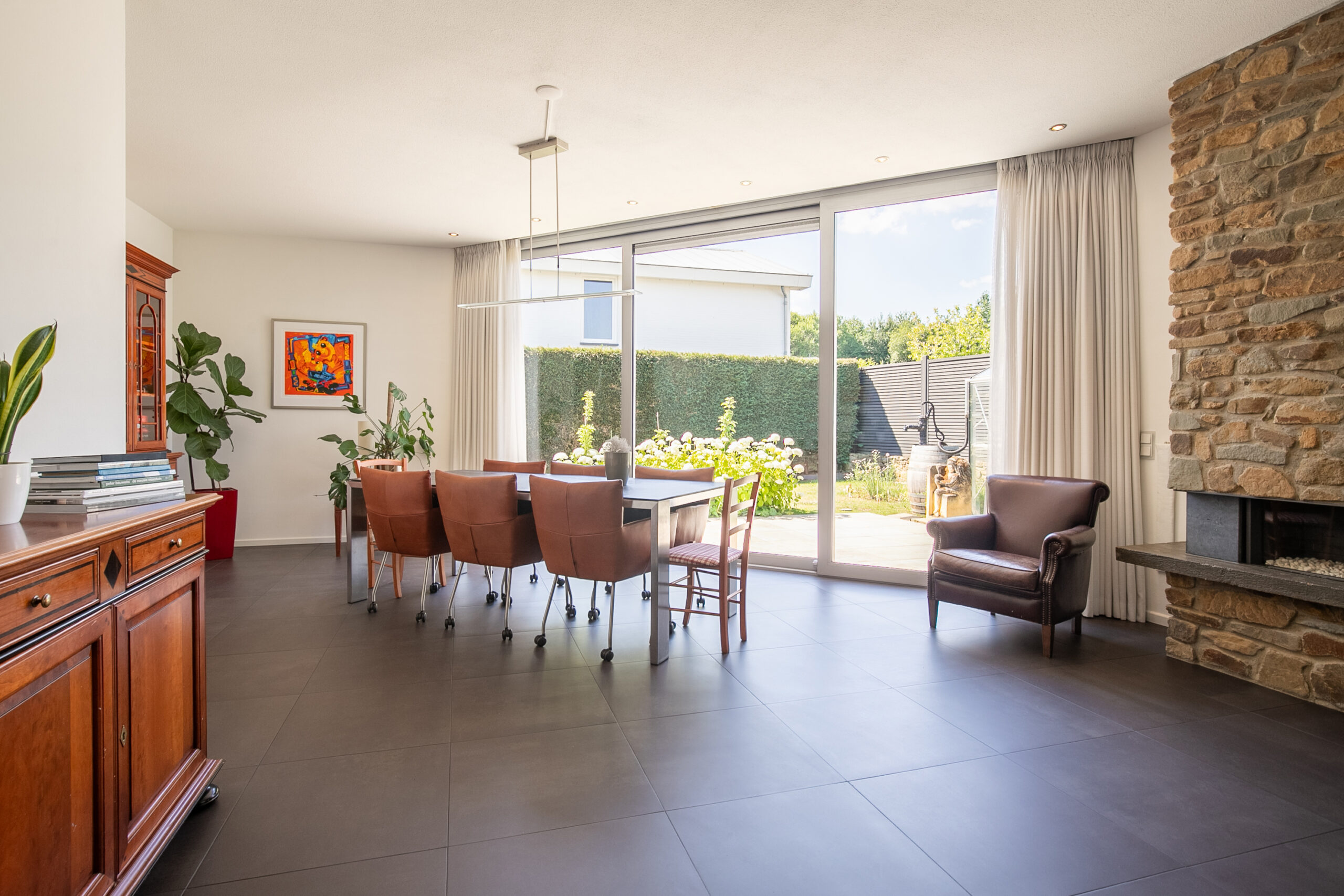 De ruimtelijke woonkamer is volledig gericht op de tuin en voorzien van grote raampartijen, een schuifpui naar het overdekte terras, een sfeervolle gashaard, inbouwspots en glad gestucte wanden. De indeling is speels en licht, met volop ruimte voor een royale zithoek en een grote eettafel aan beide zijden van de haard.
