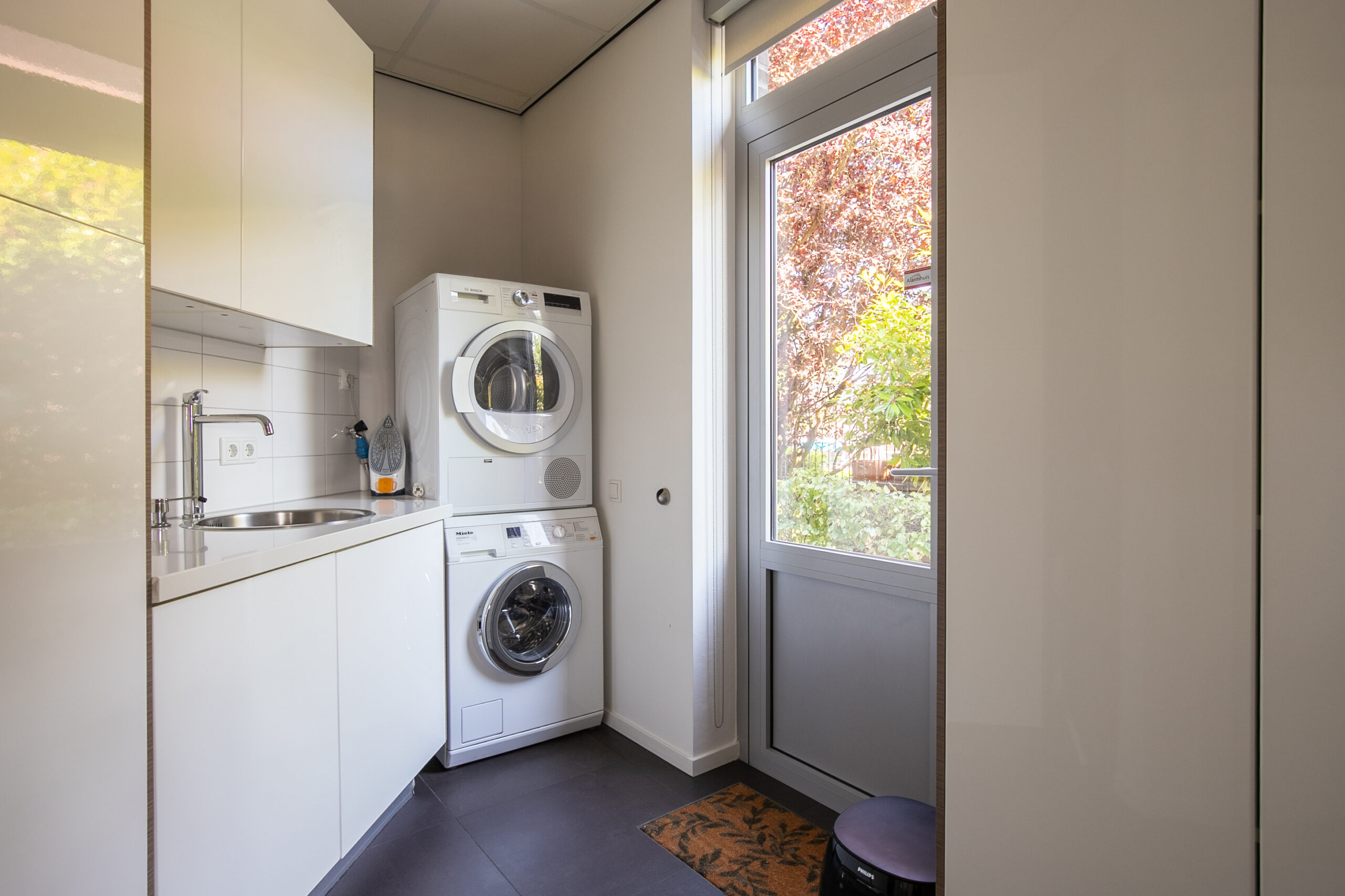 De bijkeuken, grenzend aan de keuken, is voorzien van een keukenblok met spoelbak en composiet werkblad, aansluitingen voor wasmachine en droger en biedt extra opbergruimte. Via deze ruimte heeft u toegang tot de zijkant van de woning.