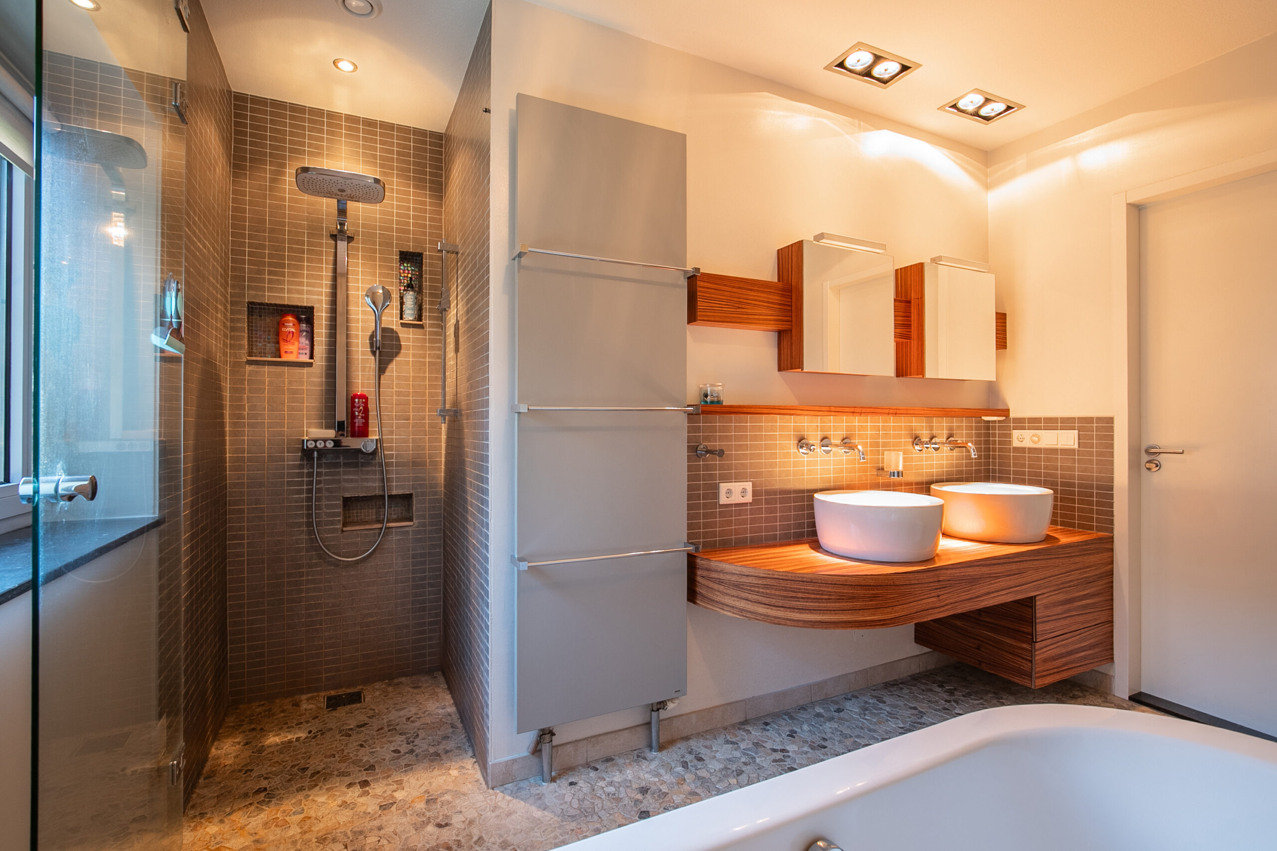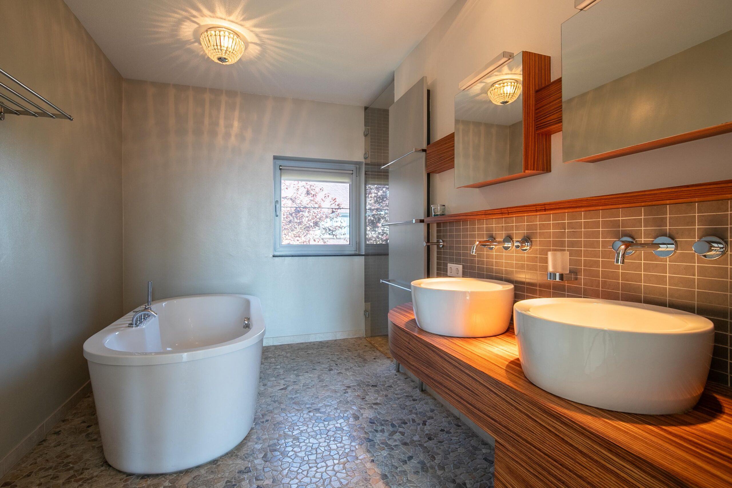 - Badkamervoorzieningen Ligbad, toilet, dubbele wastafel, wastafelmeubel, inloopdouche, toilet, douche, wastafel, wastafelmeubel