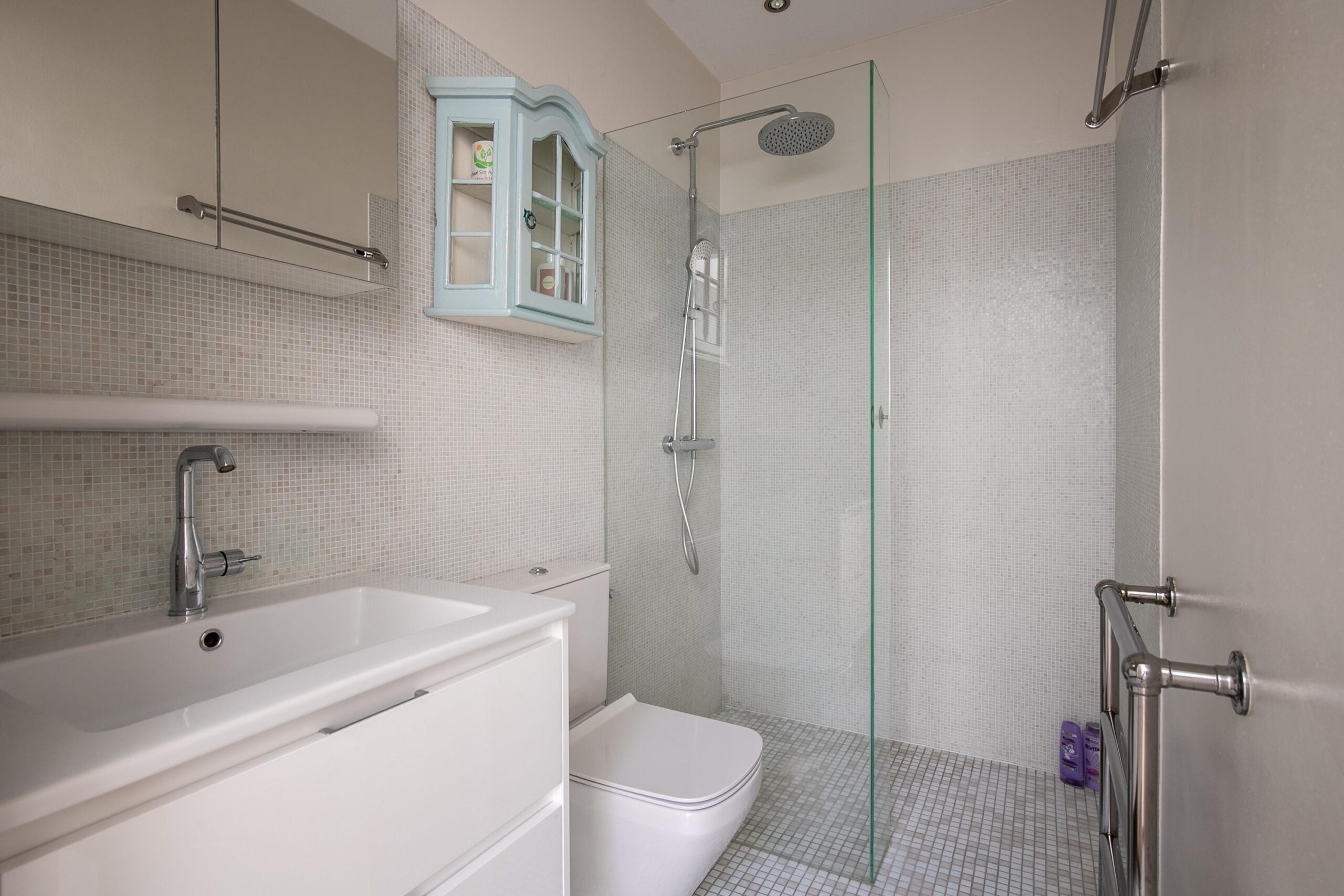 De tweede badkamer, bereikbaar vanaf de overloop, is eveneens compleet ingericht met een inloopdouche, wastafel en zwevend toilet – perfect voor gezinsleden of gasten.