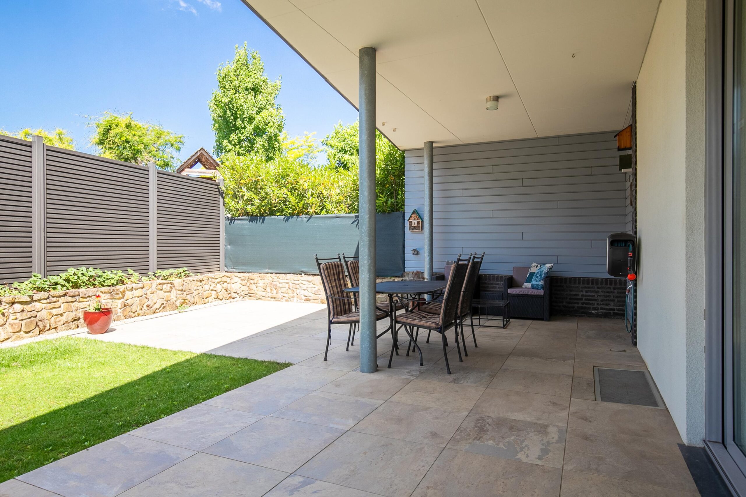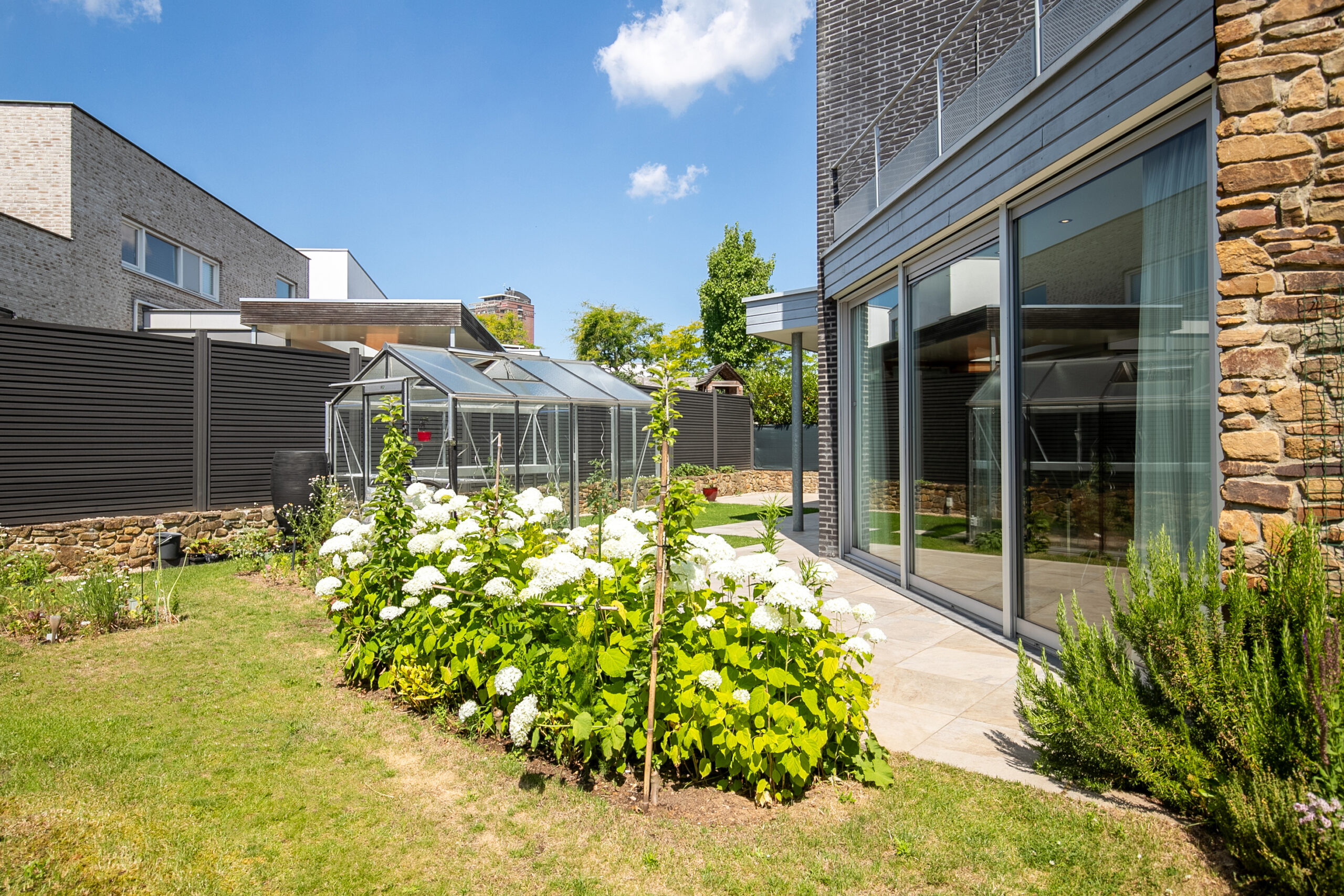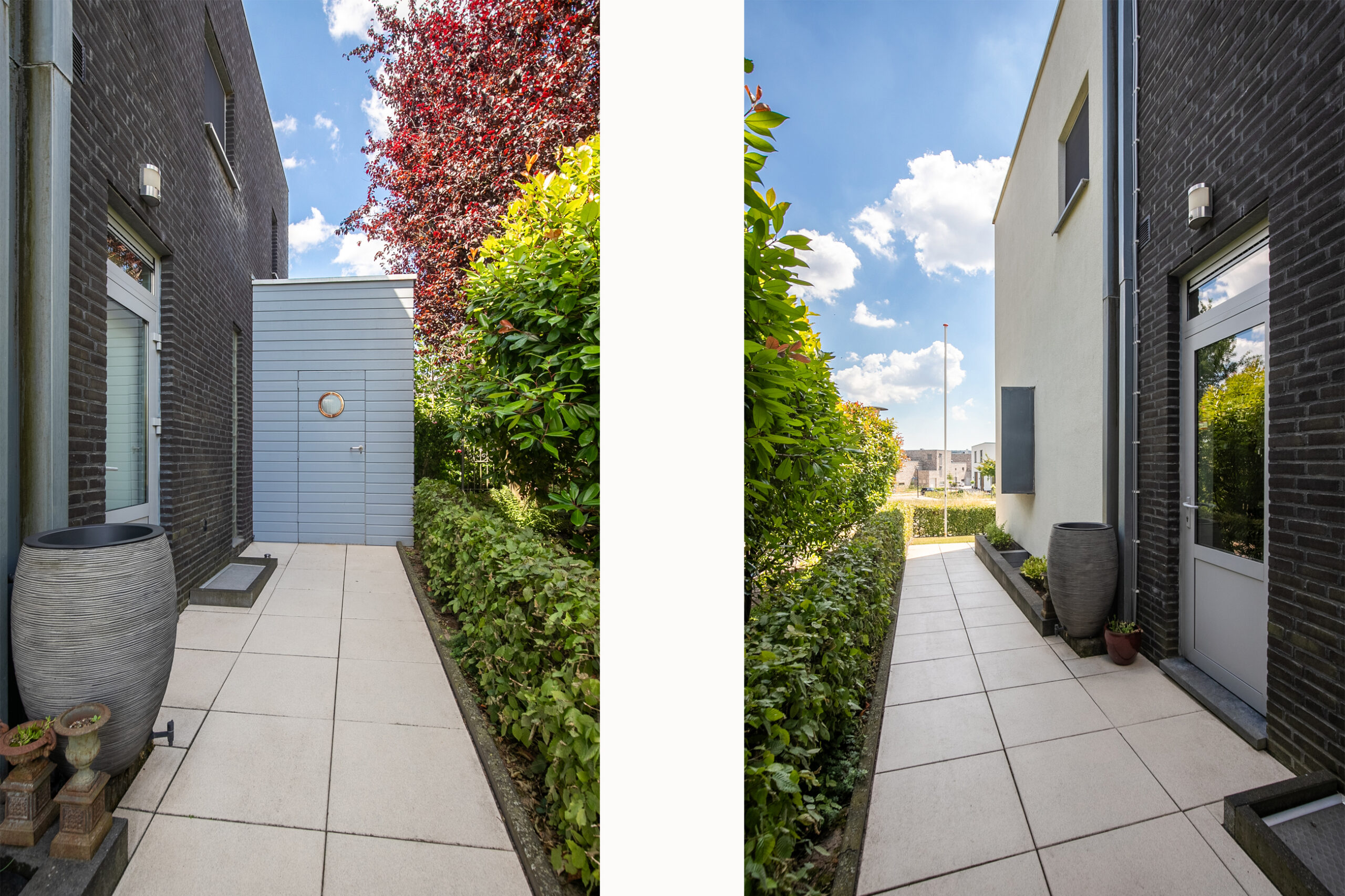 De achtertuin is volledig omsloten, zonnig gelegen en stijlvol aangelegd met grote betegelde terrassen, een groene haag en gazon. Direct grenzend aan de woonkamer ligt een overdekt terras, perfect voor lange zomeravonden. Verder is er een vrijstaande berging en een achterom aanwezig. De tuin biedt rust en ruimte – een plek om van te genieten in elk seizoen.