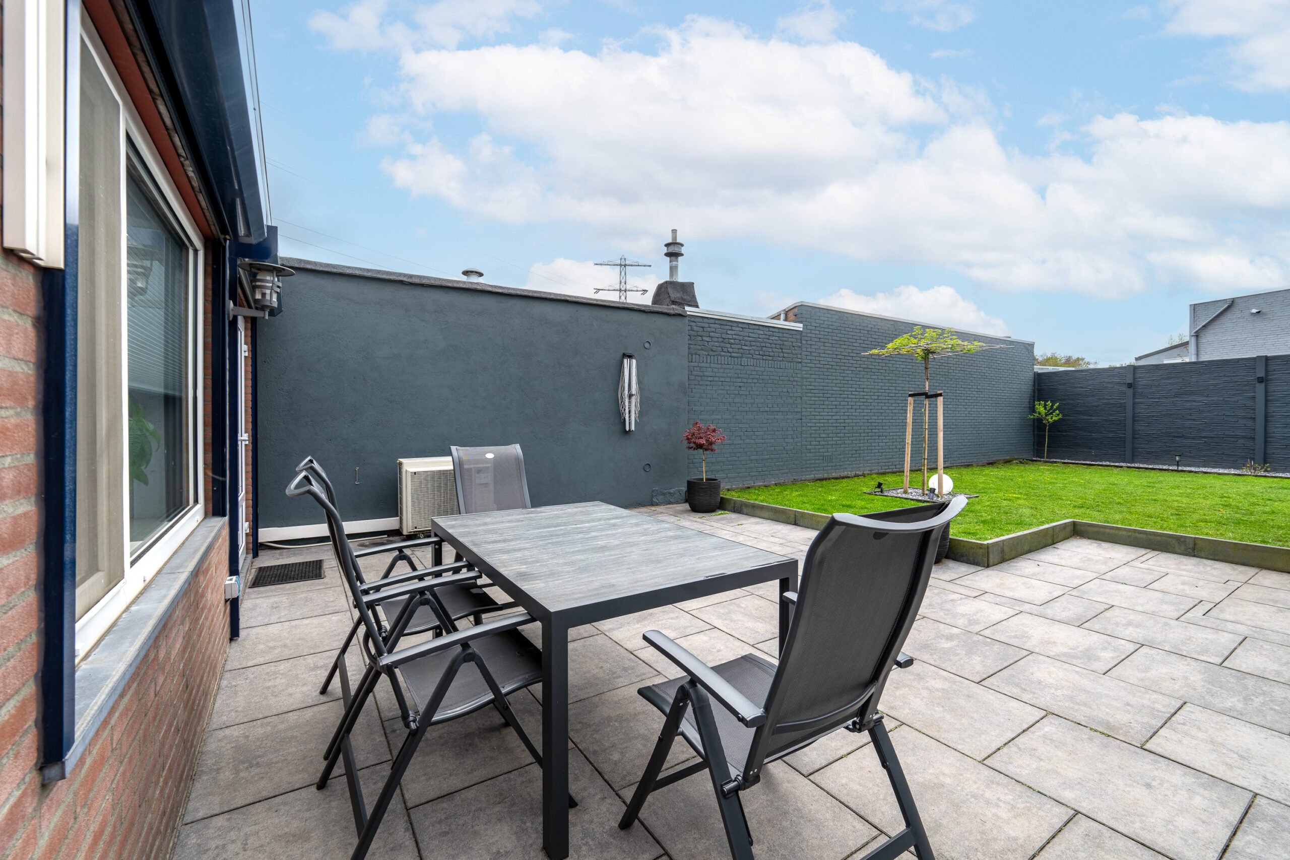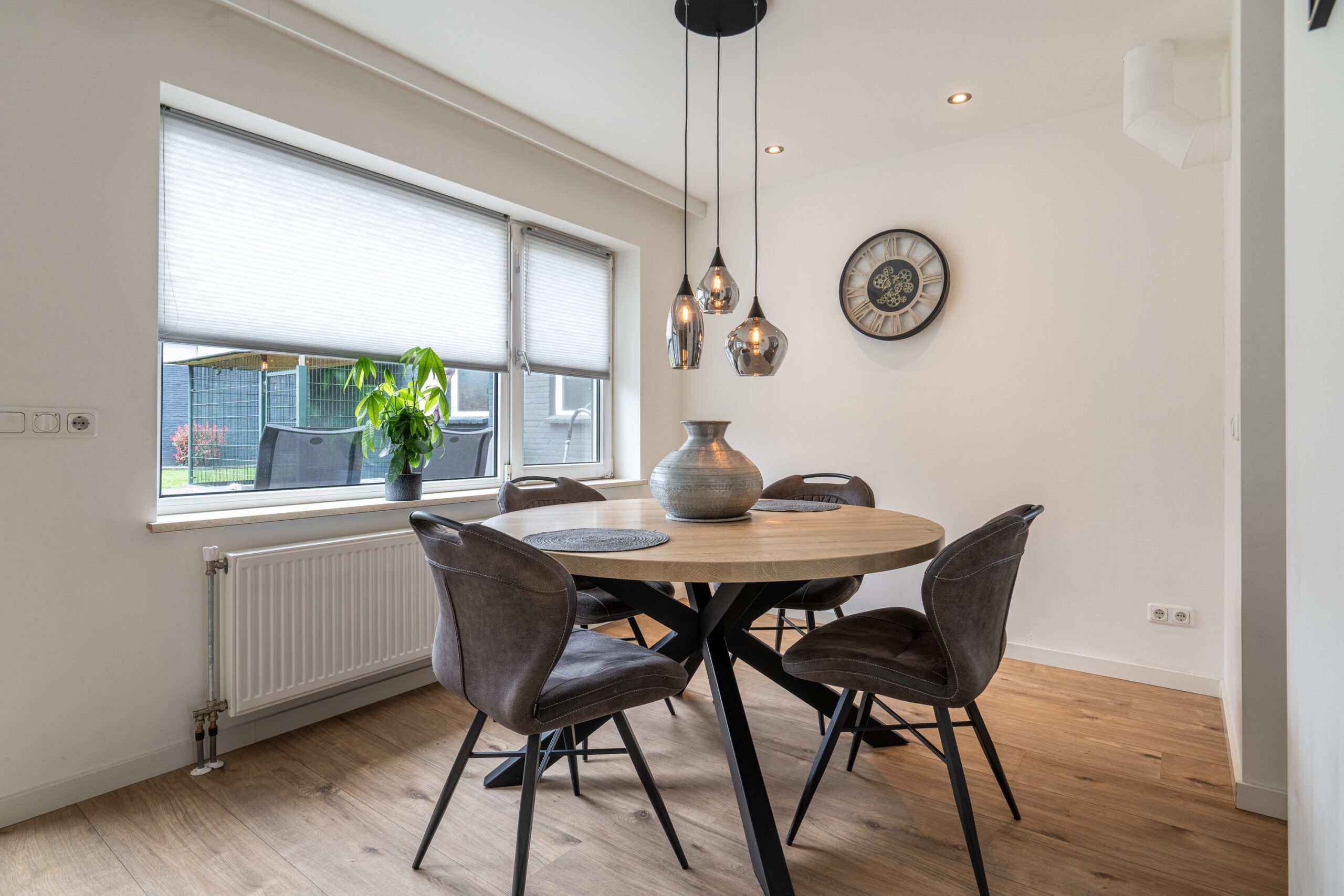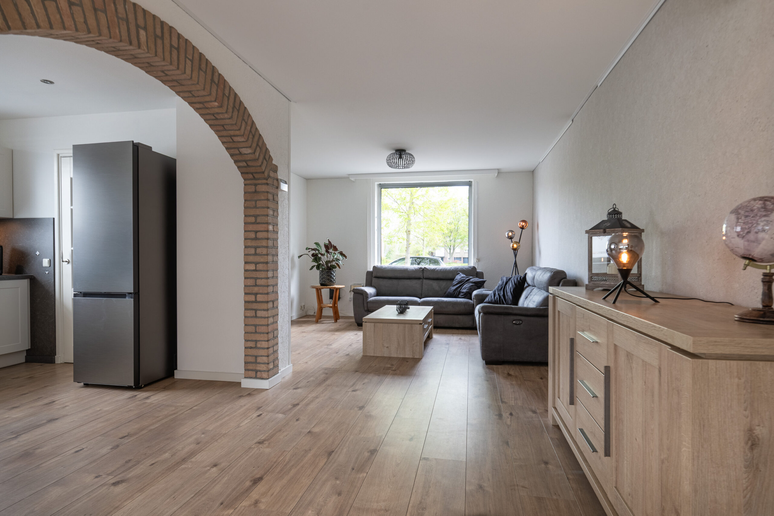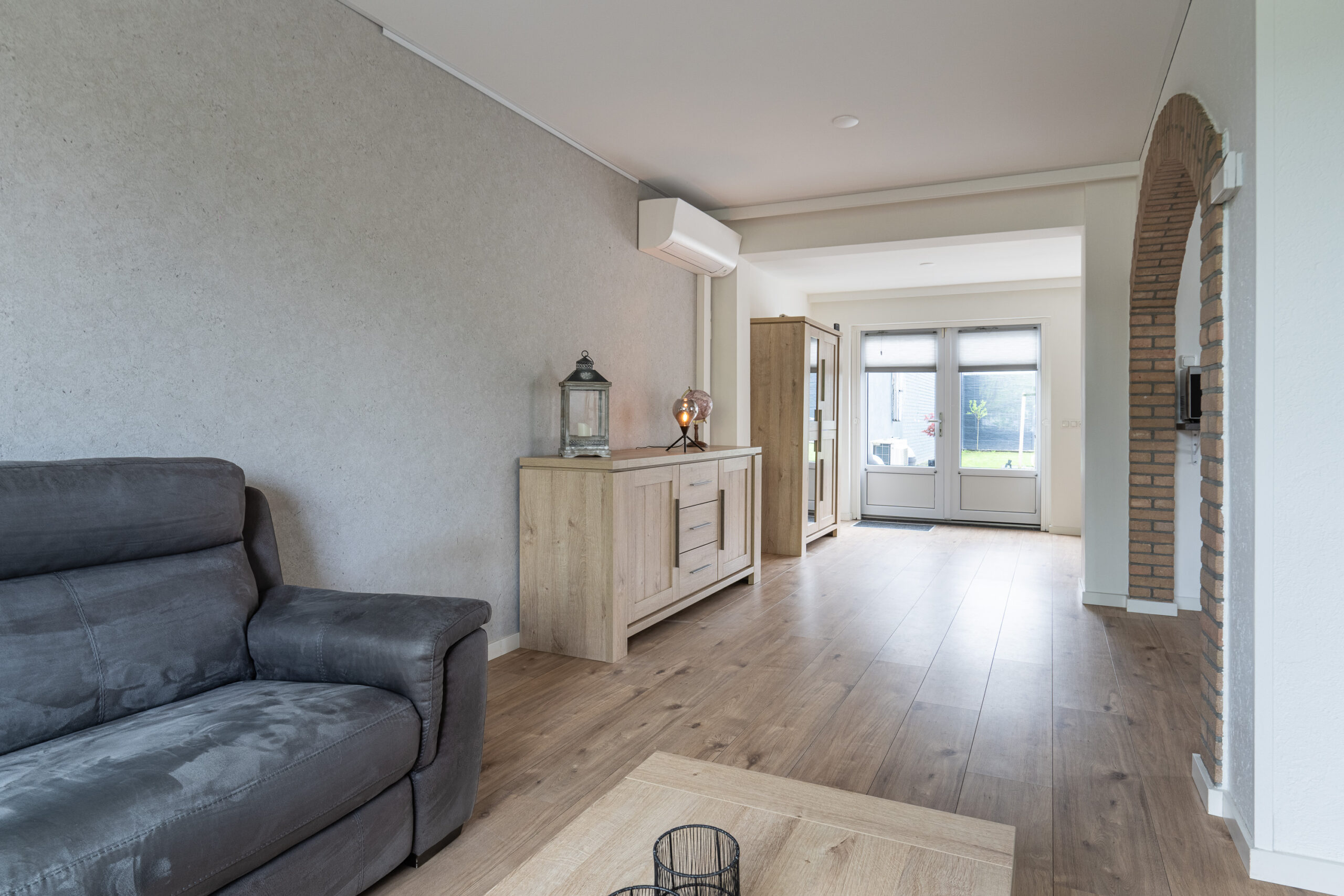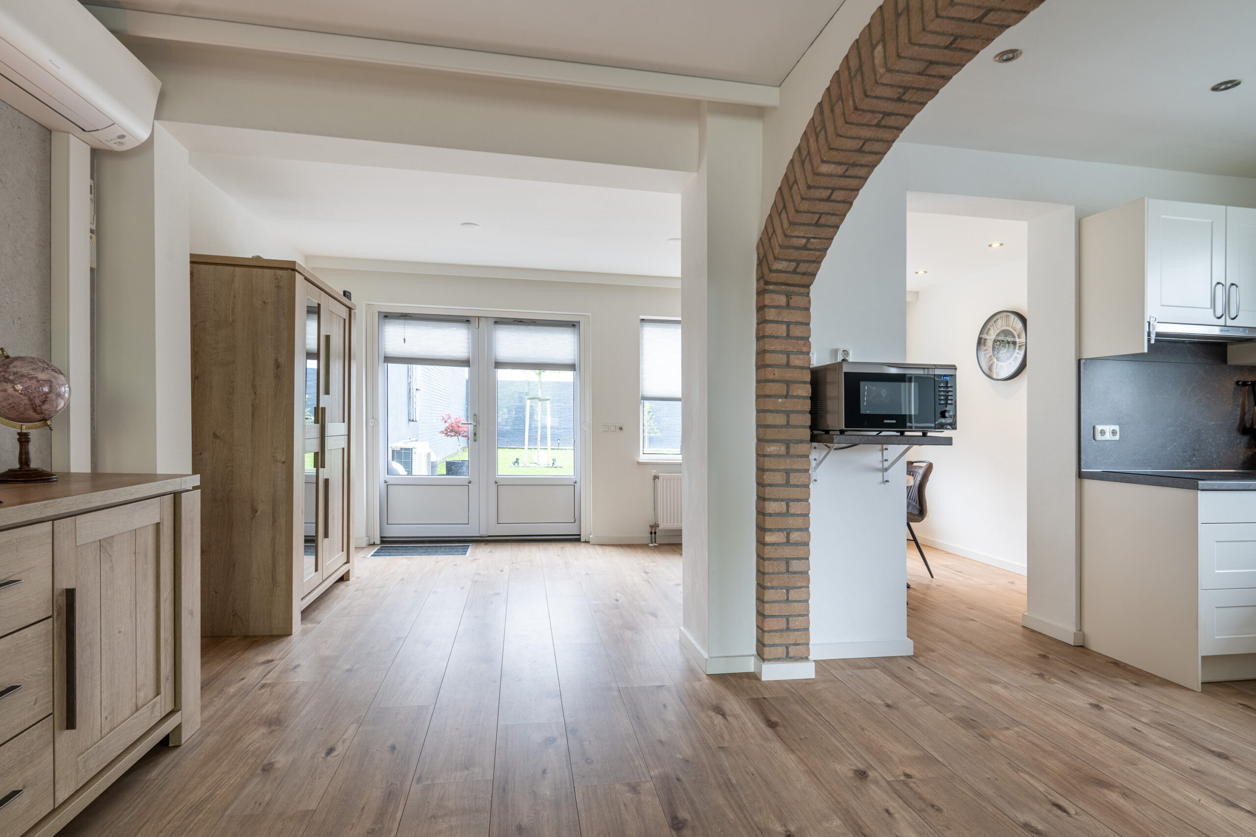 Ruime oprit met plaats voor het stallen van meerdere voertuigen. Entree/hal met trapopgang, meterkast en een toiletruimte met toilet en fontein. Vanuit de hal toegang tot zowel de woonkamer als de keuken. De woonkamer bevindt zich aan de voorzijde van de woning. De semi-open keuken is in een hoekopstelling geplaatst en voorzien van de navolgende inbouwapparatuur: inductiekookplaat, afzuigkap en vaatwasser. De begane grond kan gekoeld en verwarmd worden middels airconditioning. Aan de achterzijde bevindt zich een royale aanbouw met openslaande deuren (voorzien van horren) naar de tuin. De gehele begane grond is afgewerkt met een eiken design laminaatvloer en grotendeels voorzien van elektrisch bedienbare rolluiken. De recent aangelegde achtertuin is zonnig gelegen, volledig omsloten en biedt optimale privacy. Het royale terras en elektrisch bedienbaar zonnescherm zorgen voor optimaal tuingenot tijdens zomerse dagen. Dubbele garage met elektrische sectionaalpoort en hondenkennel. De tuin is via een achterom te bereiken.