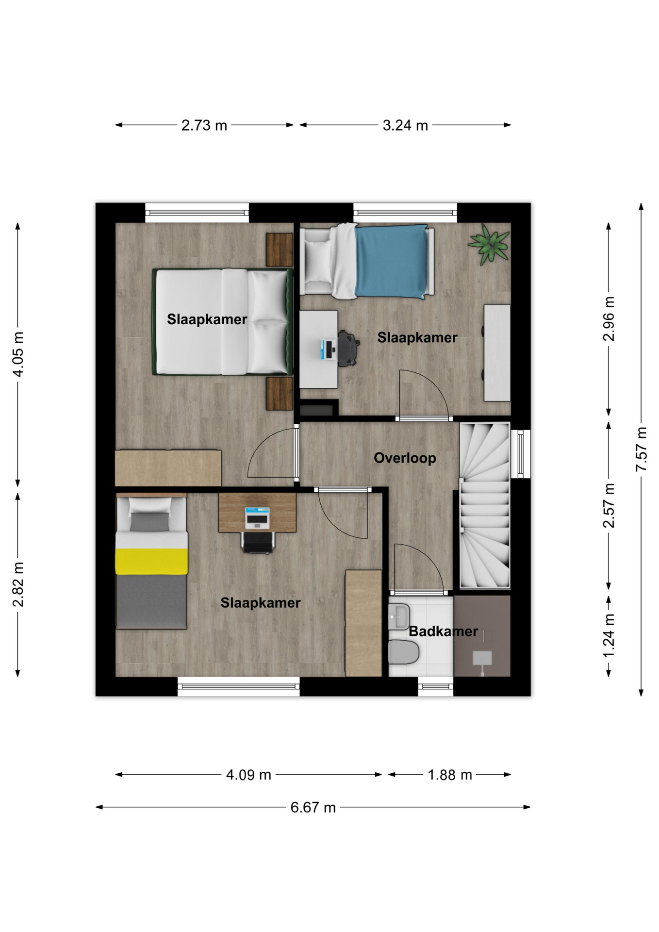 Overloop met toegang tot drie slaapkamers en badkamer. De twee grootste slaapkamers zijn voorzien van airconditioning. Alle slaapkamers zijn voorzien van strak gestucte wanden, laminaatvloeren en rolluiken. De betegelde badkamer is aan de voorzijde gelegen en voorzien van een royale douche, tweede toilet en wastafel.